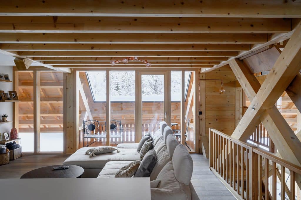 Les je v hiši protagonist. Lesene so stene, okna in vrata, stopnice, podeskan strop … Vidni strešni nosilci, ki nosijo kot da predimenzionirano streho, pa v prostoru, v katerem skorajda ni klasičnih sten, ustvarjajo pregrade, ločujejo prostore, nosijo stopnice in ustvarjajo posebno, alpsko vzdušje.
