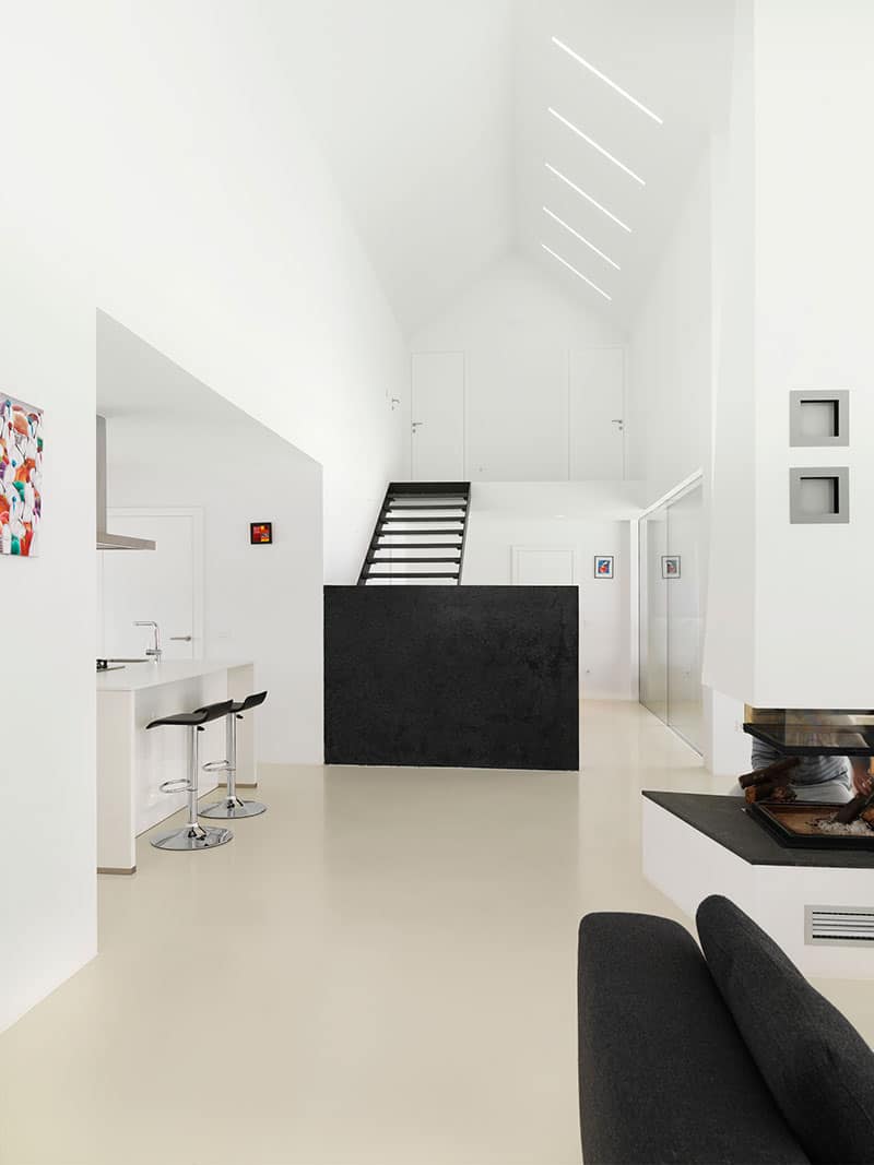 Dinamična hiša za mlado družino je navznoter – kljub svoji monokromatski paleti – še bolj divja kot navzven. Zalomi strehe, velik, iz strehe spuščen dimnik, kuhinjska niša in skulpturalne stopnice nudijo vizualne poudarke in drobijo odprti tloris na več privlačnih ambientov.