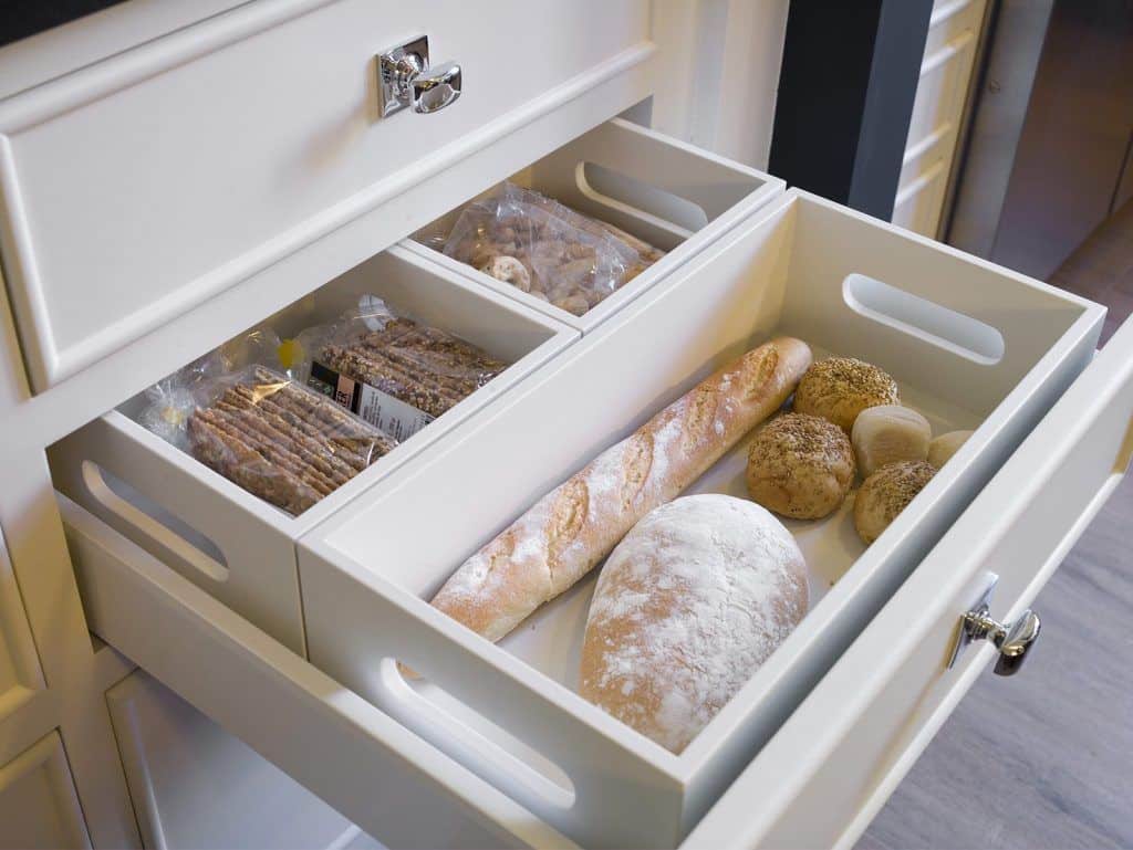 Ko načrtujete novo kuhinjo, se lahko odločite za poseben predal za kruh. Predal se zapira tako, da vanje vdira zrak, pogosto je opremljen tudi z desko za rezanje. Takšen predel naj bo umeščen tik pod delovno površino in v bližini mesta, kjer po navadi pripravljate obroke. Pomembno je tudi, da predal redno pregledujete in da iz njega sproti praznite ostanke starega kruha.