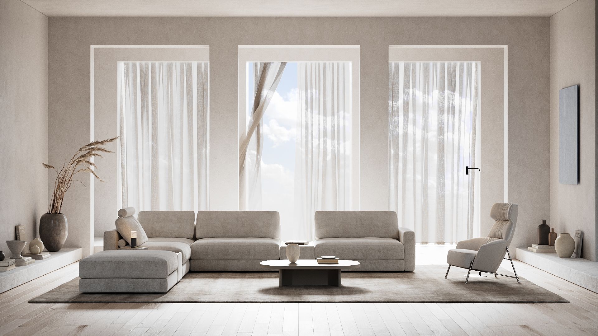 - Zemeljski odtenki za več globine: Topli bež toni, glina, olivno zelena ali nežna siva dodajo prostoru karakter, ne da bi porušili njegovo ravnovesje. Cloud Dancer ob njih deluje kot nevtralno ozadje.