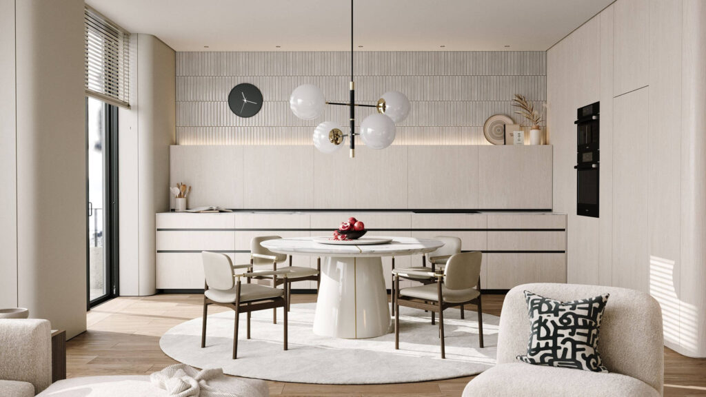 - Kuhinja in kopalnica brez sterilnosti: Na kuhinjskih frontah, keramiki ali večjih kopalniških površinah Cloud Dancer deluje čisto, a ne hladno. V kombinaciji z mat površinami, kamnom ali lesom ustvarja zelo uravnotežen in trajen videz.