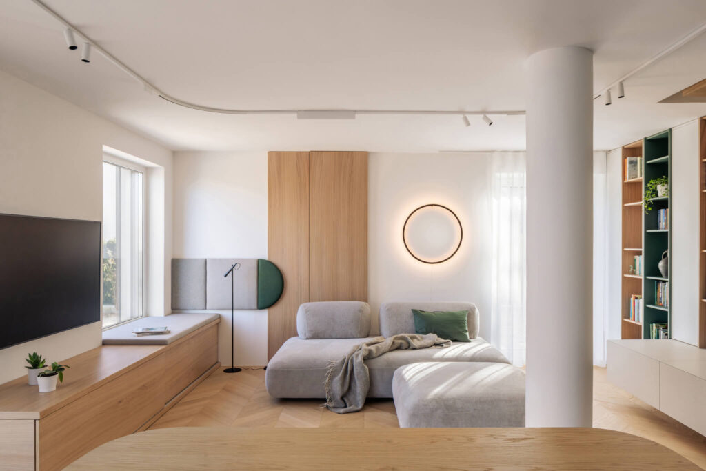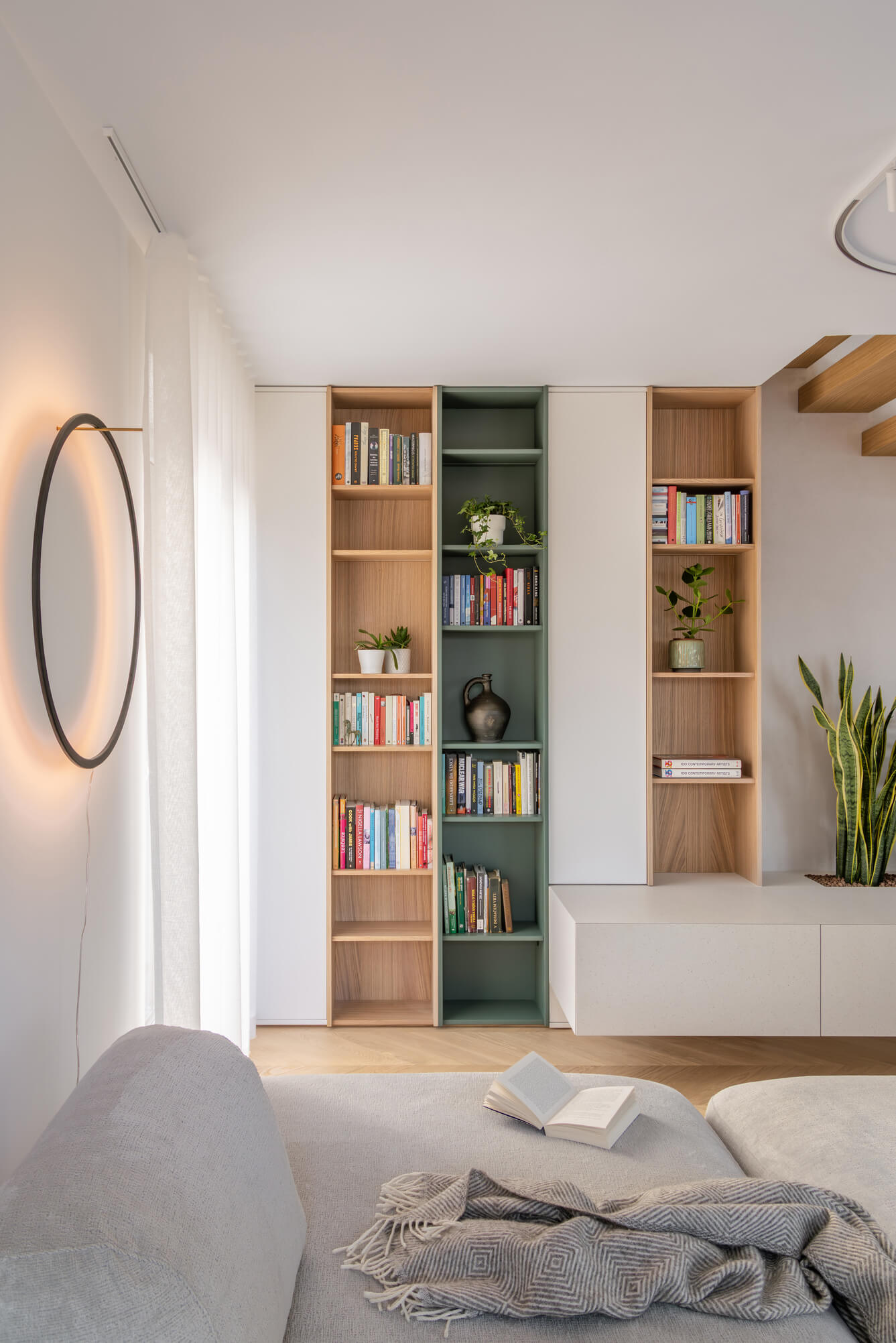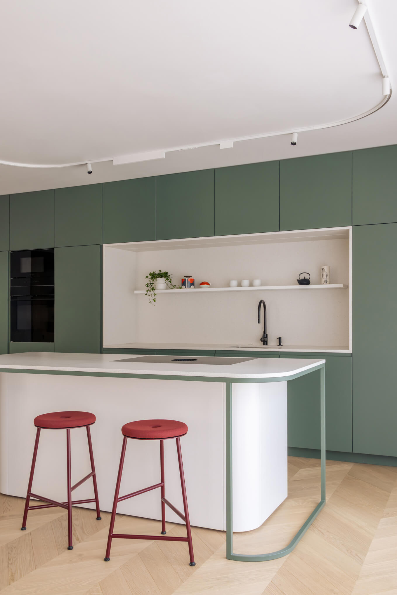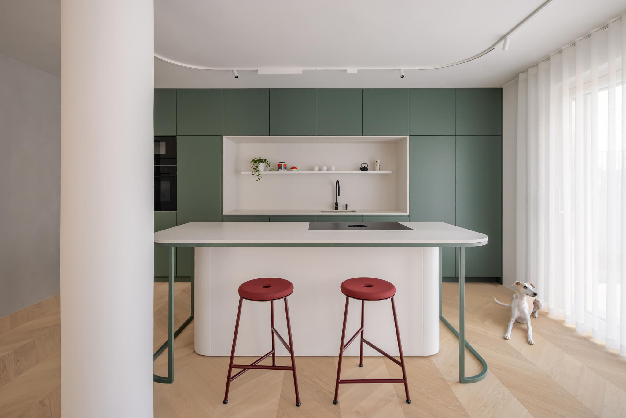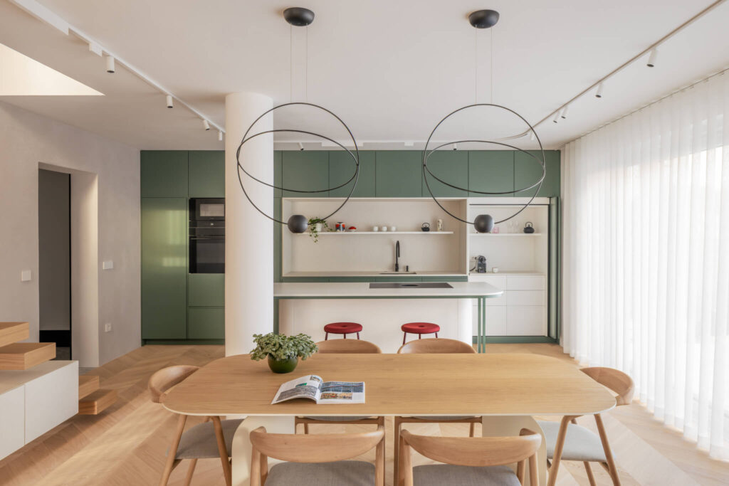 Jedilnica v naravnih tonih stoji v središču prostora, kuhinja pa izstopa z umirjenim zelenim odtenkom front. Kuhinjski otok je oblikovan neklasično, z izrazitim kovinskim okvirjem, ki mu daje lahkotnost in grafično ostrino. Ob oknu se niz omar zaključi s sedalno nišo – intimnim kotičkom, ki predstavlja podaljšek dnevne sobe in odpira pogled proti zunanjosti.