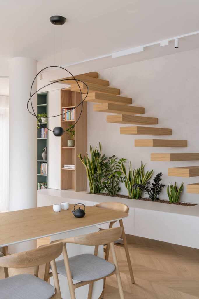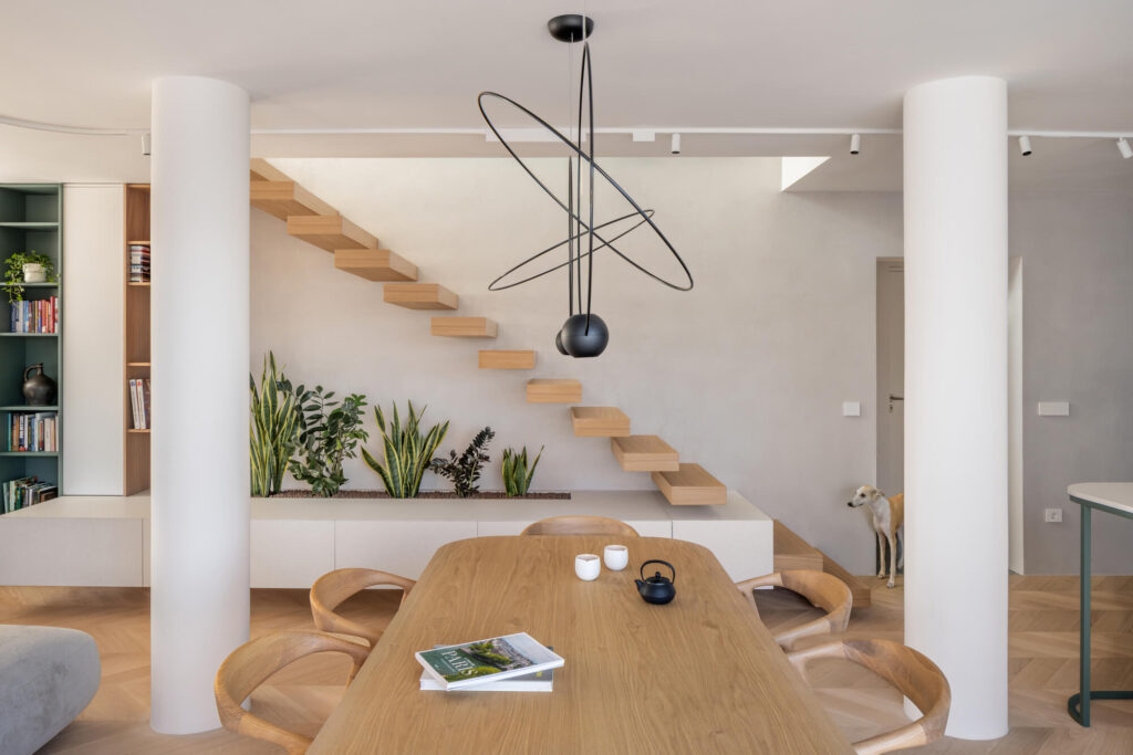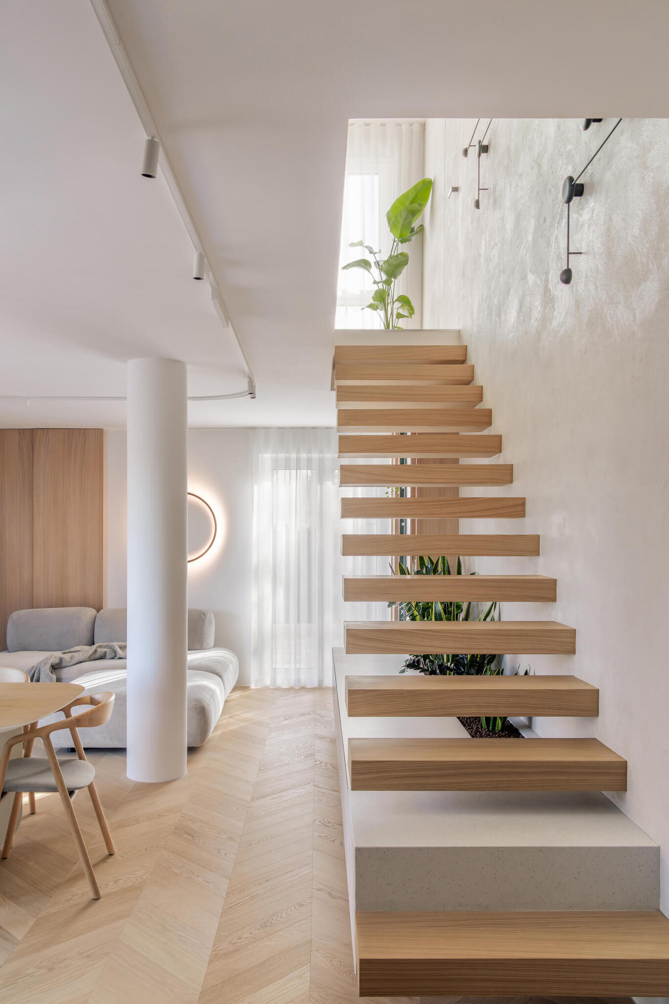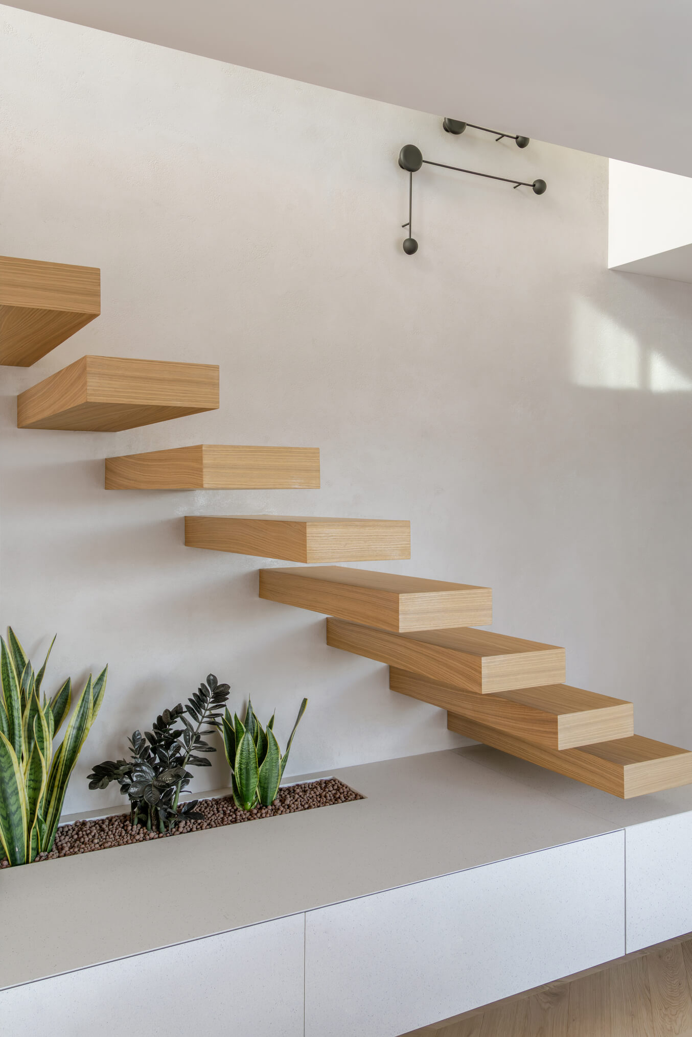 Spodnje nadstropje je skoraj v celoti namenjeno bivalnemu prostoru. Vstopni del, manjša kopalnica in tehnični prostor so zadržani ob robu, osrednji del pa se odpira v enoten ambient kuhinje, jedilnice in dnevne sobe. Glavni poudarek prostora so lebdeče, konzolne stopnice, ki delujejo kot skulpturalen element interjerja. Pod njimi je umeščen večnamenski podest iz kvarca, ki v sebi skriva shranjevalne predale, ob oknu pa se zaključi s knjižnimi policami in integriranim koritom za rastline. Ta poteza mehko poveže arhitekturo z naravo in v prostor vnese organsko dinamiko.