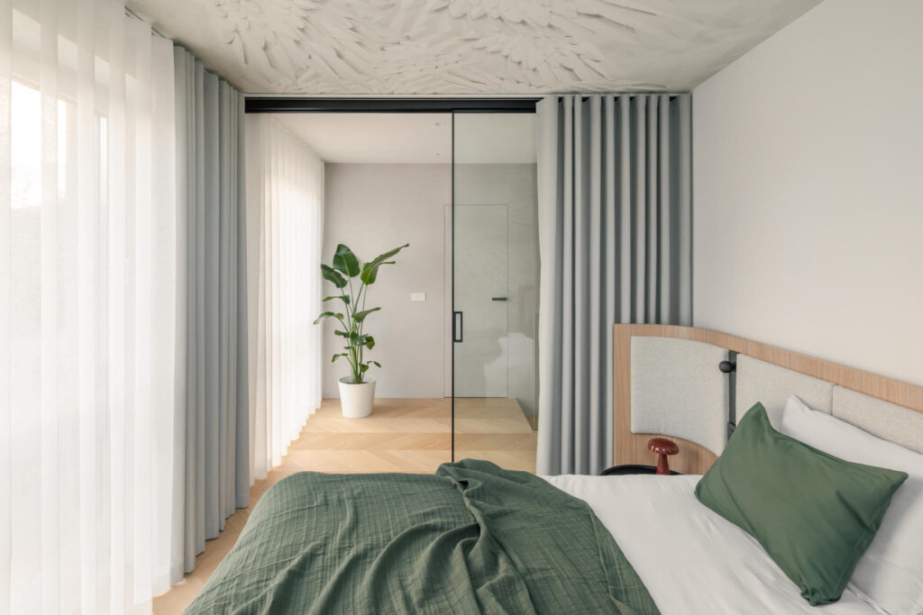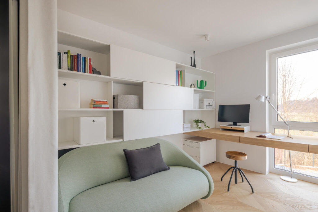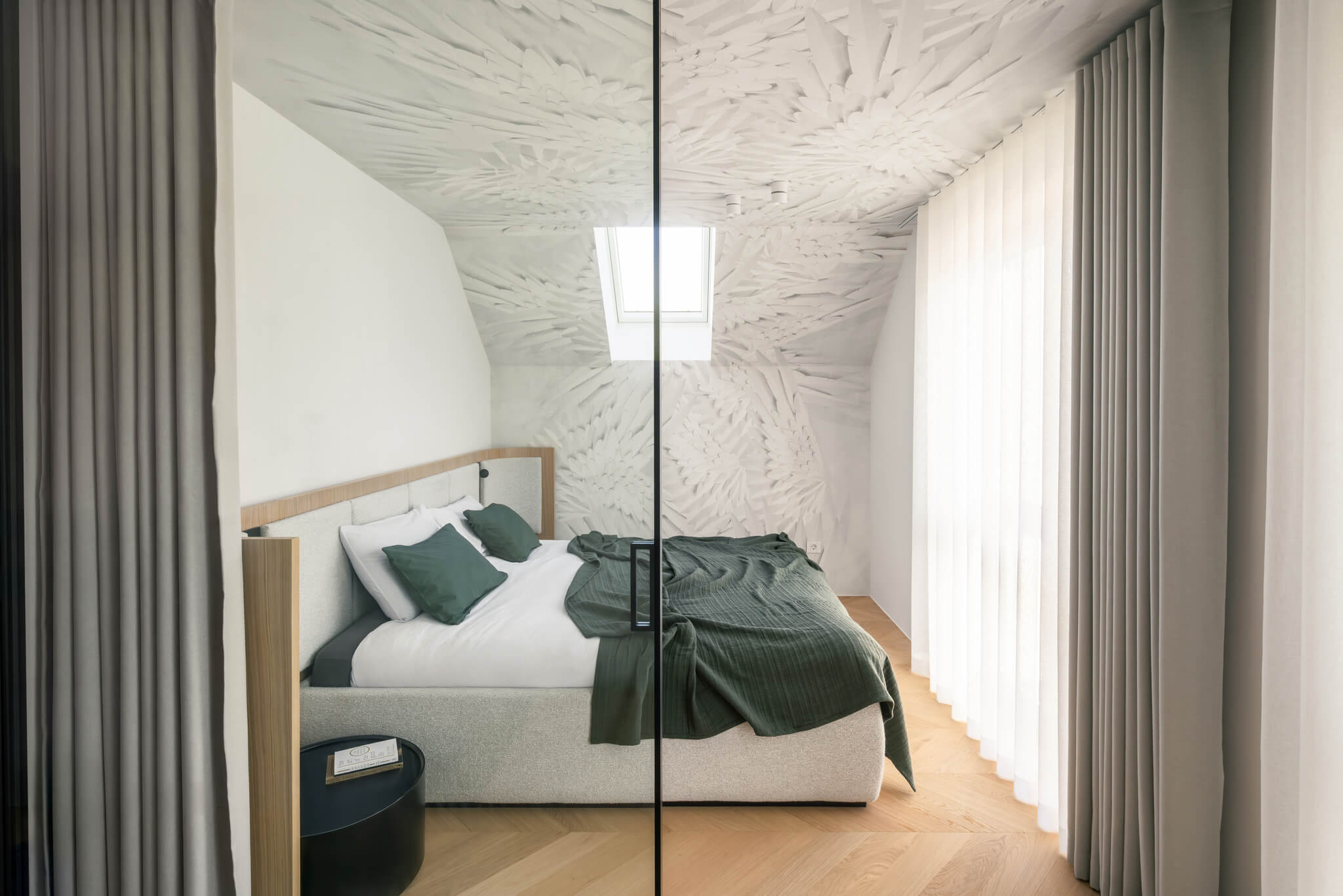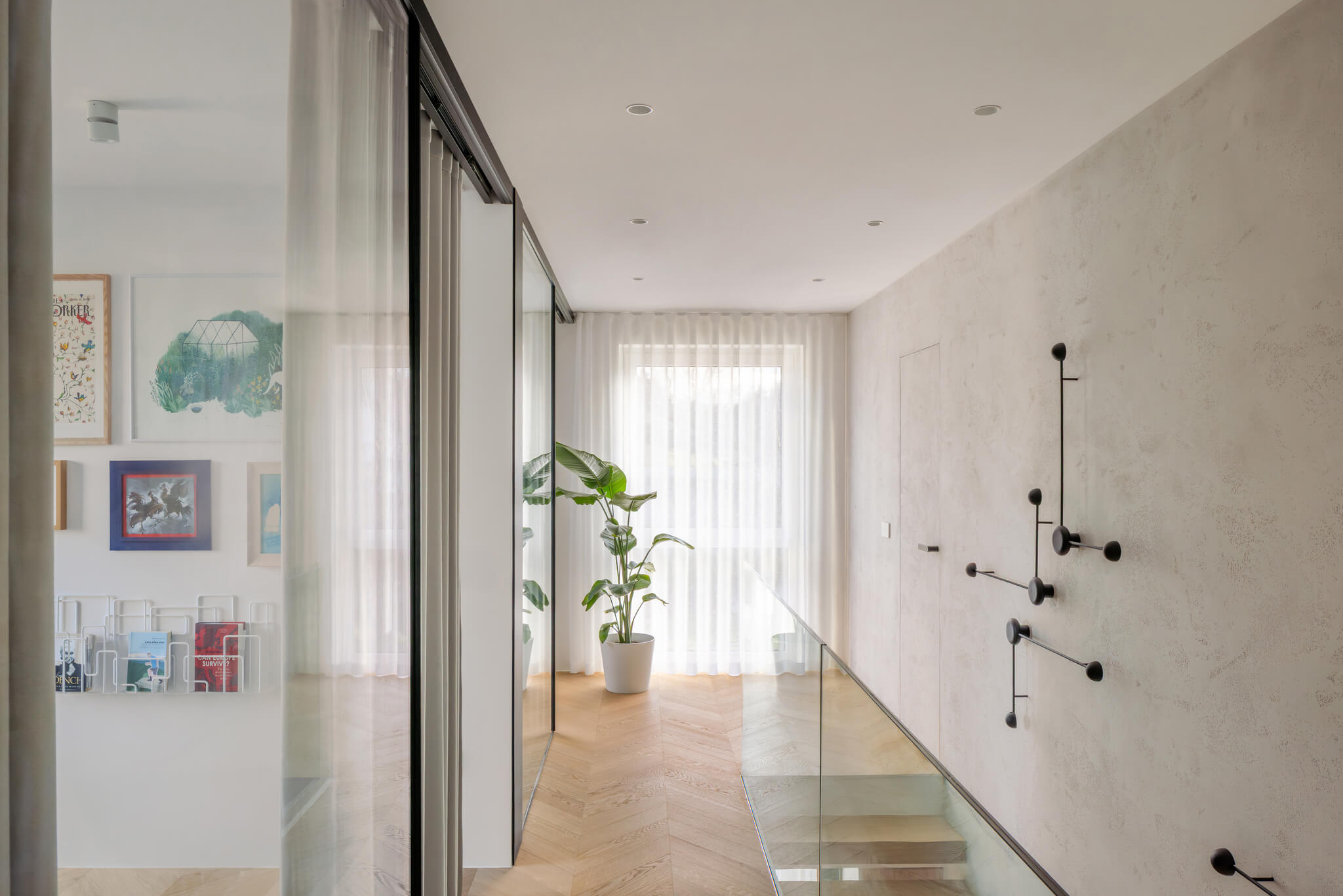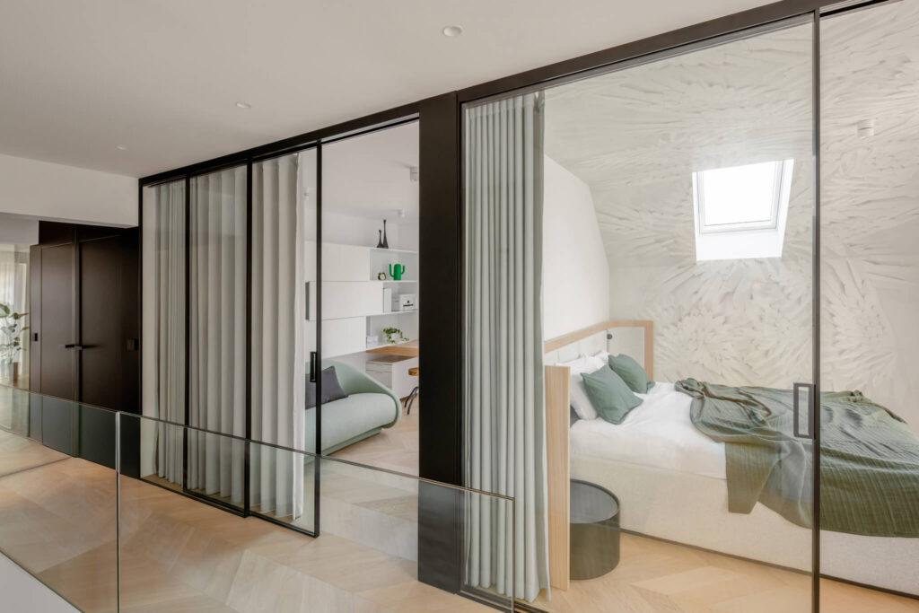 Tudi mansarda je zasnovana odprto in povezano. Spalnica in delovna soba, ki lahko služi tudi kot soba za goste, sta ločeni s stekleno steno in drsnimi vrati. Takšna rešitev omogoča, da svetloba prodre globlje v hodnik in da prostori med seboj ostanejo vizualno povezani. Hkrati je mogoče z zavesami ustvariti popolno zasebnost.