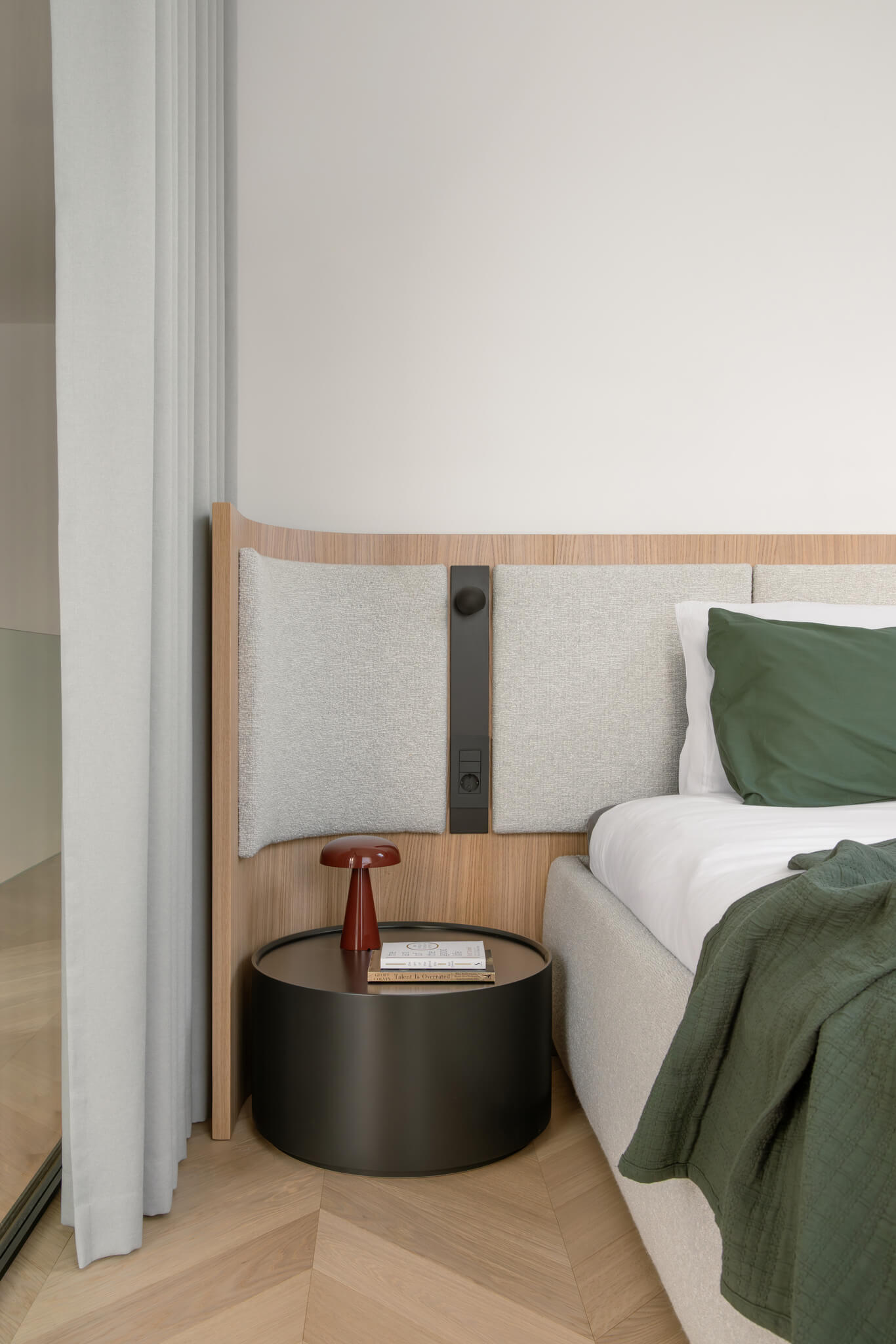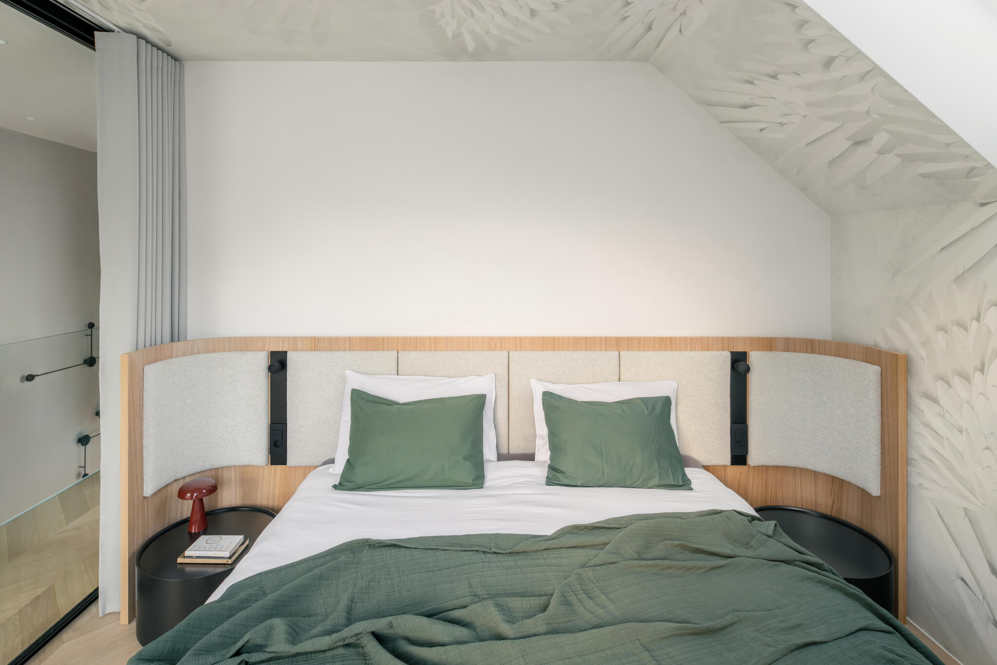 Spalnica izstopa z izrazito tapeto z motivom angelskih kril, ki prekriva steno in strop ter mehko ublaži poševnino. Element deluje kot zaščitni objem in prostoru doda subtilno simboliko. Zaobljeno leseno vzglavje postelje v kombinaciji z oblazinjenim delom poudari občutek topline, zavese pa omogočajo, da spalni del po potrebi popolnoma zastremo.