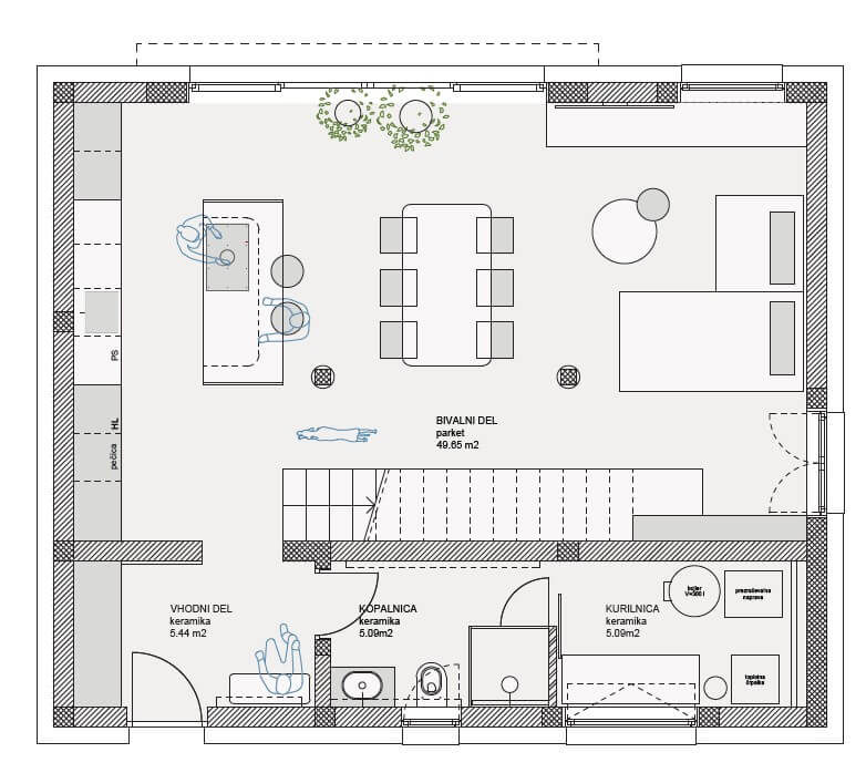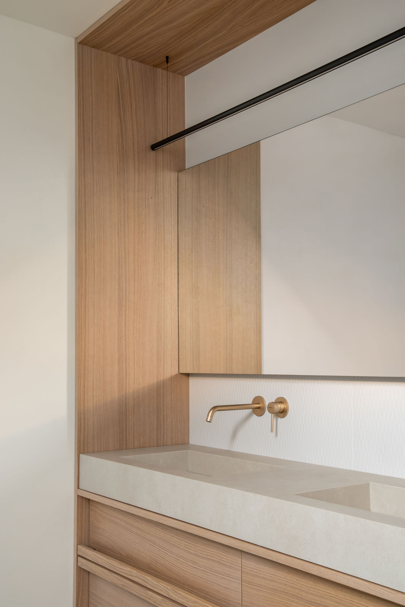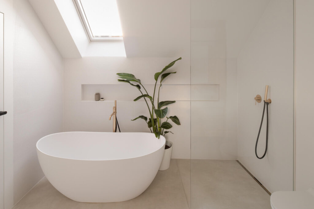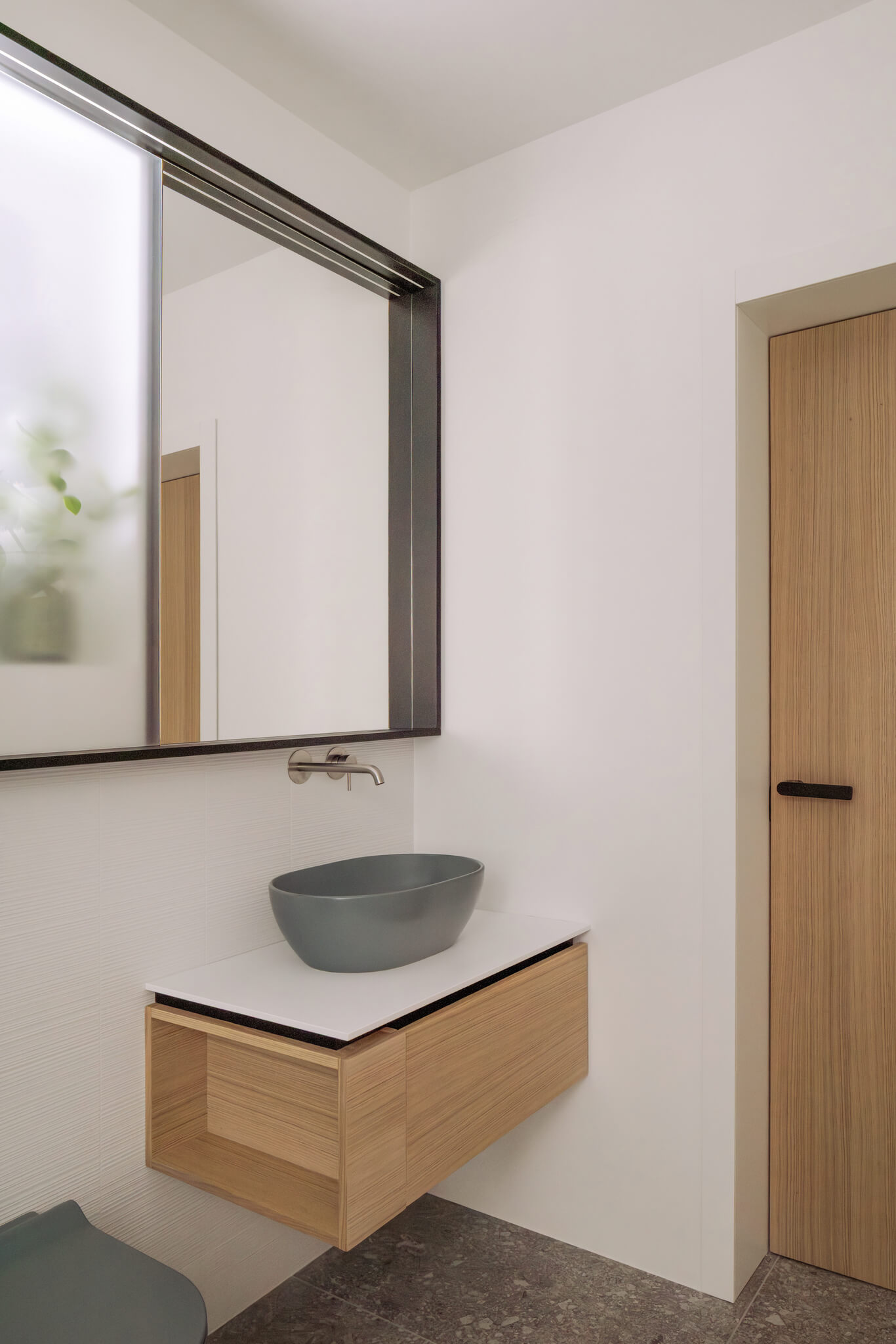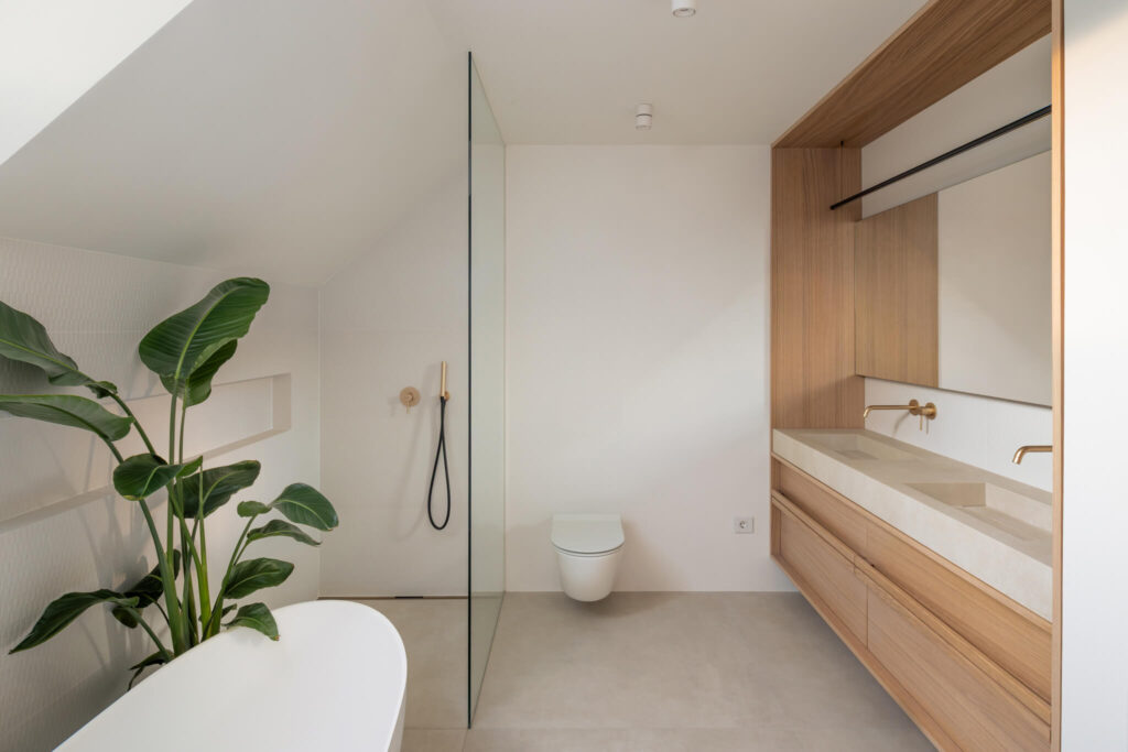 V kopalnici je prostor organiziran premišljeno: prostostoječa kad in tuš tvorita osrednji element, umivalniški niz pa je umeščen v nišo, ki jo vizualno in funkcionalno v celoti zapolnjuje.