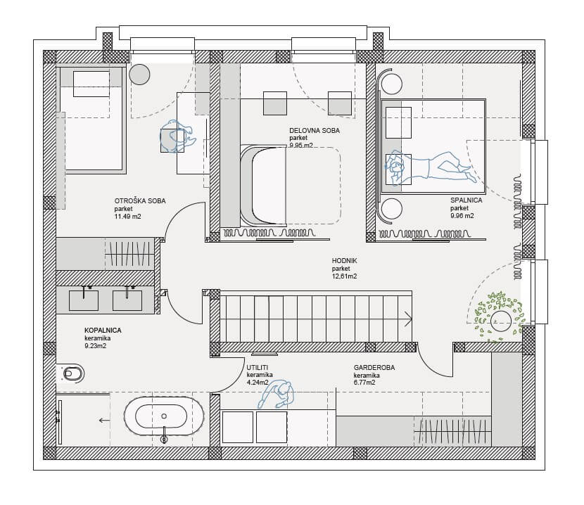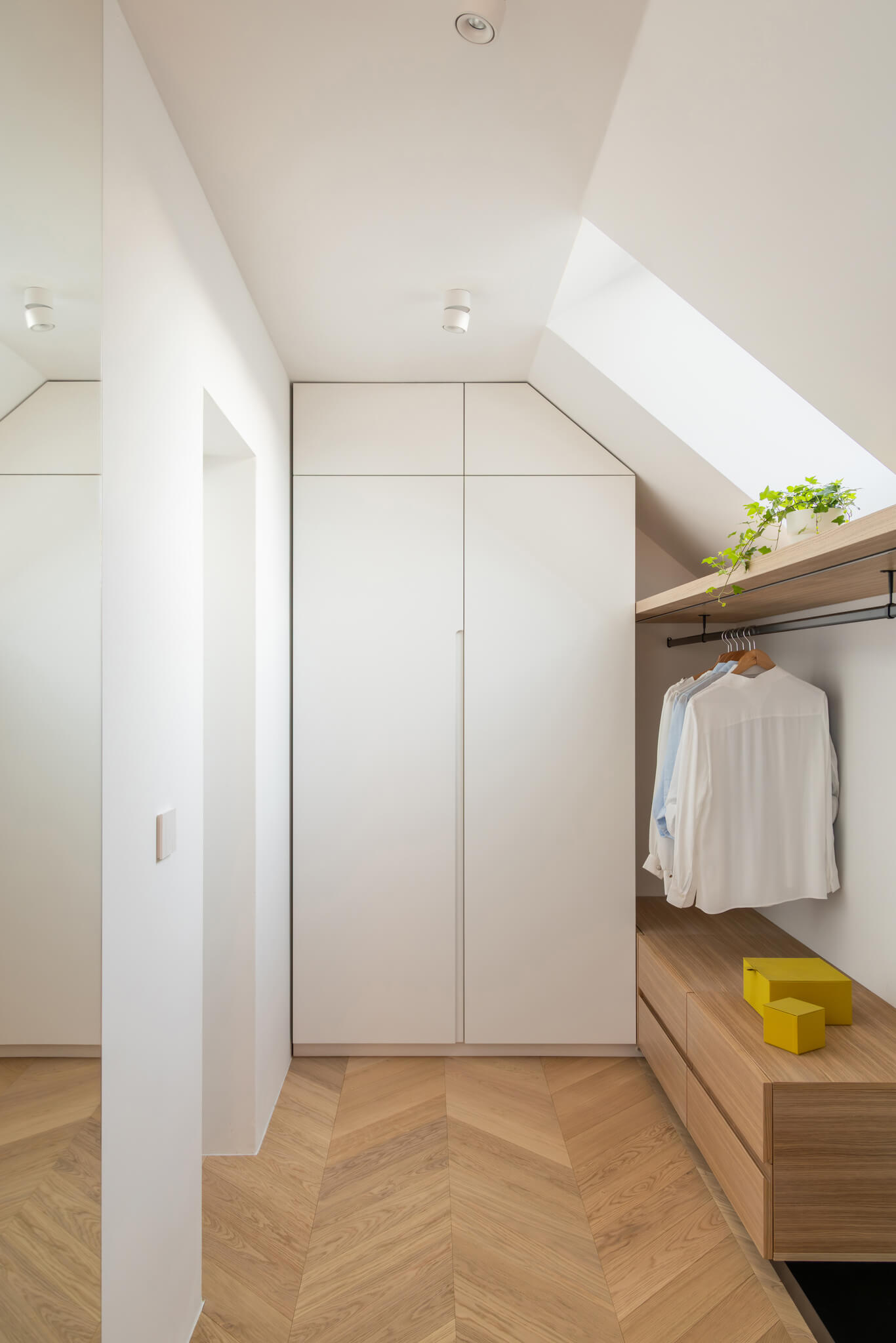Posebnost tlorisa predstavlja t. i. krožni promet, kjer se garderoba, utility in kopalnica funkcionalno povezujejo v logično zaporedje. Mansardna poševnina je tu že izrazitejša, a jo arhitektka izkoristi kot prednost. Strešna okna v prostor prinašajo obilico naravne svetlobe, zato prostori kljub nižjim višinam delujejo svetlo in zračno.