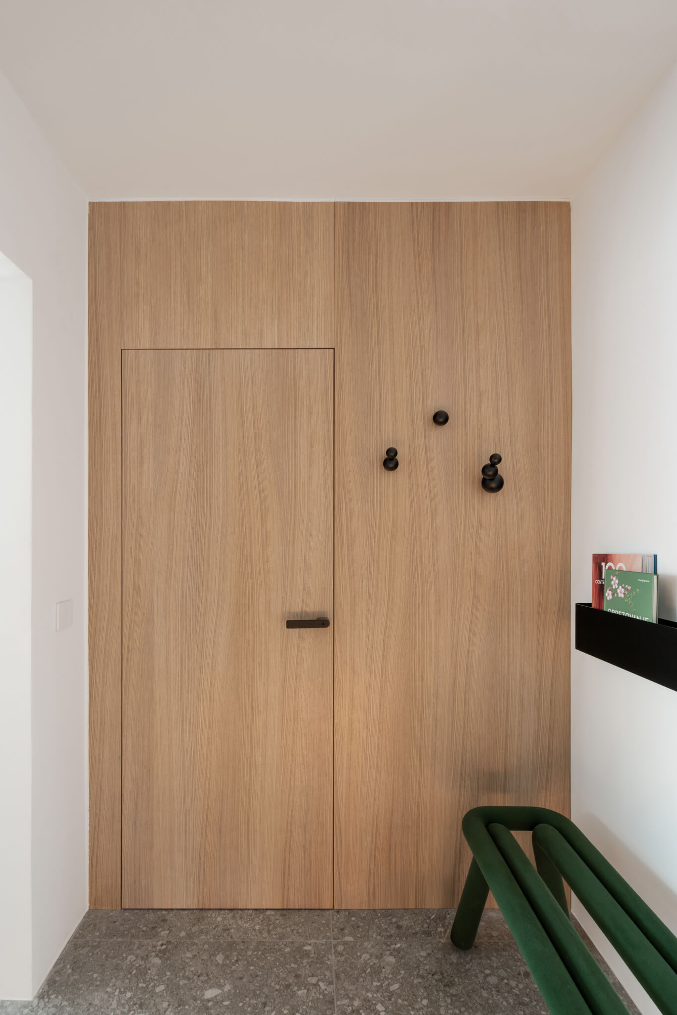 Materialna paleta je zadržana in naravna: svetel hrast, bela in različni zeleni poudarki ustvarjajo umirjeno, a prepoznavno identiteto doma.