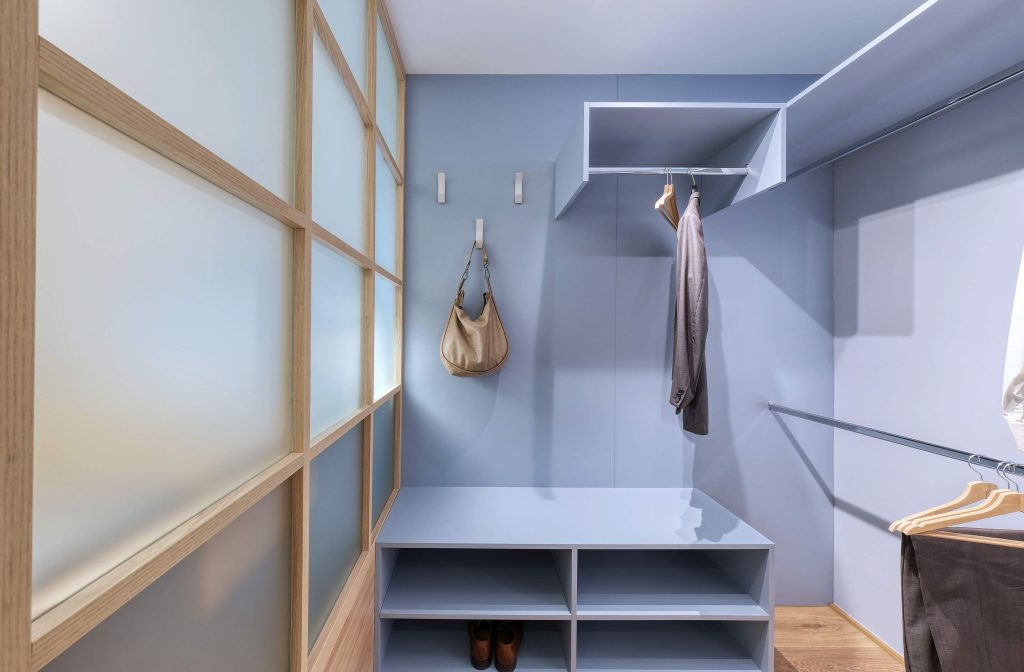 Garderobno omaro, ki je prej stala v dnevni sobi in do katere je bil otežen dostop mimo zofe, so prav tako odstranili. S spalno nišo in njenim odpiranjem v dnevni prostor se je namreč ob vhodu sprostil nov prostor za garderobno nišo oziroma »walk-in« omaro, kjer so nameščeni tudi obešalniki za dnevna oblačila in police za obutev. Hodnik je tako lažje prehoden in zaradi zastekljene spalne niše tudi osvetljen.