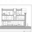 Vila je tlorisno razdeljena na tri nivoje – v pritličju so skupni, dnevni prostori, v nadstropju spalnice treh otrok, pod streho pa še prostori staršev. Ko vstopimo v hišo, nas preseneti surovost uporabljenih materialov: vidna betonska konstrukcija, ki ne skriva vzorca opažnih plošč, je na strateških mestih prekrita z bogato leseno oblogo; pločevinasti detajli pa povzemajo obliko in strukturo fasade, ki jo vidimo skozi okna.