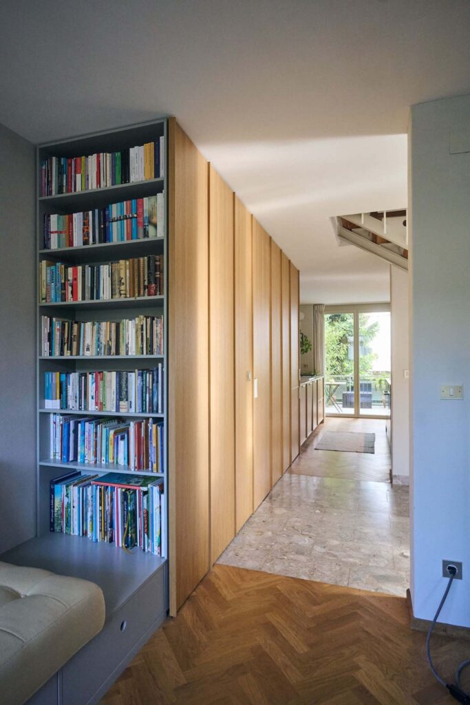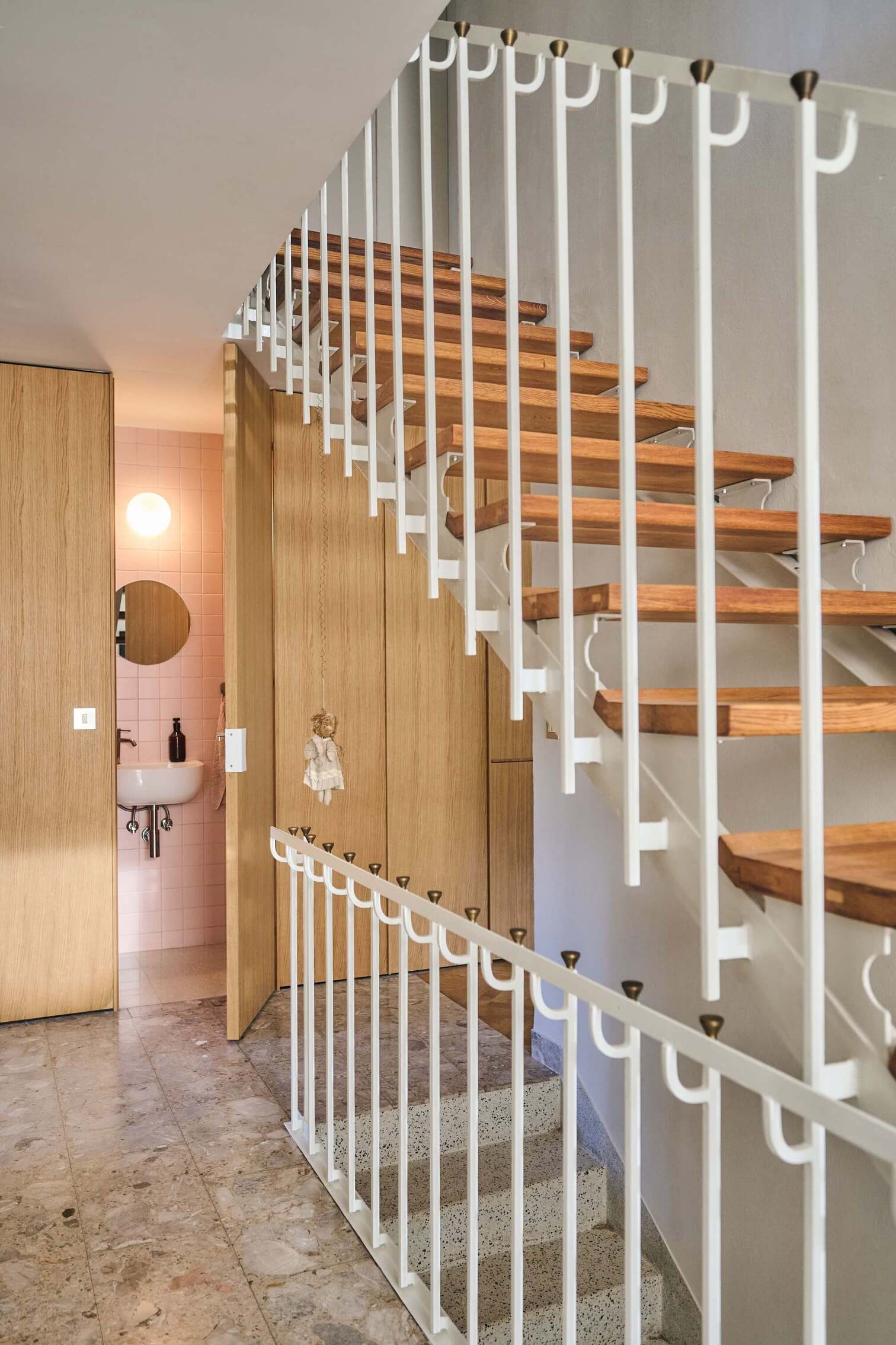 Vajeni smo, da so sodobni prostori kar se da odprti in prostorni, zato so v pritličju v bivalnem delu odstranili vsa vrata. Edina vrata zapirajo dnevni WC, pa še ta so vgrajena v leseno oblogo, tako jih skoraj ni mogoče opaziti.