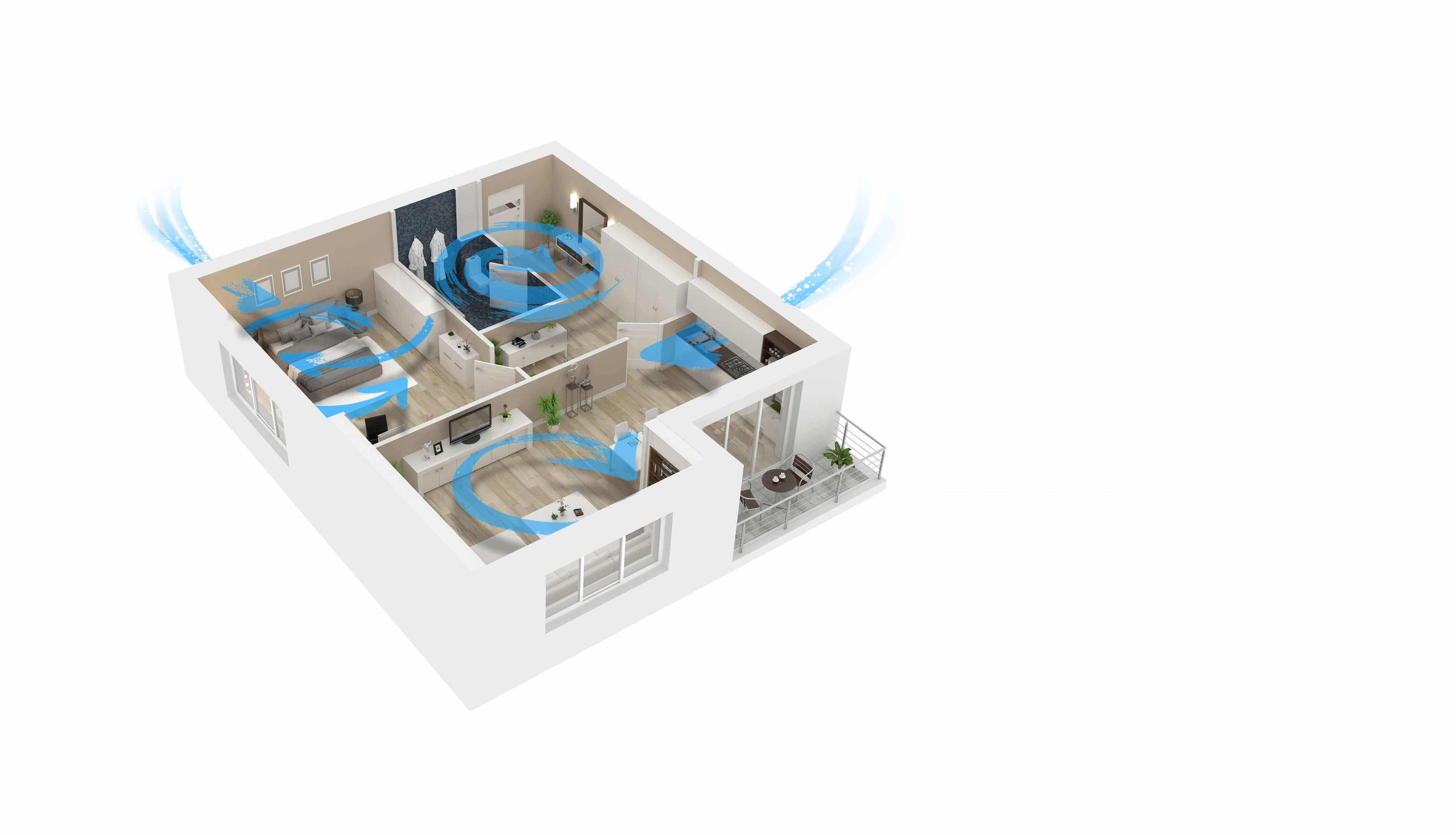 Prezračevalni sistem v rednih časovnih razmikih črpa odpadni zrak iz prostorov in ga nadomešča z novim, svežim, bogatim s kisikom. Tako se izognete ročnemu odpiranju oken in drugim manj učinkovitim metodam prezračevanja.