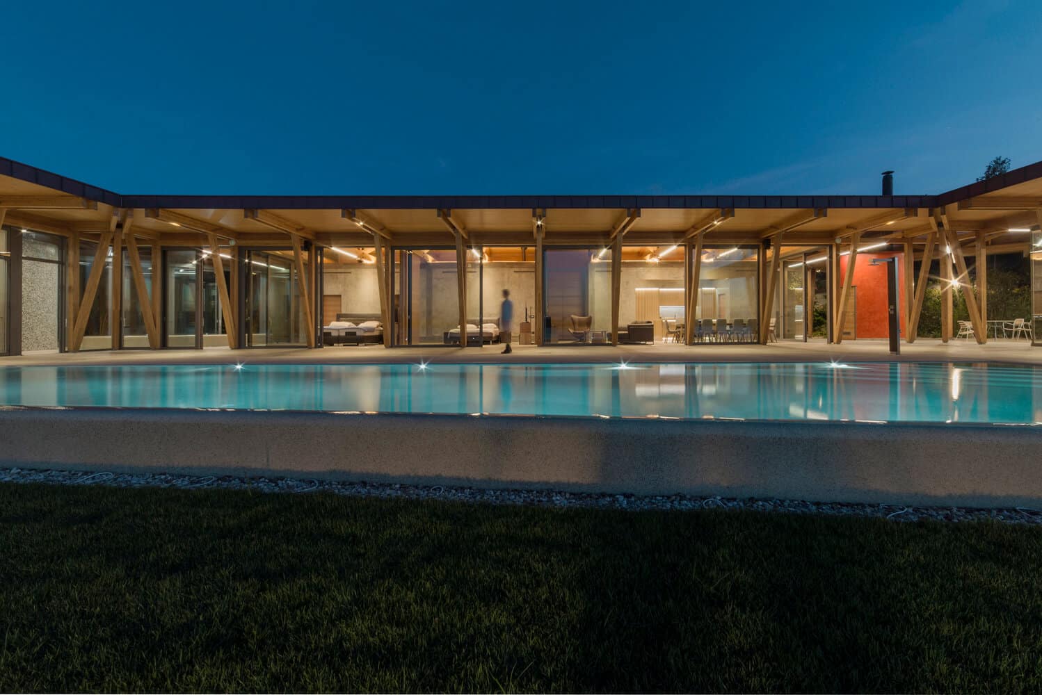 Sodobno zasnovan objekt je krit s strešniki, kateri so uporabljeni tudi v širši lokalni arhitekturi. So se pa arhitekti pri tem poigrali z barvami in ustvarili zanimive vzorce, ki naredijo velikansko gmoto strešnikov bolj dinamično. Pri oblikovanju objekta so arhitekti pomedli s klasičnimi predstavami o stenah, oknih ali vratih, prav tako objekt povprašuje vlogo sob, kleti in tal. Tudi funkcija hiše ni strogo določena. V ta namen so ustvarili vrsto »škatel«, v katere so umestili vse potrebne servisne dele in naprave. Najrazličnejši programi se fluidno pretakajo skozi hišo, med posameznimi stenami, v eksterier. V kotih so oblikovali prehodne prostore med zunanjim in notranjim, ki služijo kot zimski ali poletni vrtovi, kriti s polikarbonatnimi ali polipropilenskimi ploščami.