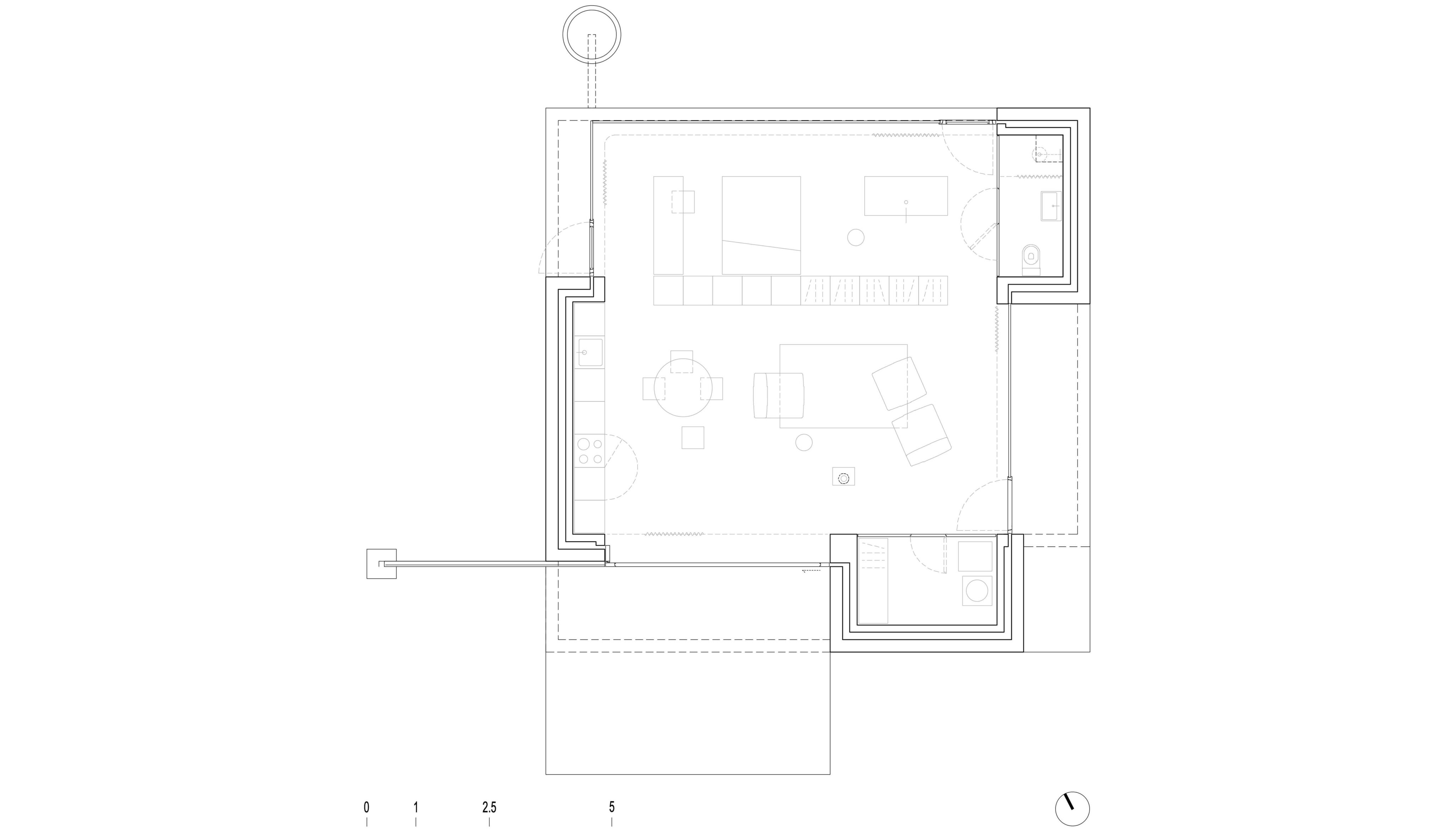 Tloris je zasnovan racionalno in odprto. Osrednji bivalni prostor združuje kuhinjo, jedilnico in dnevni prostor, ki se s pomočjo velikih drsnih sten nadaljuje na teraso in vrt. Zavese niso le funkcionalni element, temveč pomemben del arhitekturnega izraza – z njimi se prostor po potrebi zapira, odpira ali mehča, kar omogoča različne stopnje intime. Bivanje tako ni statično, temveč prilagodljivo in odzivno.