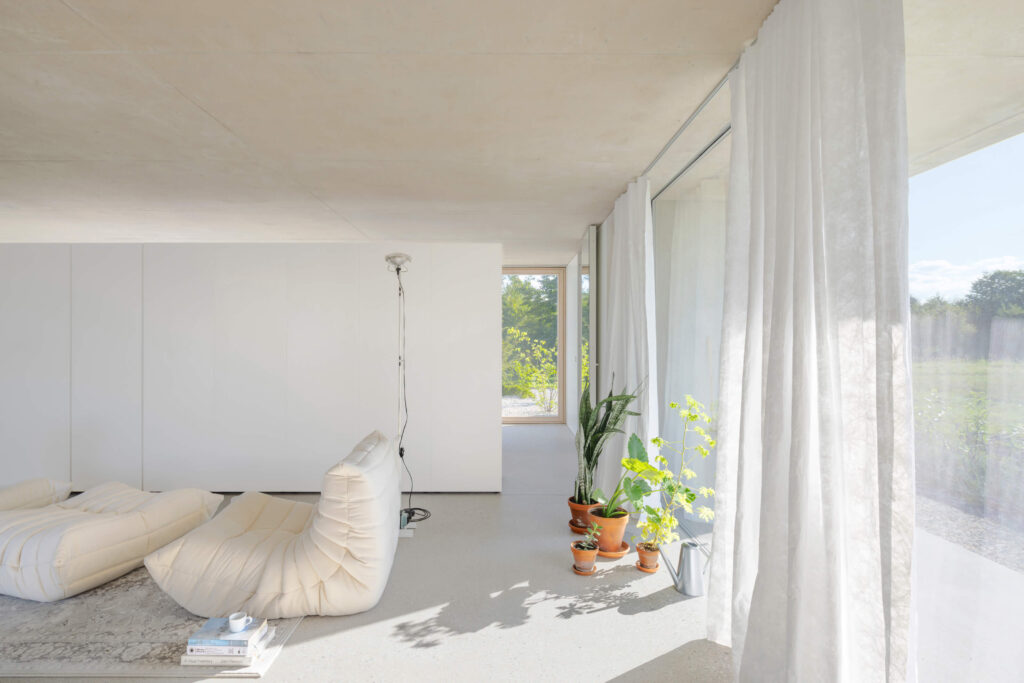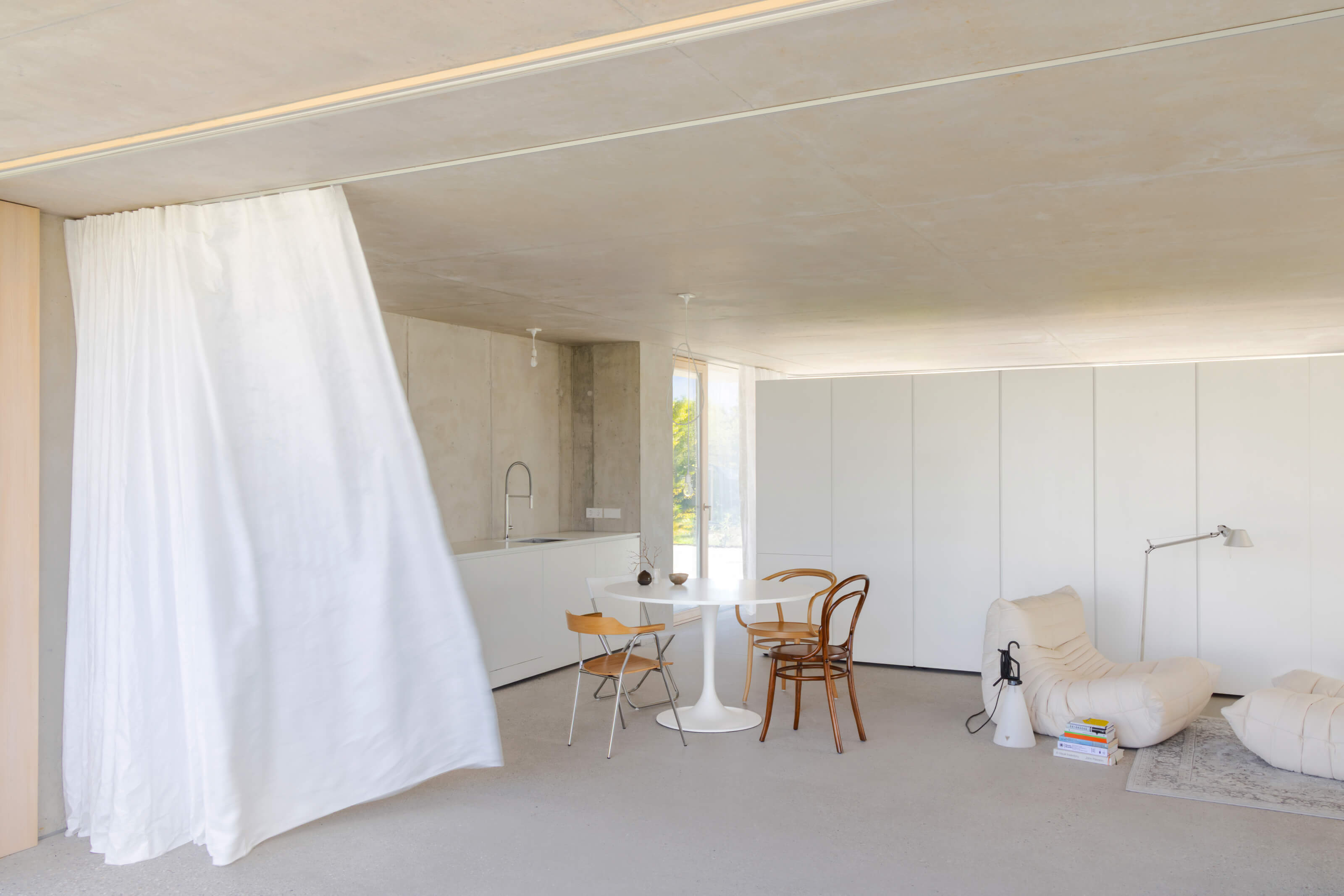 Notranjost hiše ostaja zadržana in umirjena. Beton, belo pohištvo in naravni les ustvarjajo nevtralno ozadje, ki poudarja svetlobo in zelenje zunanjega prostora. Oprema je skrbno izbrana, a ne dominantna; prostor deluje zračno in nenasičeno, kar omogoča, da se življenje vanj naseli brez odvečnih omejitev. Poseben poudarek je na občutku tišine in kontinuitete – prostori se vizualno prelivajo drug v drugega, brez ostrih prekinitev.