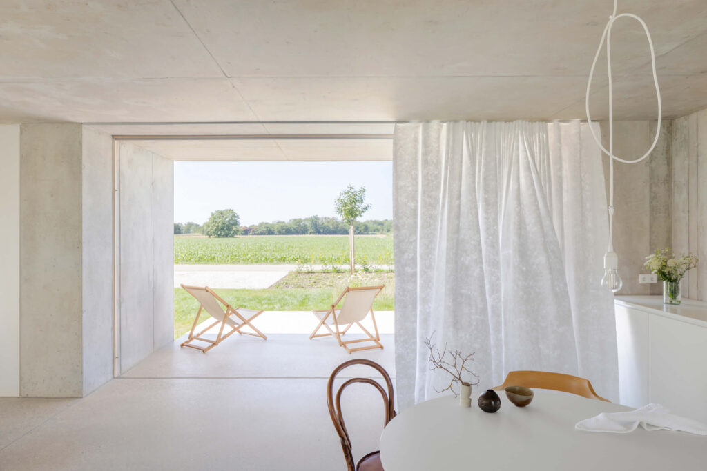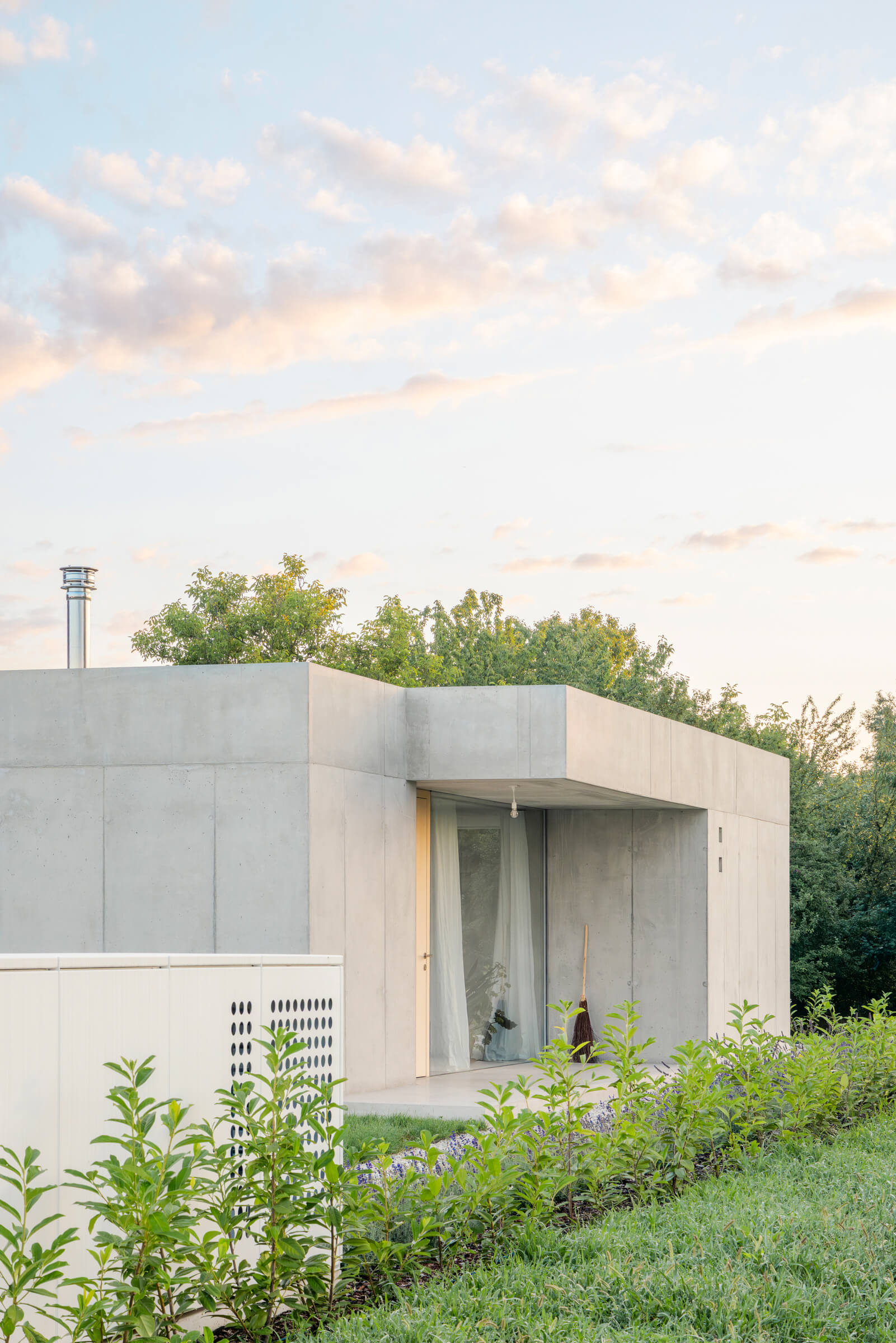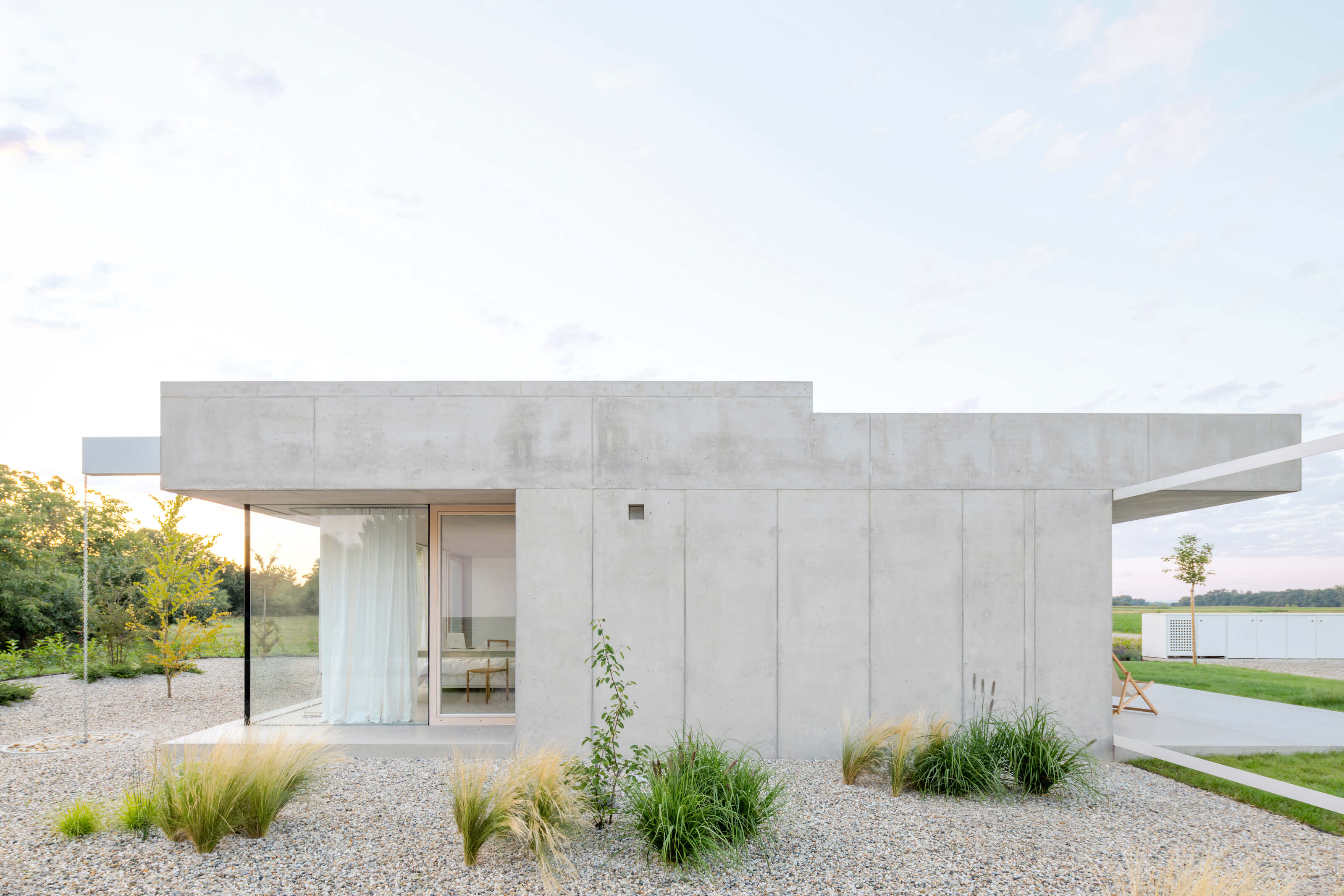 Na robu prekmurske ravnice, kjer se pogled brez zadržkov odpira proti poljem in nizkemu horizontu, stoji majhna betonska hiša, zasnovana kot umirjen odgovor na prostor, v katerega je umeščena. Njena arhitektura ne išče pozornosti, temveč se zadržano in natančno vpisuje v krajino, ki jo obdaja. Projekt, delo biroja Skupaj arhitekti pod vodstvom arhitekta Tomaža Ebenšpangerja, je zasnovan kot dom, ki omogoča preprosto, počasno in z naravo povezano bivanje.