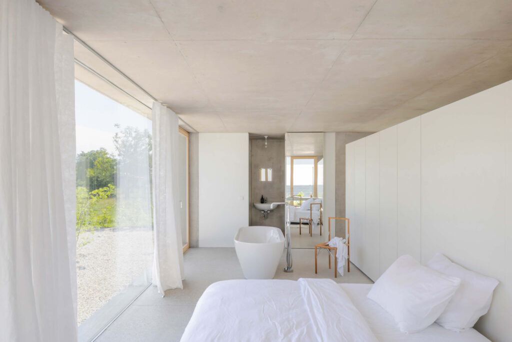 Tudi spalni in kopalni del sledita enaki logiki odprtosti in povezanosti z naravo. Pogledi na vrt in ravnico ostajajo prisotni, hkrati pa zavese in premišljena razporeditev omogočajo umik in zasebnost. Kopalnica z veliko zastekljeno površino deluje kot intimni podaljšek zunanjega prostora, kjer se vsakdanji rituali povežejo z naravnim okoljem.