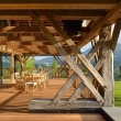 Arhitekti so se odločili skedenj prestaviti na ugodnejšo lokacijo, kjer najlepše uokviri razgled. Skrbno označen skelet so očistili in ponovno sestavili na krajinsko usklajenem zidanem podstavku. Znotraj intrigantne, čipkaste strukture so postavili montažne elemente – fasadni ovoj, zasteklitve, sekundarno streho in končne tlake, ki skupaj tvorijo paviljonski vsadek, neodvisen od originalnega lesenega ovoja.
