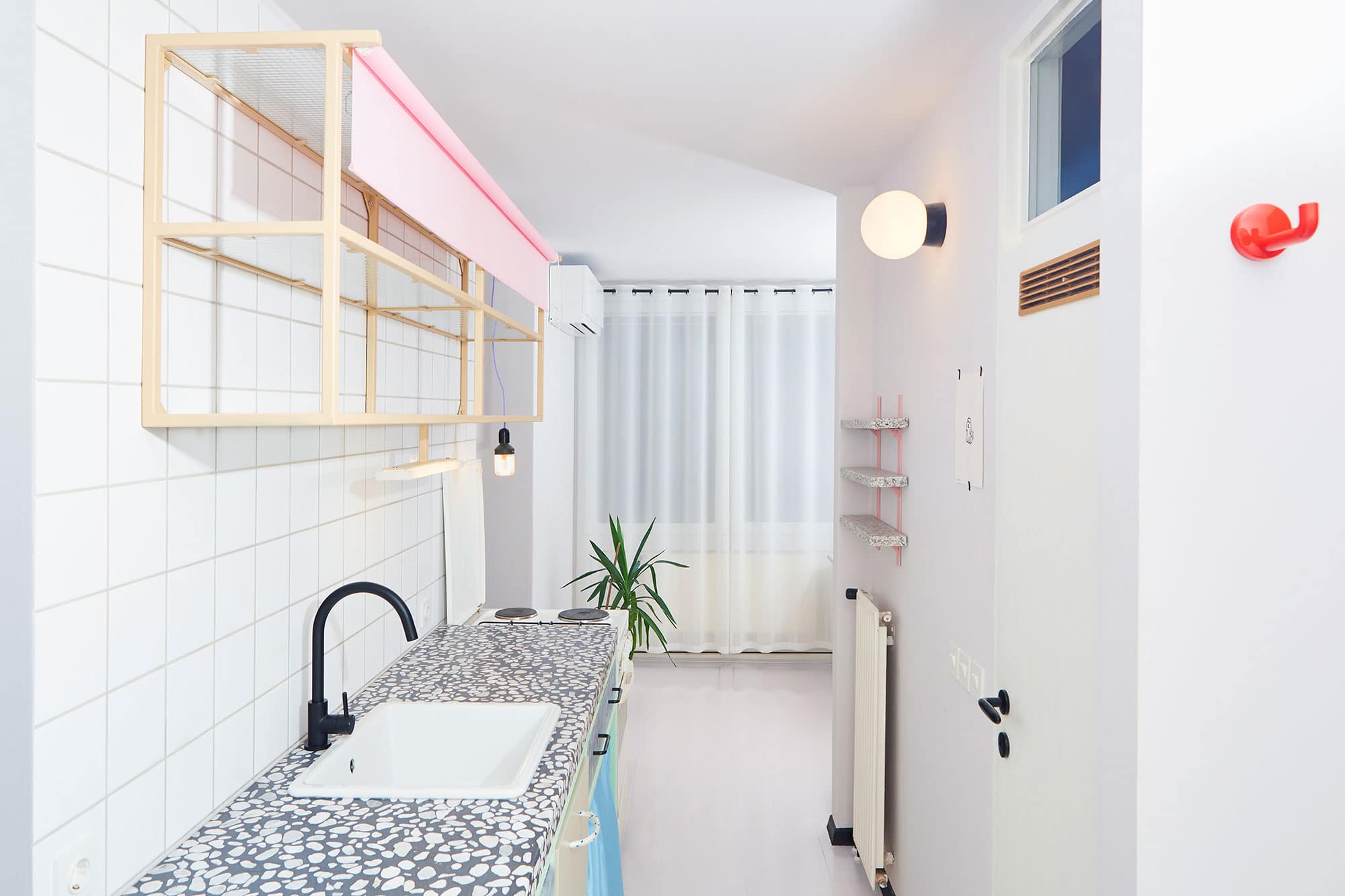 Ker je stanovanje precej majhno, meri le 35 kvadratnih metrov, sta hotela upravičiti vsak poseg v prostor. To je tudi eden izmed razlogov, da sta se sten v kopalnici lotila zelo inovativno. Ostale so popolnoma brez ploščic, ki smo jih sicer vajeni v kopalnicah, prekrite pa so le z vodoodporno barvo: s tem pa sta prihranila nekaj deset centimetrov, ki bi jih drugače zavzela stenska obloga. Vsi nanosi barve pa so ustvarili nekoliko organsko, skoraj jamsko vzdušje. “Tako nastala kopalnica te obda in s teboj vstopi v nekakšen intimen odnos,” koncept pojasni oblikovalec.