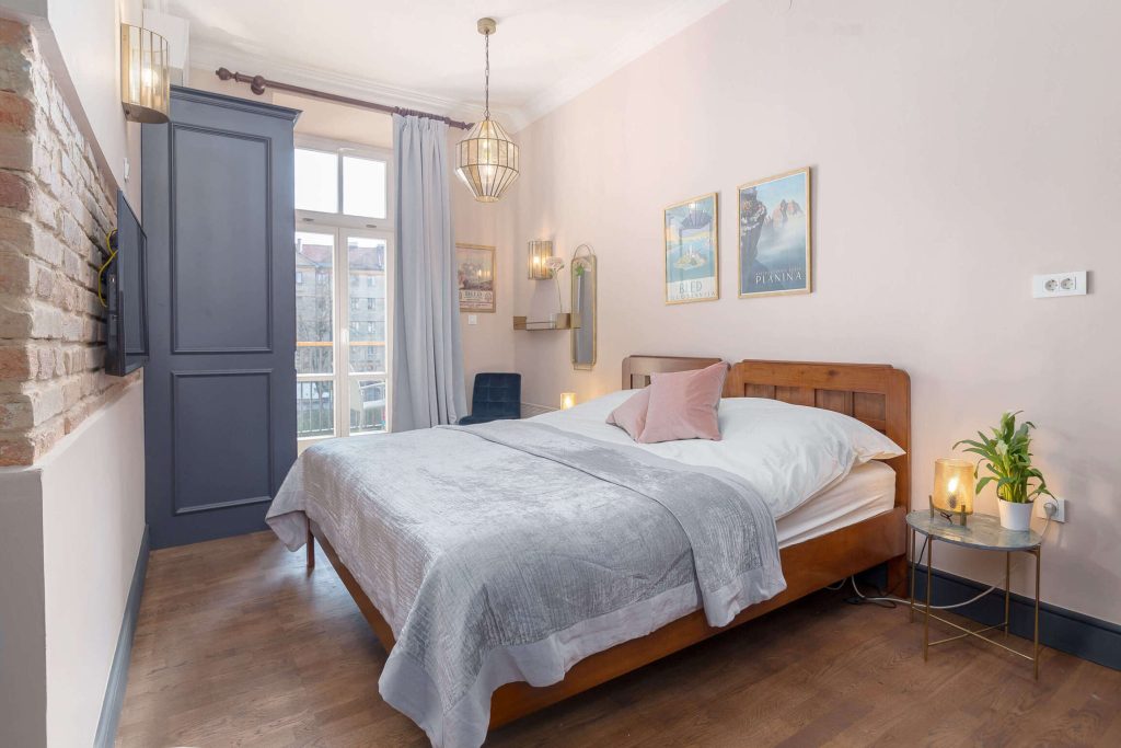 V spalnici se takoj zagledamo v goli del stene, kjer so olupili omet in pustili izvirnemu opečnemu zidu, da zasije v svoji prvinskosti. Hodnik vodi tudi v kopalnico, kjer jim je visoki strop omogočil, da so grelec vode montirali in skrili pod strop. Še ena odlika tega stanovanja: ima majhen balkon, s katerega se ponuja razgled na Ljubljanico.
