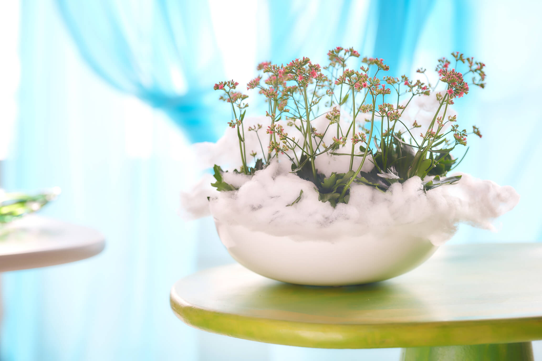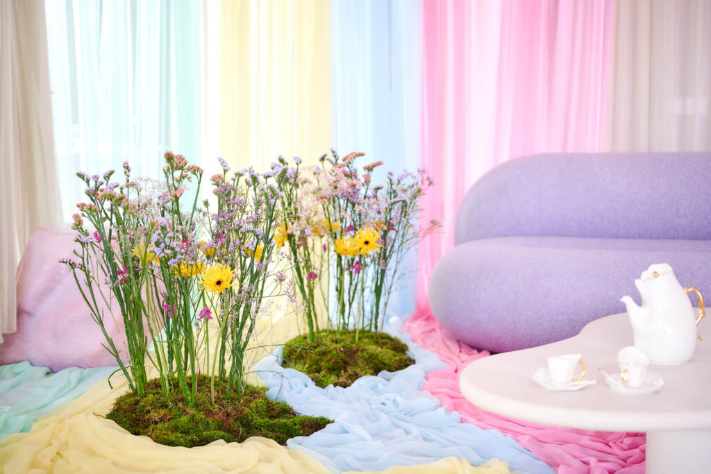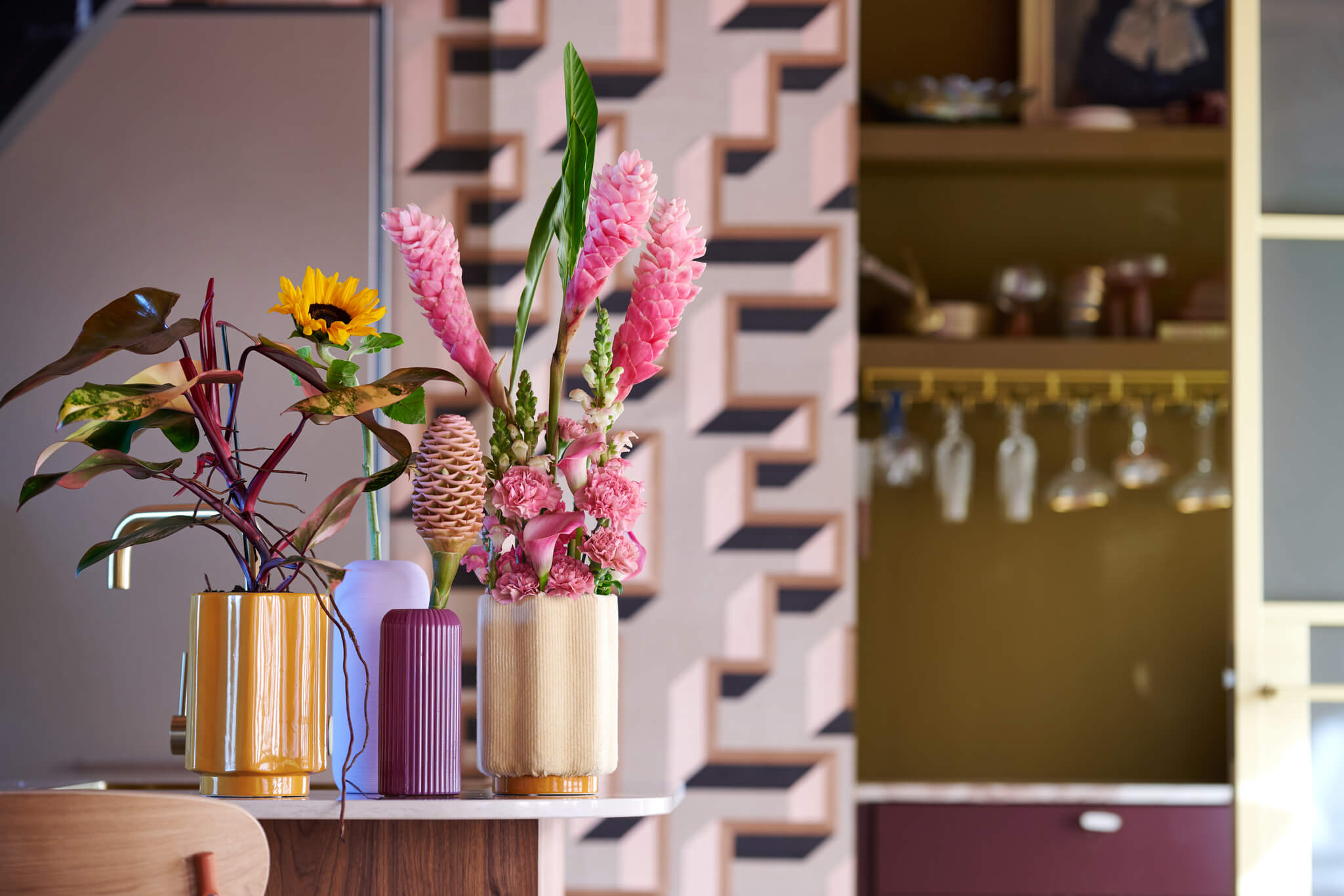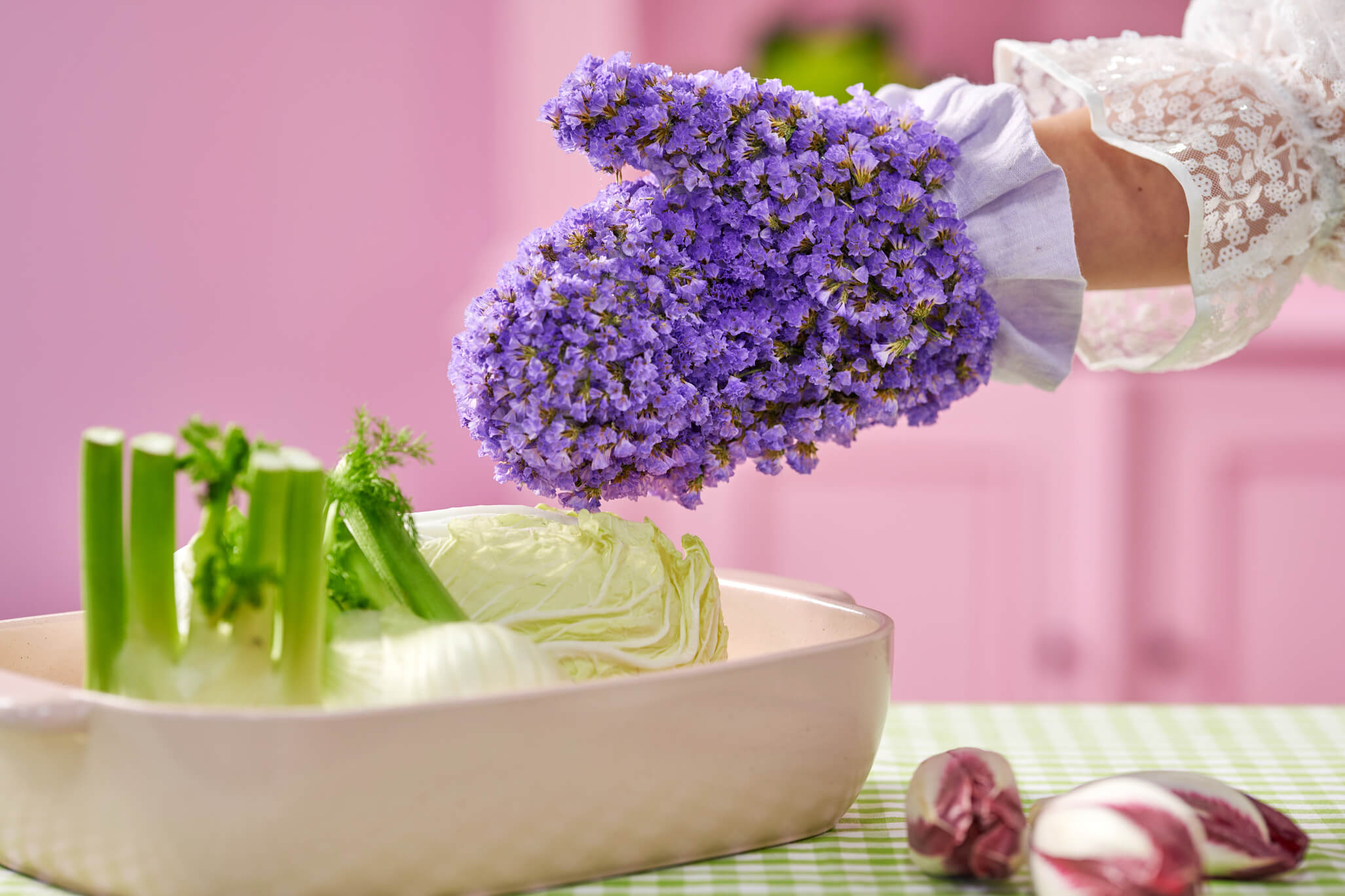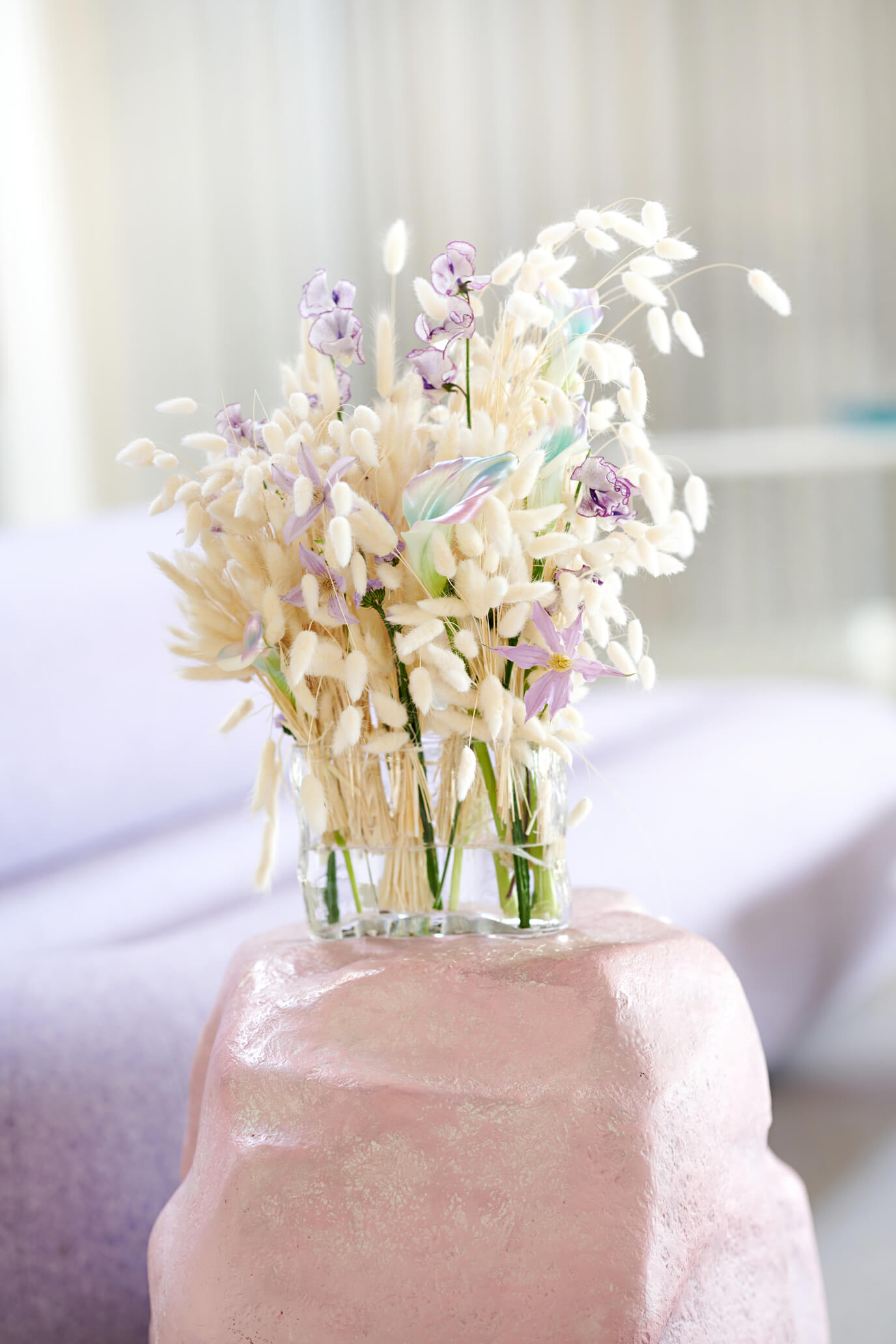 Krizanteme, kale, grahor in lizijantusi v nežno neonastih pastelih ustvarjajo vtis nadrealnosti. Suho cvetje in viseče rastline prostoru dodajo lahkotno, skoraj eterično noto. Tak dom vabi k odmiku, navdihu in raziskovanju notranjih pokrajin, kjer domišljija postane naravna spremljevalka bivanja.