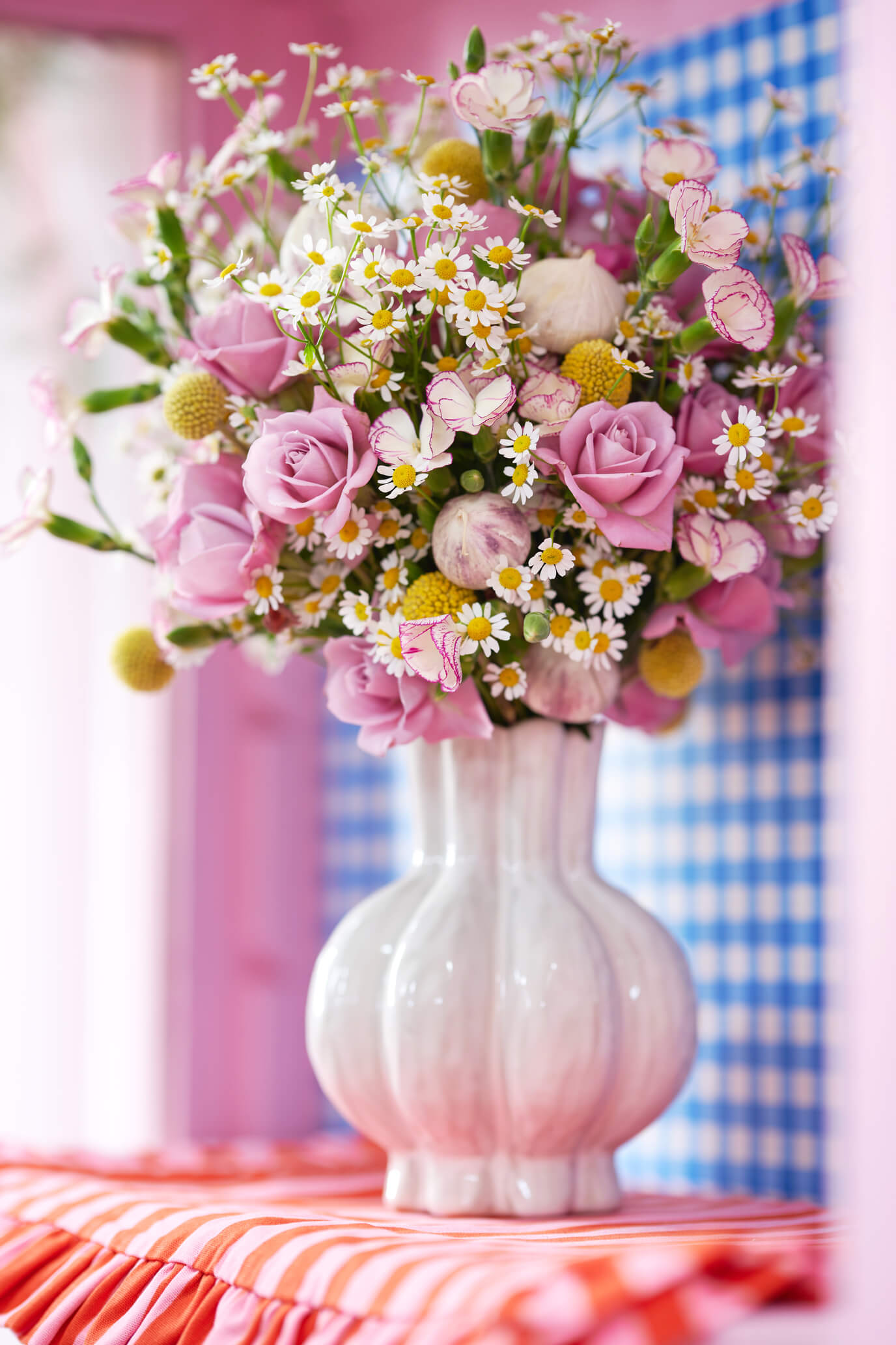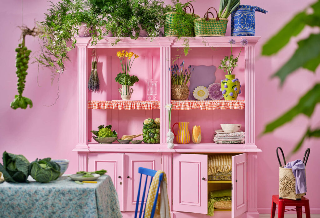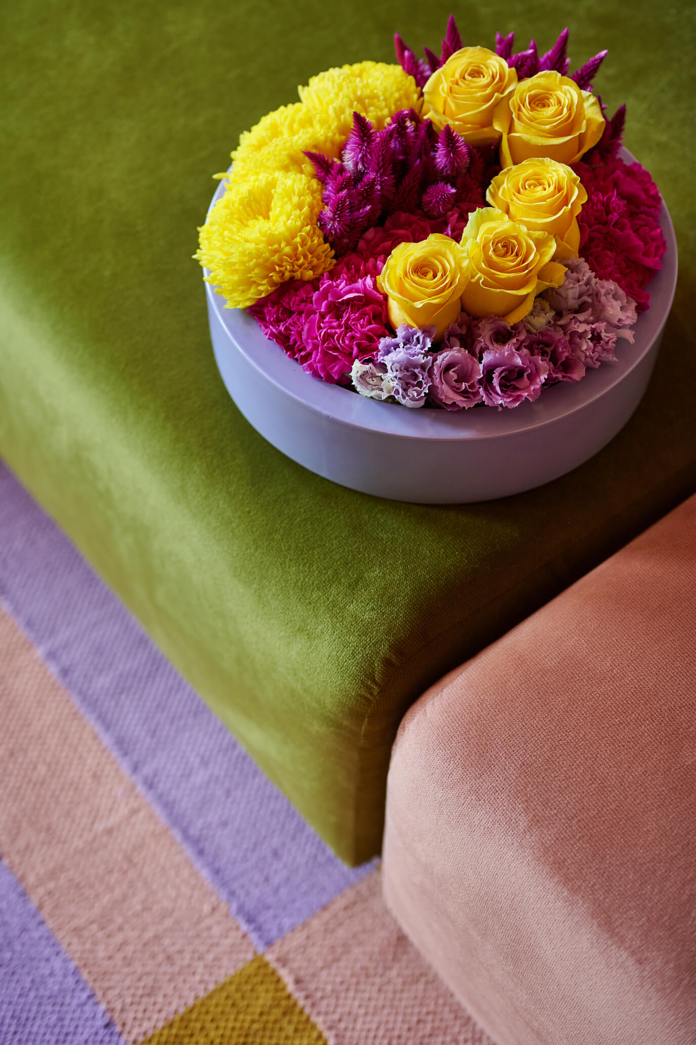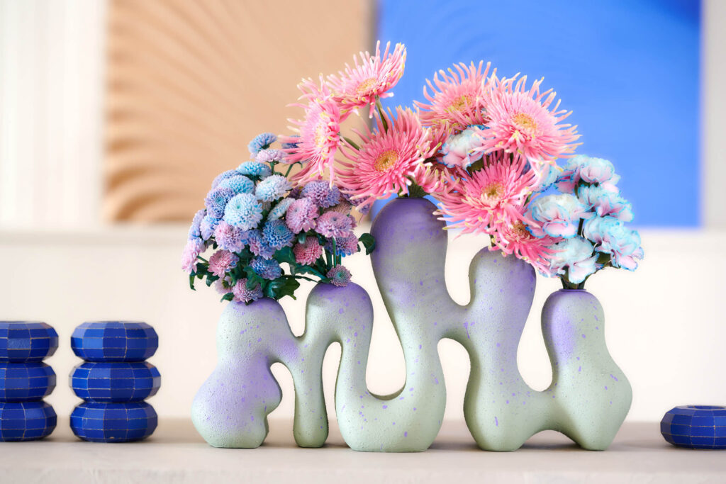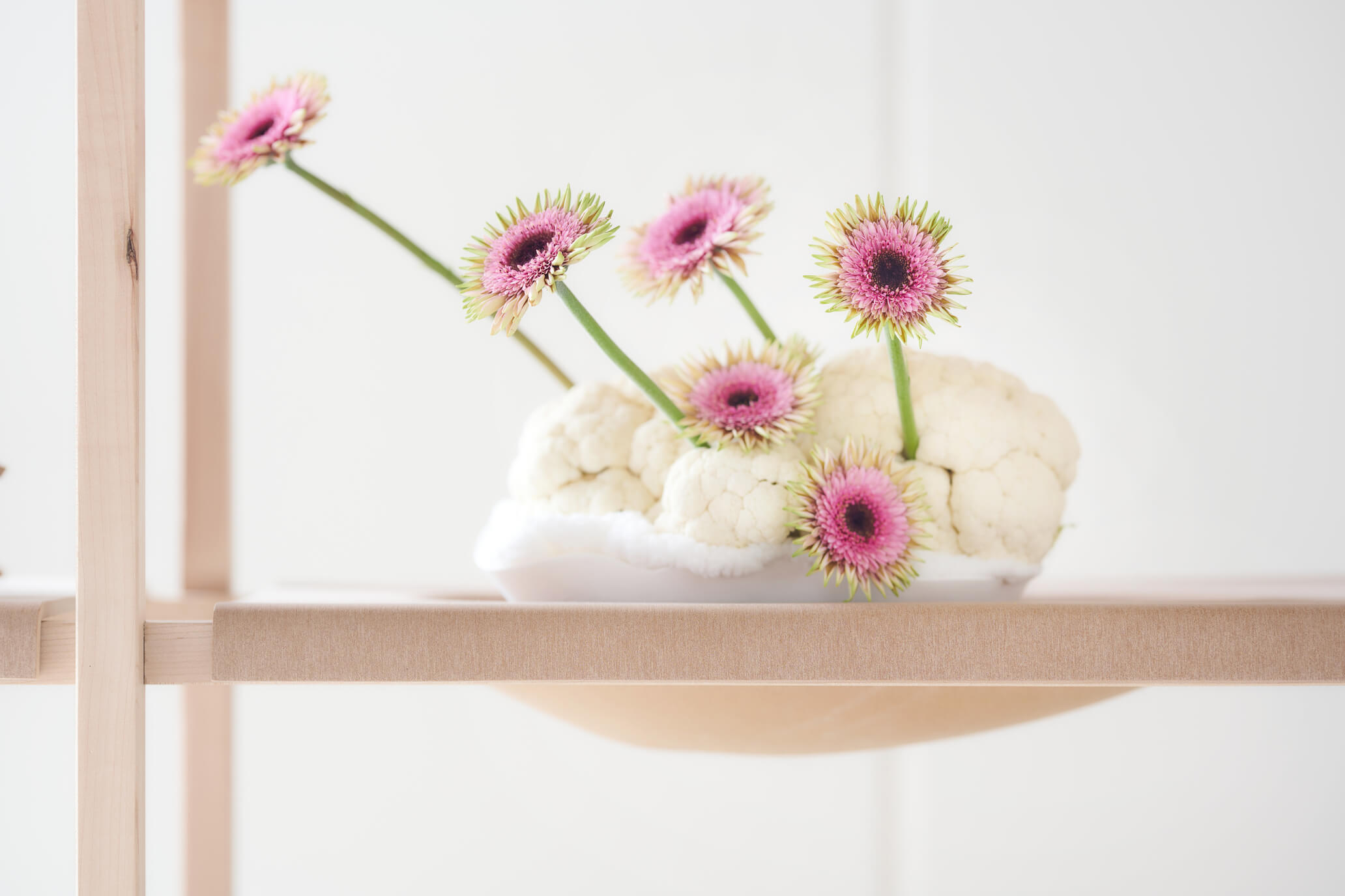 Krizanteme, kale, grahor in lizijantusi v nežno neonastih pastelih ustvarjajo vtis nadrealnosti. Suho cvetje in viseče rastline prostoru dodajo lahkotno, skoraj eterično noto. Tak dom vabi k odmiku, navdihu in raziskovanju notranjih pokrajin, kjer domišljija postane naravna spremljevalka bivanja.