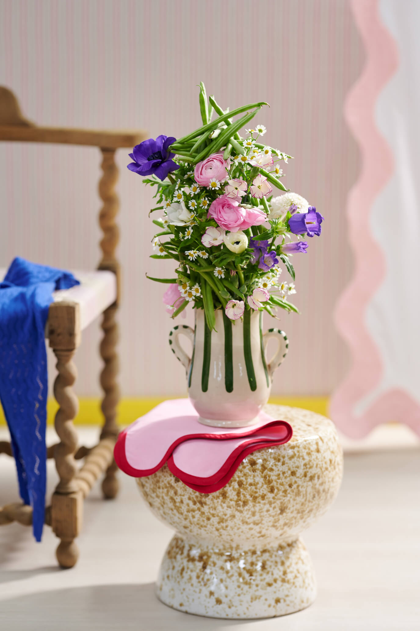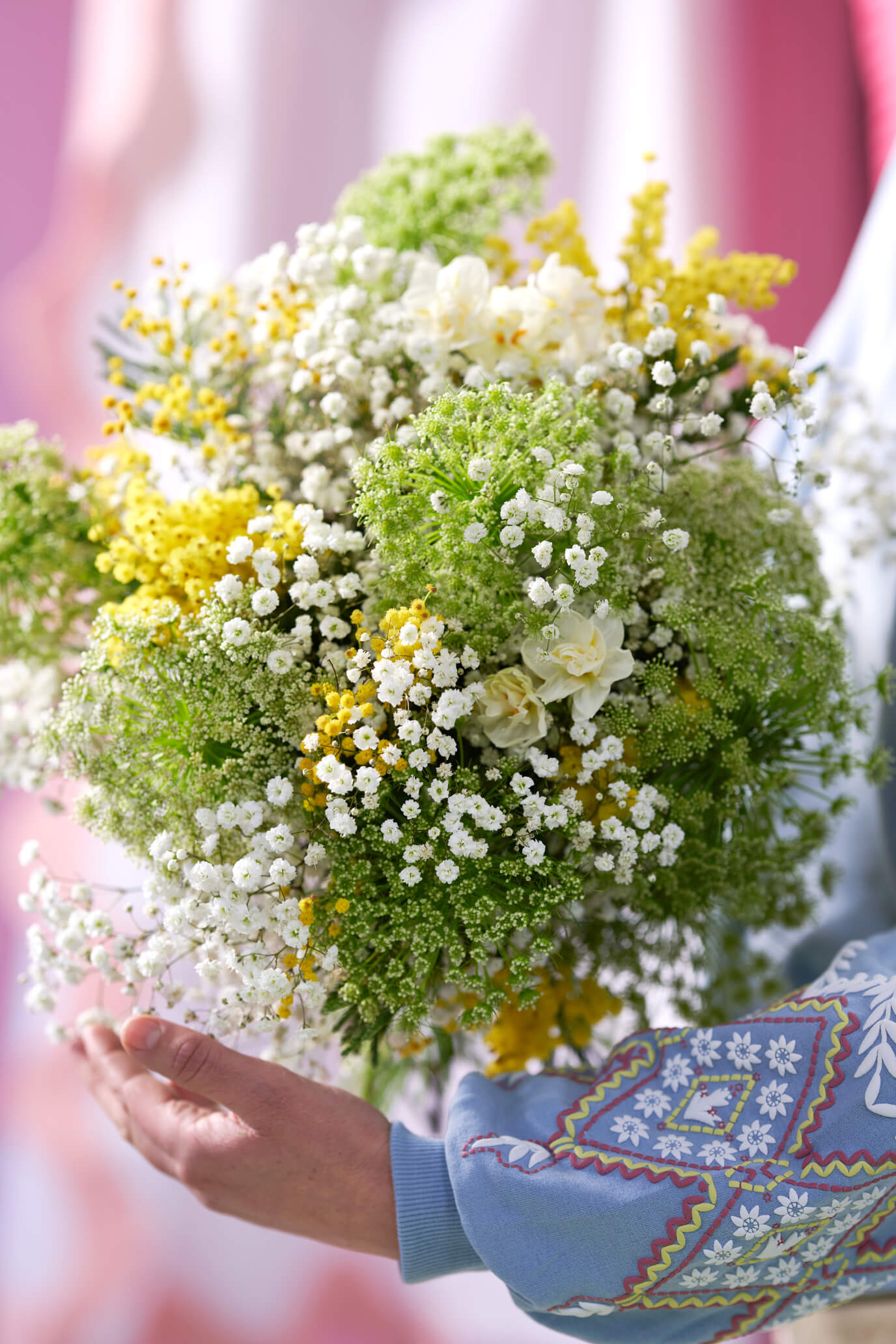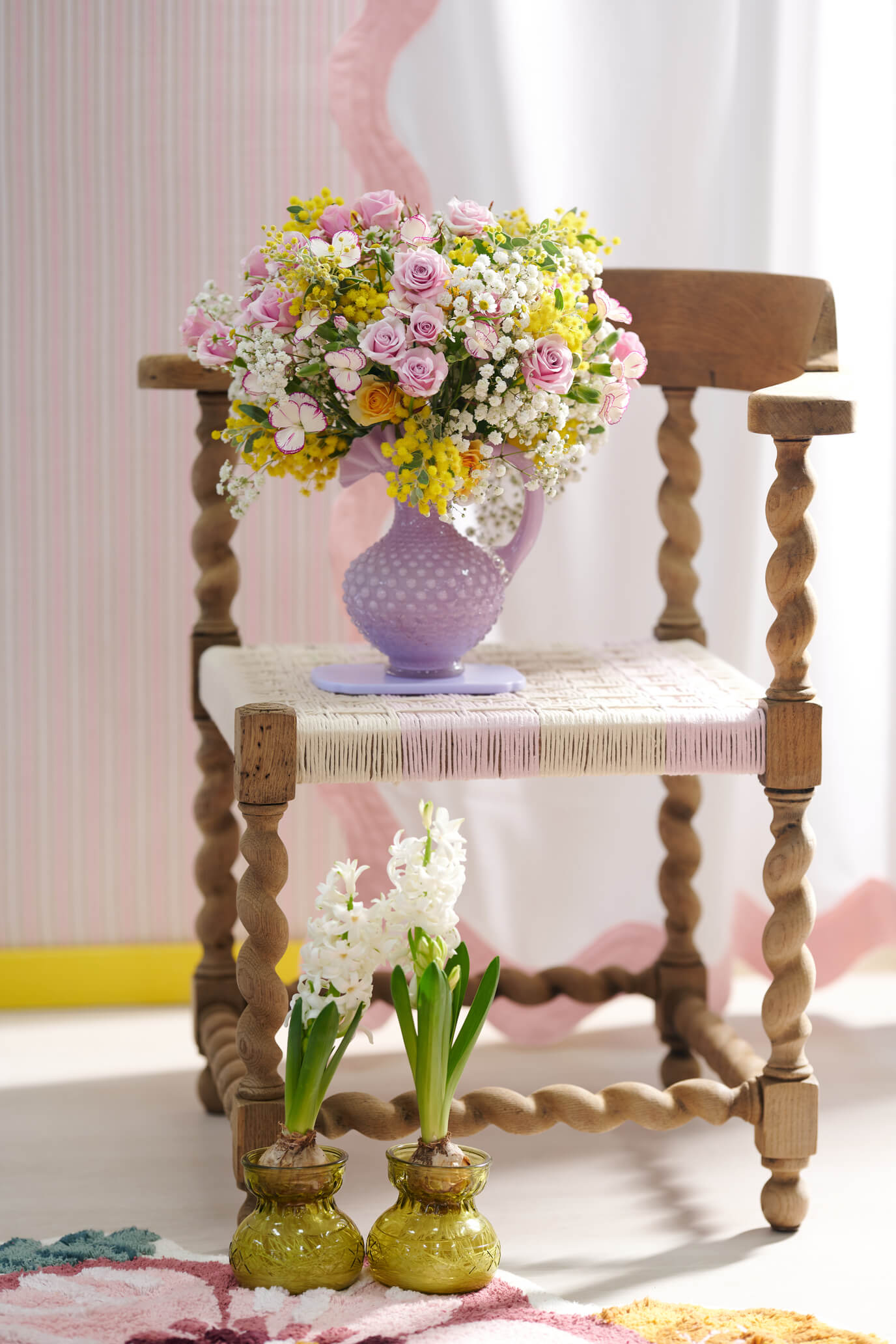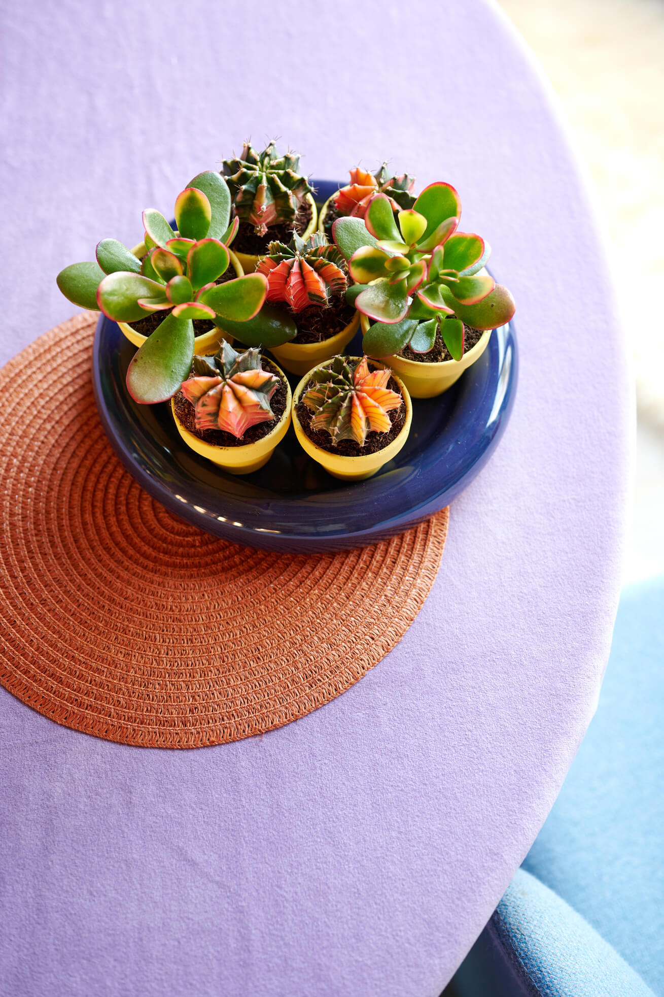 Krizanteme, kale, grahor in lizijantusi v nežno neonastih pastelih ustvarjajo vtis nadrealnosti. Suho cvetje in viseče rastline prostoru dodajo lahkotno, skoraj eterično noto. Tak dom vabi k odmiku, navdihu in raziskovanju notranjih pokrajin, kjer domišljija postane naravna spremljevalka bivanja.