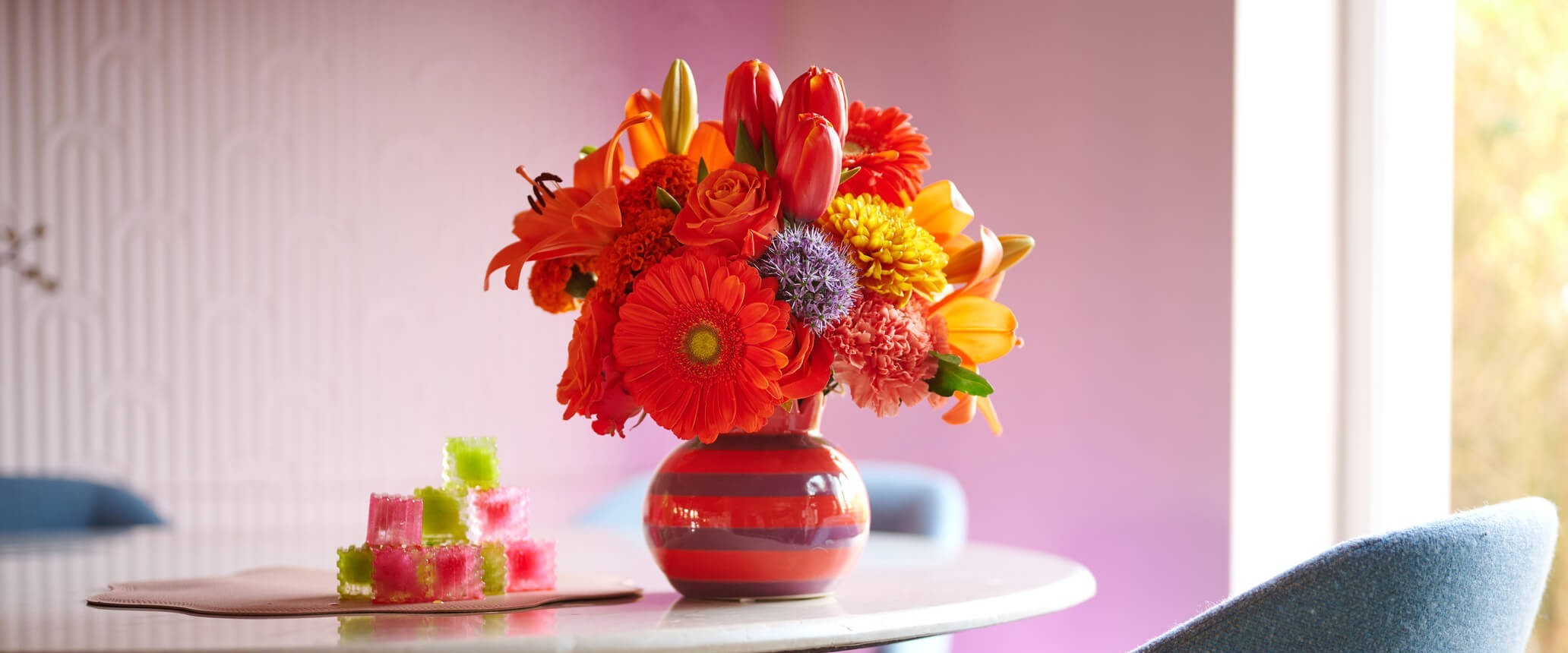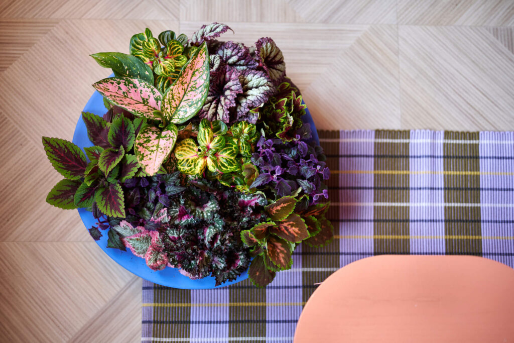 Sobne rastline z izrazitimi listi in vzorci – bromelije, begonije, krotoni in fikusi – zavzamejo osrednje mesto. Cvetje v toplih, intenzivnih tonih, kot so gerbere, dalije, amarilisi in lilije, se pri tem slogu razporeja v razgibanih višinah in oblikah. Tak dom deluje kot topel objem, ki nas napolni z energijo, optimizmom in nasmehom.