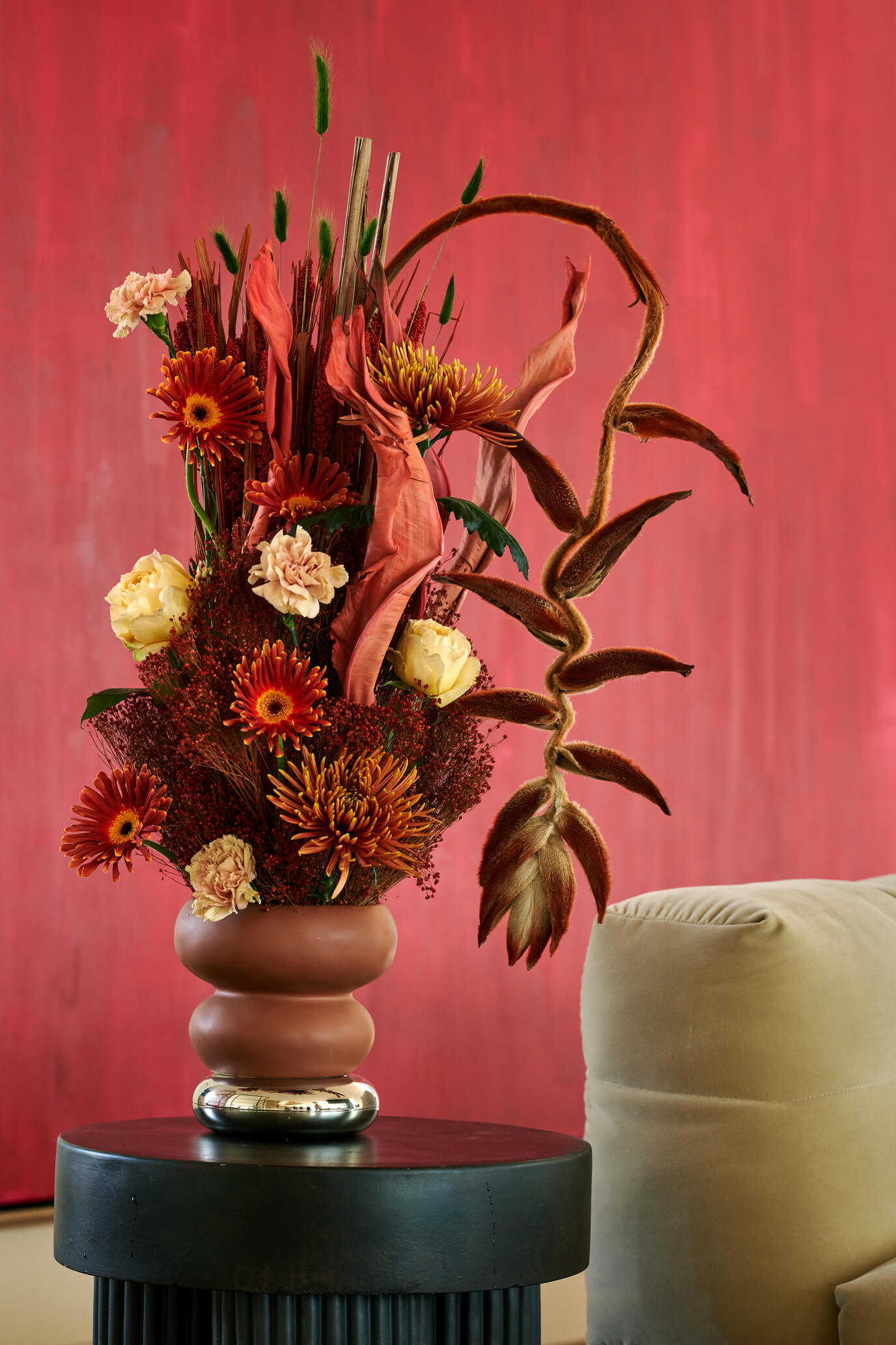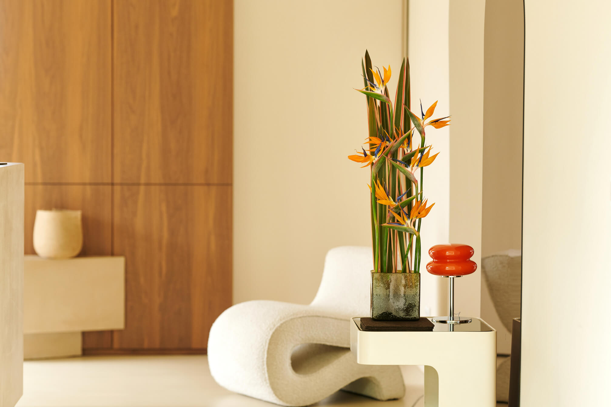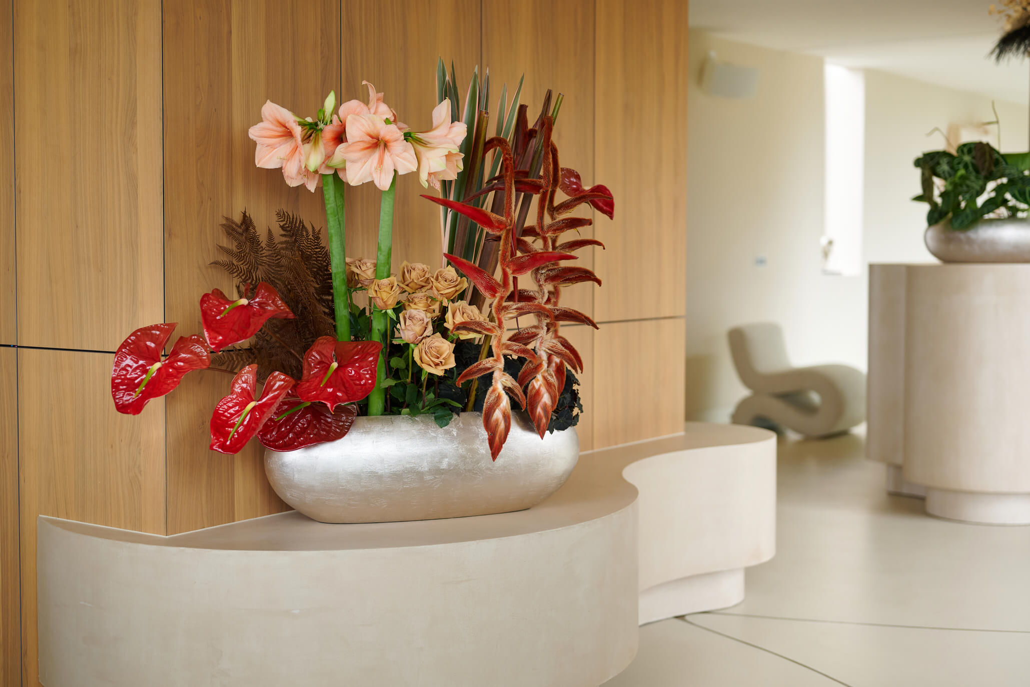 Dominantne rastline, kot so strelicije, alokazije in flamingovci, prostoru dajejo strukturo in samozavest. Cvetlični aranžmaji v toplih oranžnih, rjavih, bakrenih in rdečih odtenkih izžarevajo veselje, povezanost in zaupanje v tok življenja. Tak dom spodbuja optimizem in odpira pogled naprej – z občutkom, da prihodnost raste iz dobrih korenin.