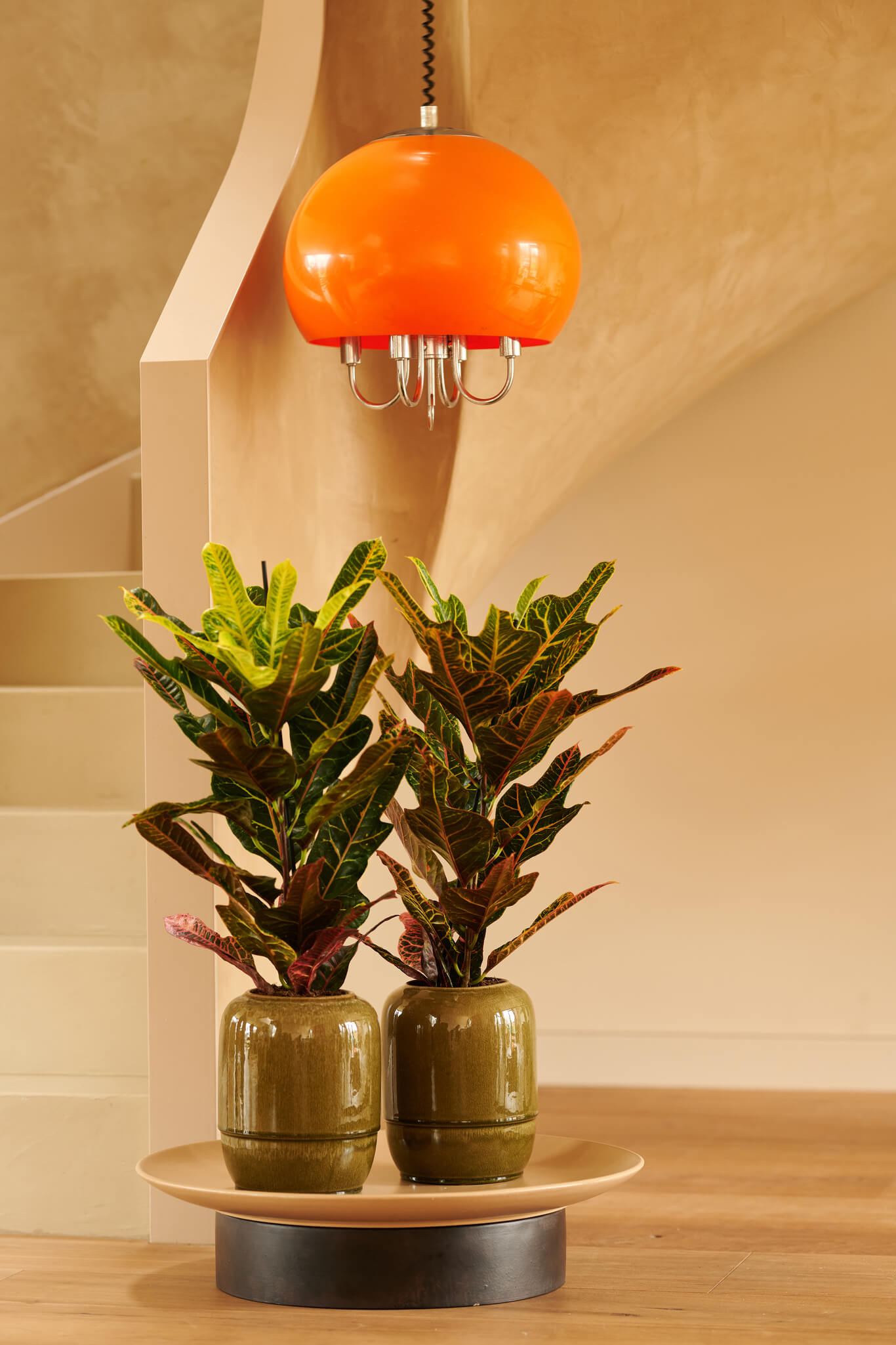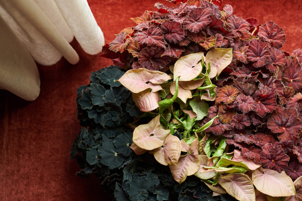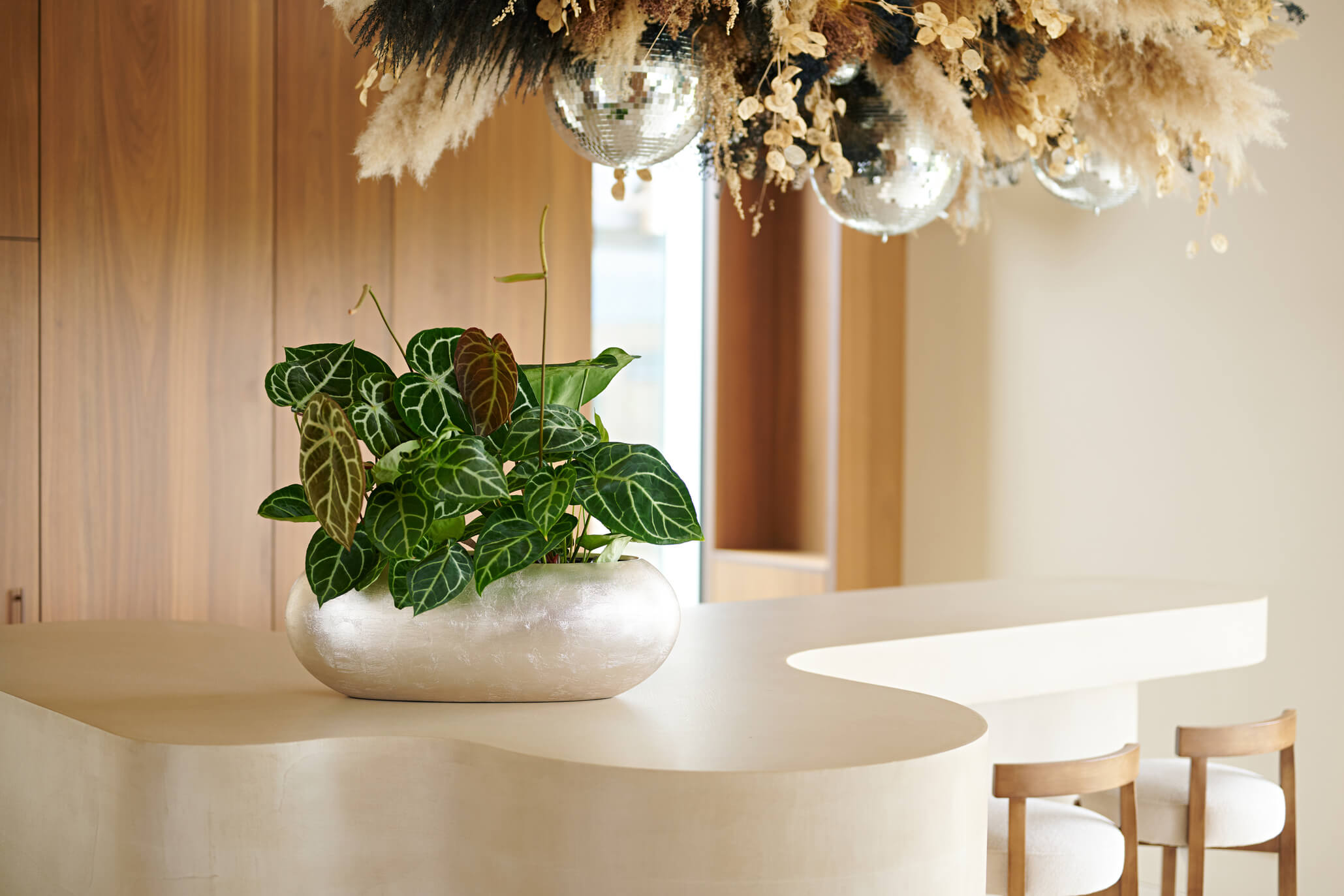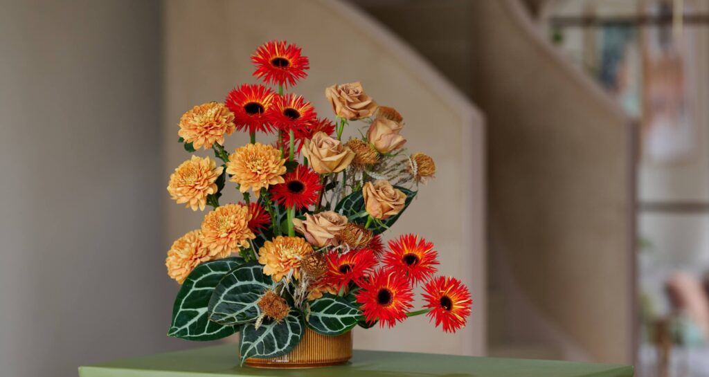 Dominantne rastline, kot so strelicije, alokazije in flamingovci, prostoru dajejo strukturo in samozavest. Cvetlični aranžmaji v toplih oranžnih, rjavih, bakrenih in rdečih odtenkih izžarevajo veselje, povezanost in zaupanje v tok življenja. Tak dom spodbuja optimizem in odpira pogled naprej – z občutkom, da prihodnost raste iz dobrih korenin.