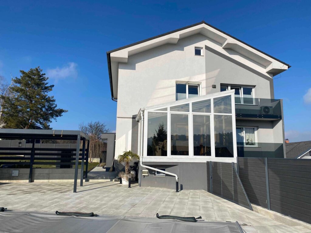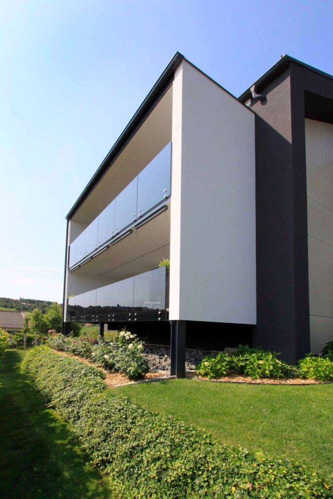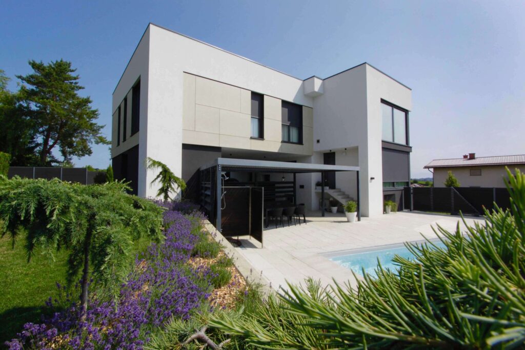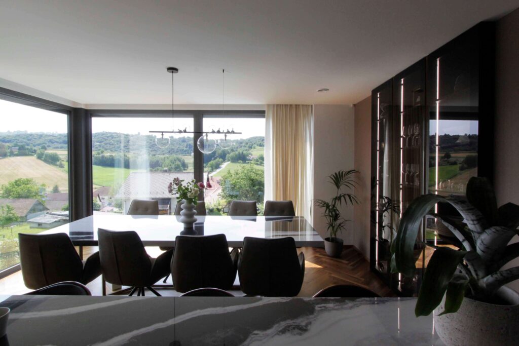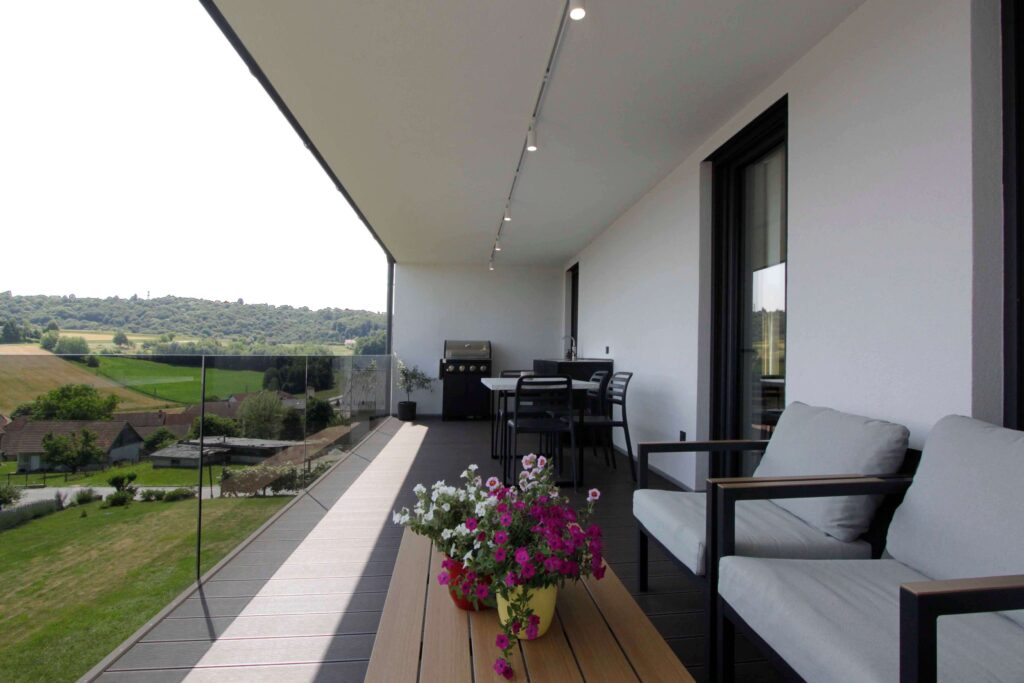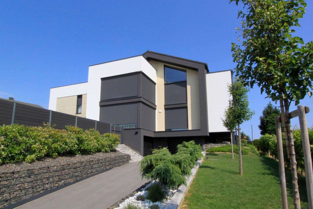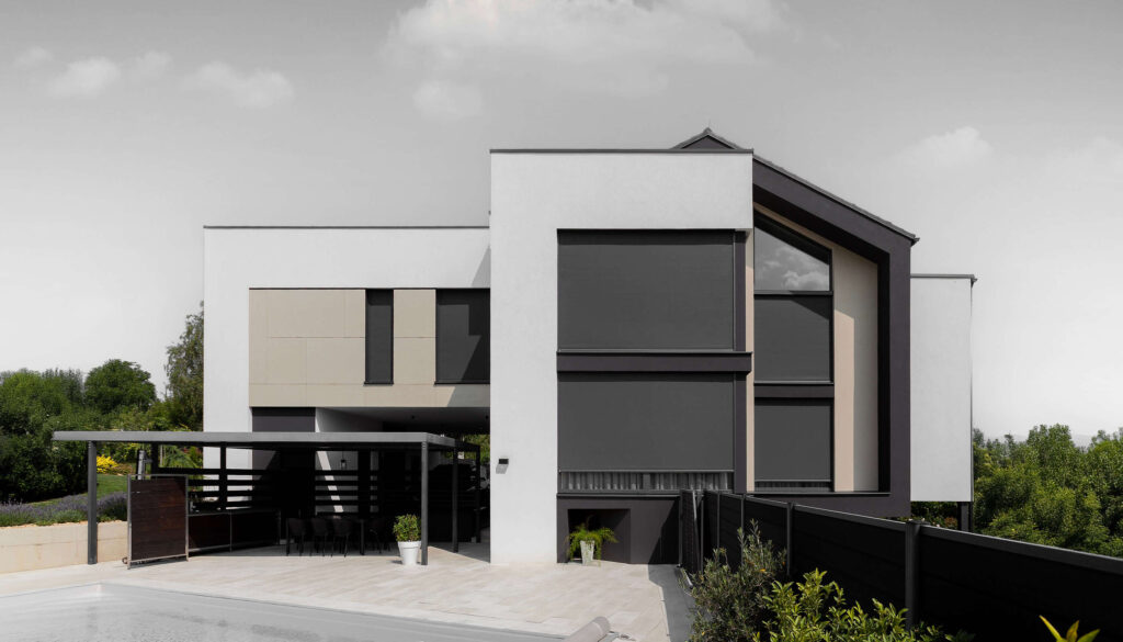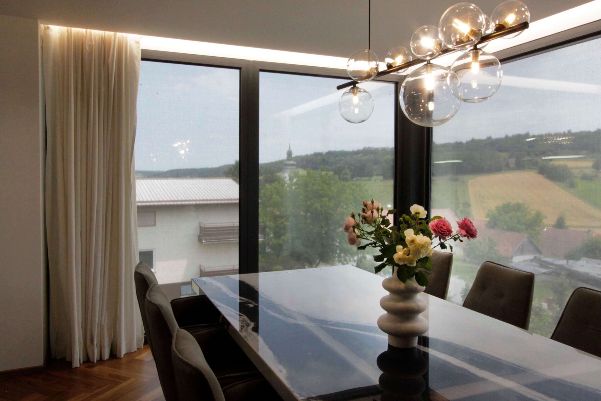 Zaradi povečanih okenskih površin je družina Trinkaus razmišljala o ustreznih zunanjih senčilih. »Dobro senčenje je bilo nujno iz funkcionalnega vidika, da preprečimo pregrevanje objekta, pa tudi iz estetskega,« pravi Denis. Zlatka pa dodaja: »Raje kot žaluzije, ki niso preproste za čiščenje, sva izbrala screen senčilapodjetja Senčila Medle, saj so elegantna, preprosta za vzdrževanje in omogočajo pogled navzven.« S podometno izvedbo, vgrajeno neposredno v izolacijo objekta, screeni ponujajo diskretno in estetsko rešitev, idealno za sodobno arhitekturo. Za profesionalno vgradnjo oken in screen senčil so poskrbeli strokovnjaki iz podjetja Tuning.