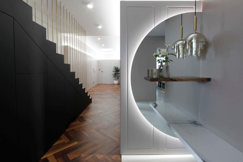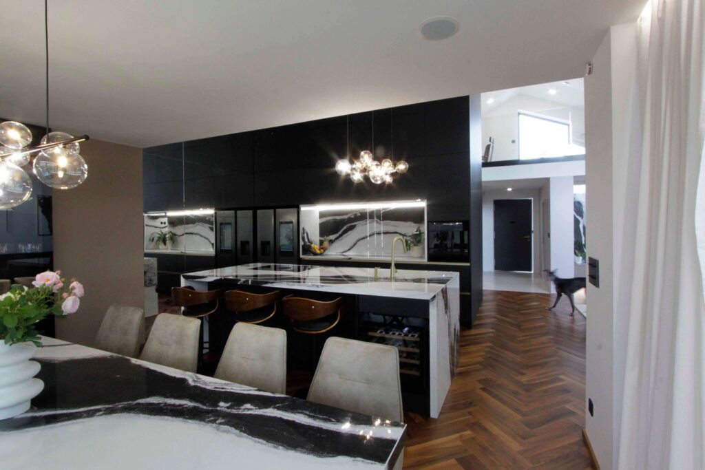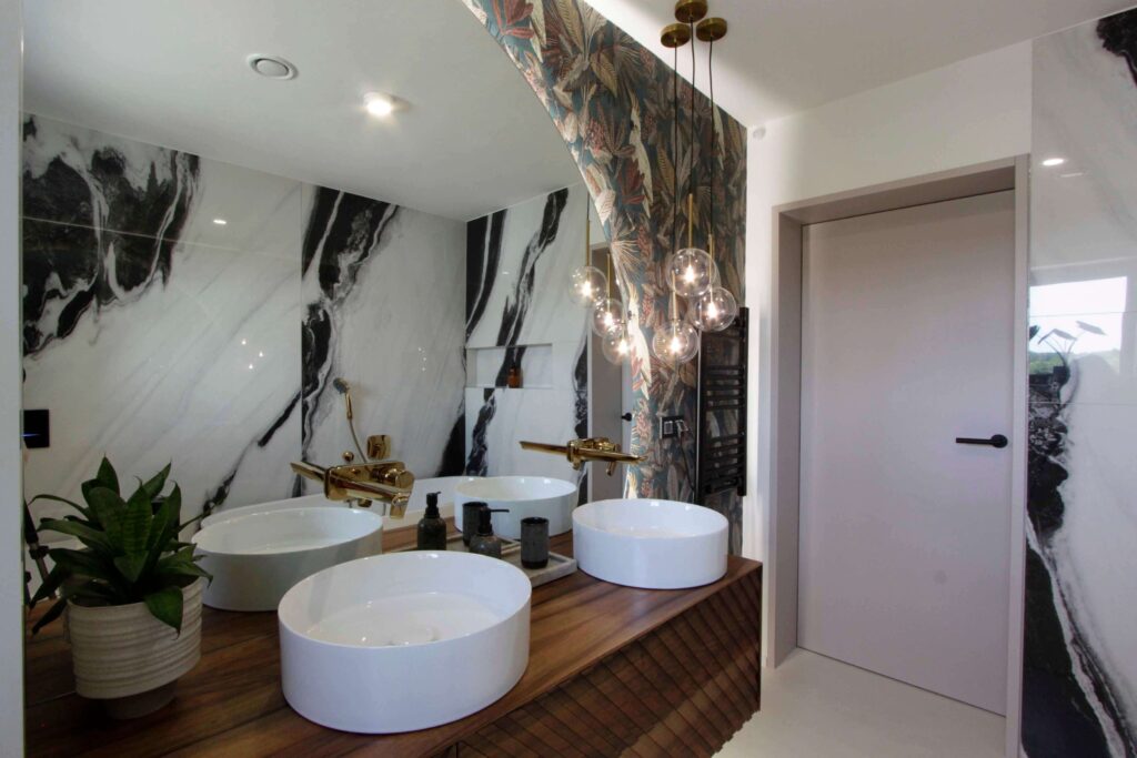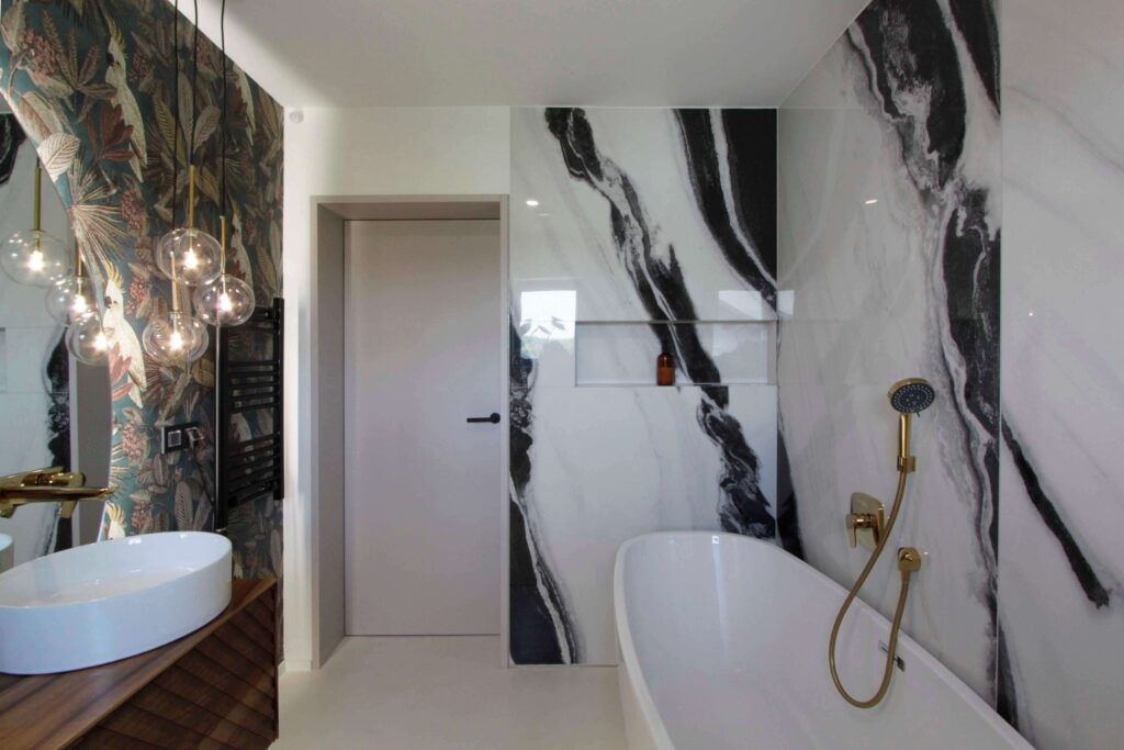 Zlatka nadaljuje: »Zlate pipe in ročaji vnašajo pridih razkošja. Na stenah sva si zaželela tapete, arhitekt pa nama je predlagal keramične ploščice z videzom črno-belega marmorja, ki so naju takoj navdušile in so prisotne po celotni hiši za enoten videz. Tudi jedilna miza, težka 450 kg, je obložena s to keramiko.«