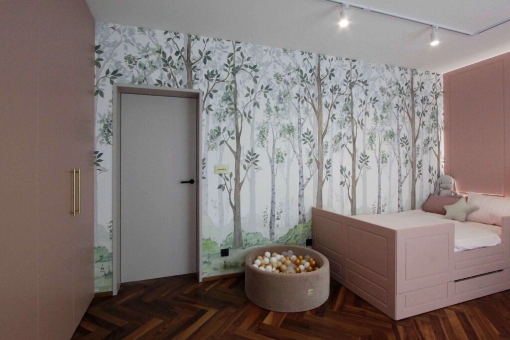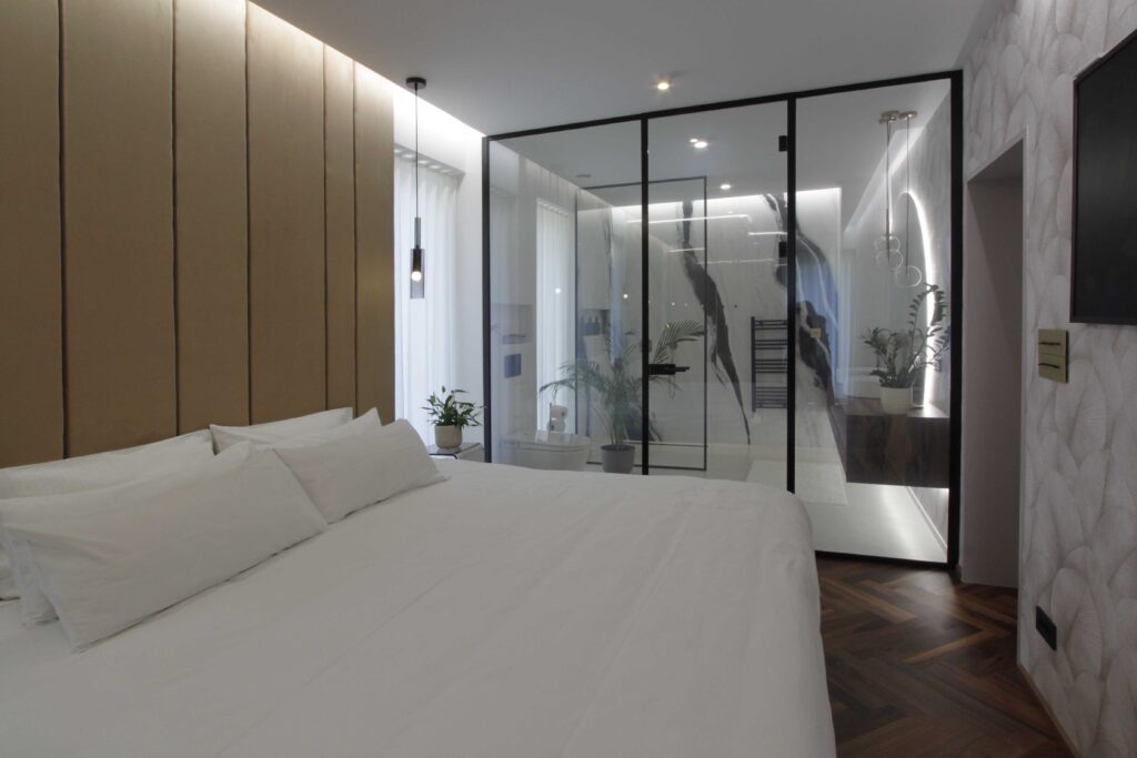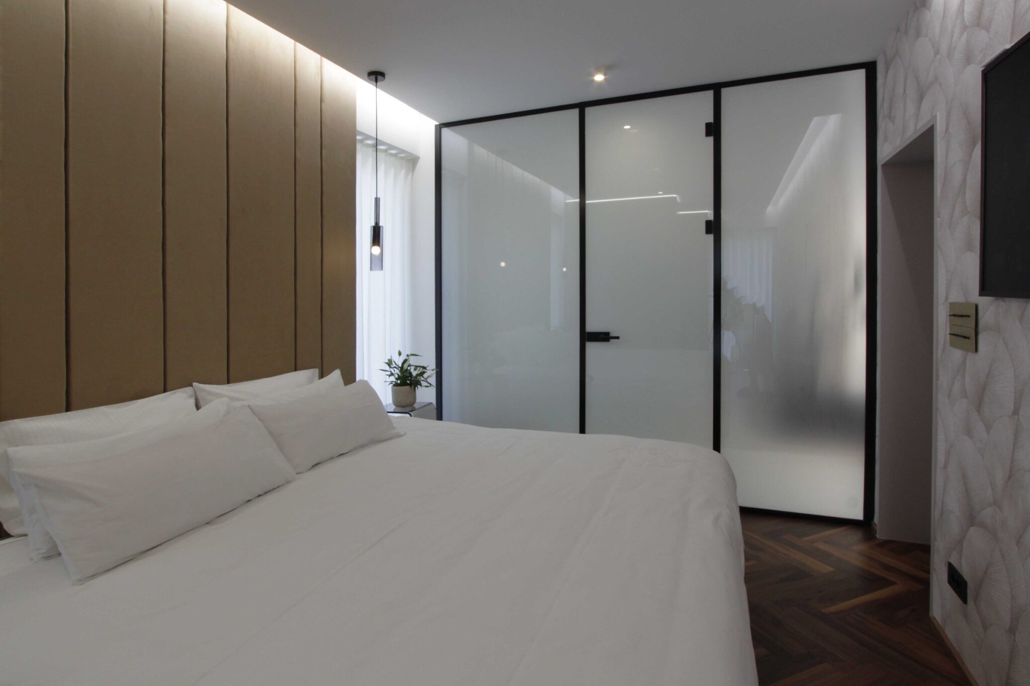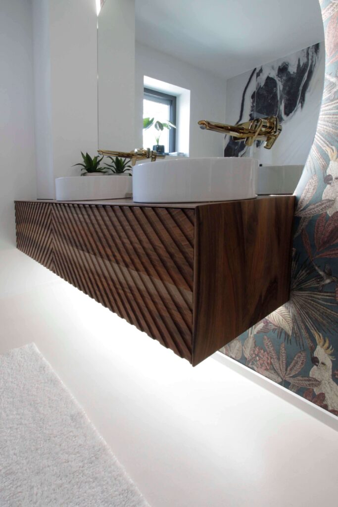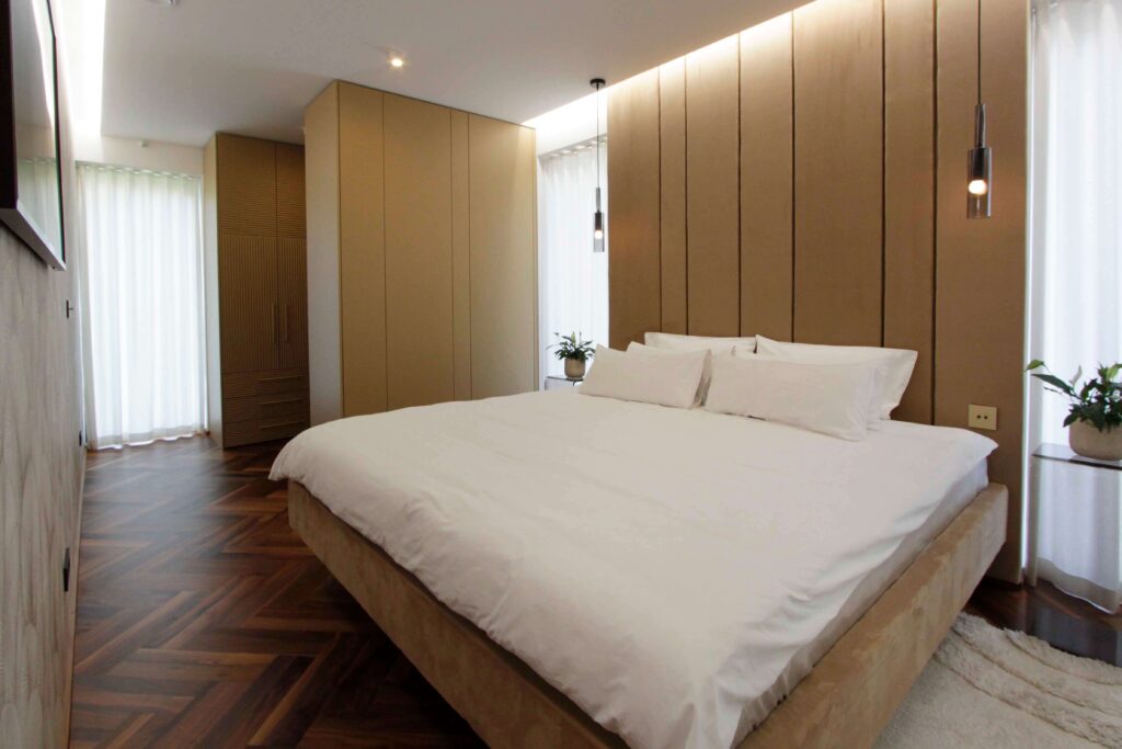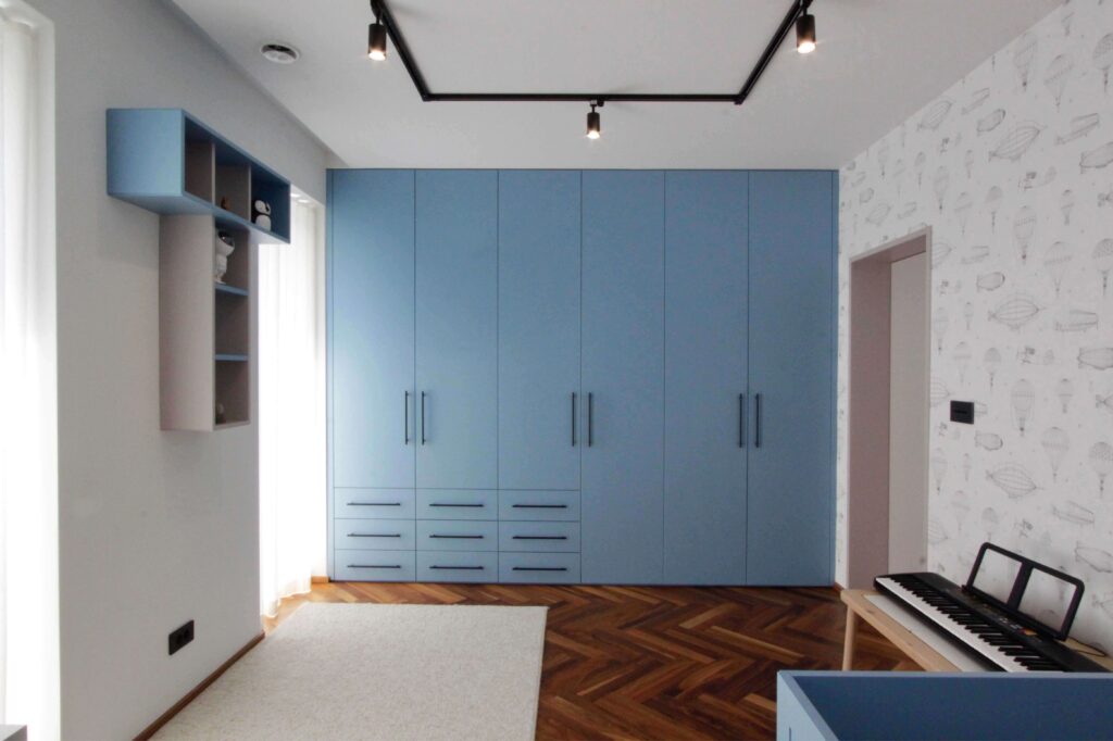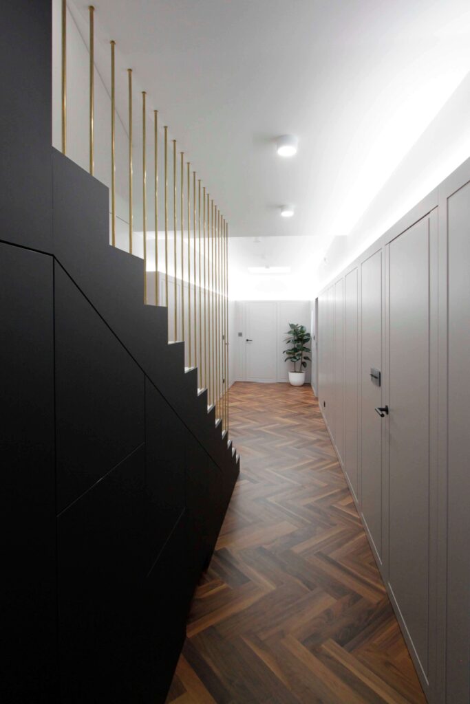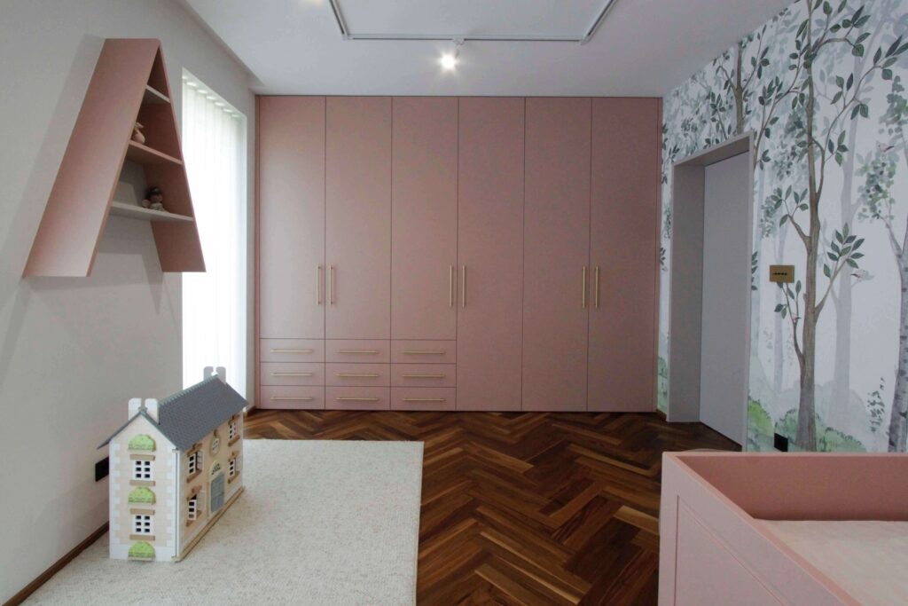 V prizidku so otroške sobe, sanitarije in spalnica z garderobo ter posebno kopalnico. »Izziv je bil združiti želje lastnikov po modernosti, staromeščanskem slogu in eleganci v vaškem okolju. Netipične rezljane stenske obloge na hodniku in v spalnem delu, mikrocement v kopalnicah ter orehov parket ustvarjajo prefinjen kontrast. Vrhunska mizarska izvedba je bila ključna za rezultat, ki združuje funkcionalnost in estetiko,« razkriva arhitekt.