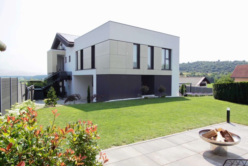 Po zaslugi odličnih organizacijskih sposobnosti lastnikov so obrtniki v samo desetih mesecih prenovili obstoječo hišo in zgradili prostoren prizidek, odet v fasadne plošče v peščenem odtenku. Ta je družini v nadstropju dodal 160 m² novega življenjskega prostora, s čimer se je bivalna površina mlade družine povečala z 90 na 250 m², medtem ko dedek in babica bivata v prenovljenem pritličju z ločenim vhodom.