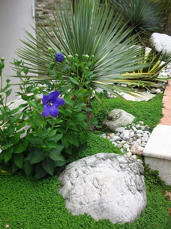 Terasasto ureditev narekuje strm breg, na katerega se trata meša z eksotičnimi rastlinami – med drugim tudi velike palme, pa juke, oljke, bugenvileja, kakteje ter obvezne pelargonije -, ki odlično uspevajo v blagem podnebju slovenskega Primorja.