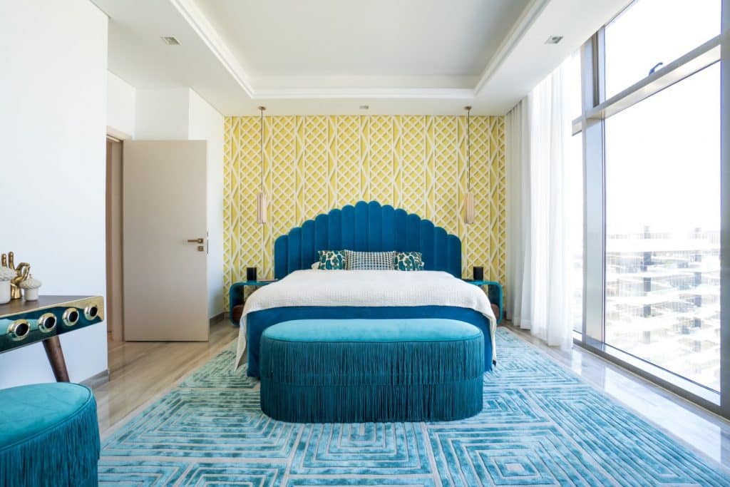 V spalnici kraljuje modra barva, ob sanjski postelji je nočna omarica Minelli v enaki barvi. V prostoru počitka za starše izstopa tudi modna mizica Monocles z lepotilnim delom in predstavlja osupljiv dodatek h glamuroznemu budoarju.
