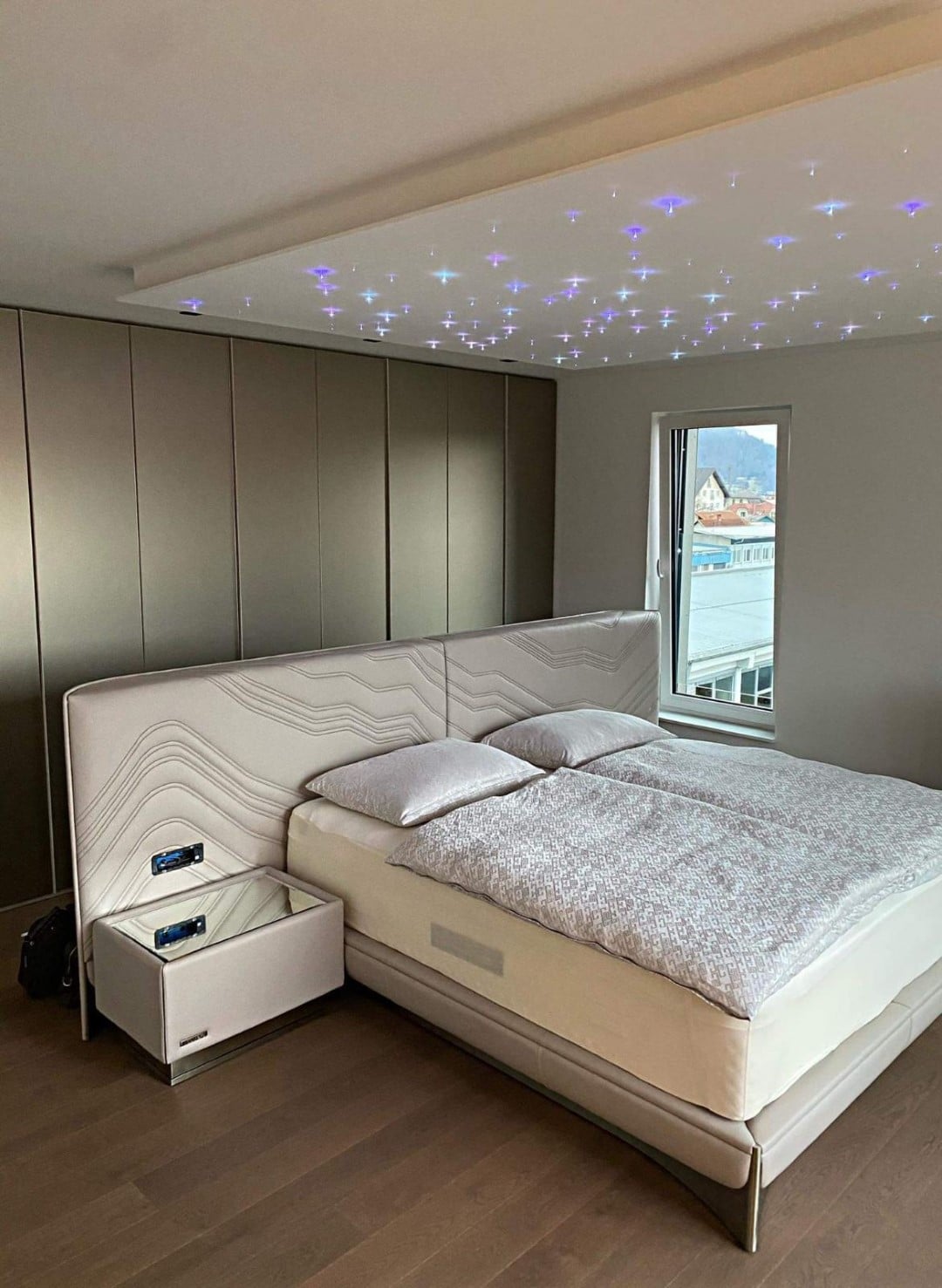 »Ja, res je. Najprej smo se odločili za tip postelje. Ker je zaobljen, je malo drugačne linije in bi bil res greh, da bi jo postavili ob steno. Zato smo se odločili, da bo osrednji del te spalnice ravno ta postelja, ki omogoči, da se hodi okoli. Zraven postelje pa smo po želji naročnika načrtovali tudi element, v katerem je skrit televizor.«