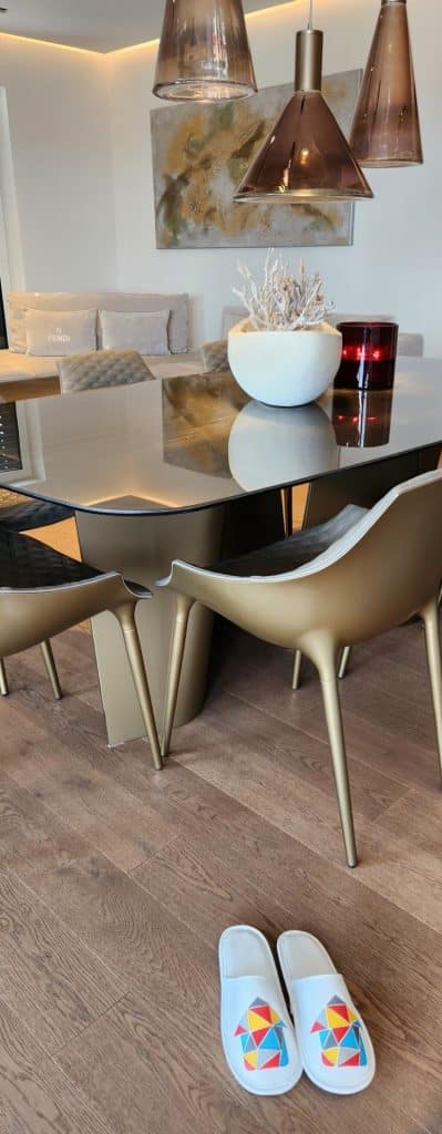 V proces opremljanja so vključili zlate poudarke, prednost pa so dali tudi prostornosti, saj lastnik rad gosti prijatelje in poslovne partnerje. V jedilnem delu kraljuje velika miza, prostor zaznamujejo trije lestenci iz muranskega stekla, podoben koncept opreme pa se nadaljuje v dnevni sobi s televizorjem, elegantno skritim za zrcalno površino.