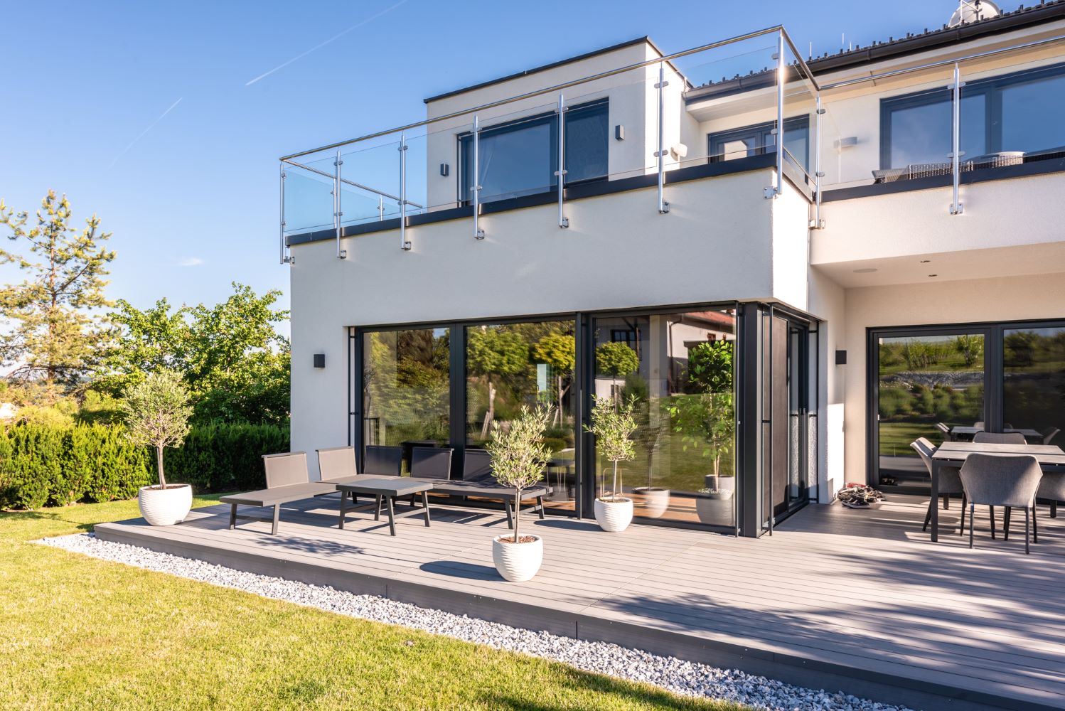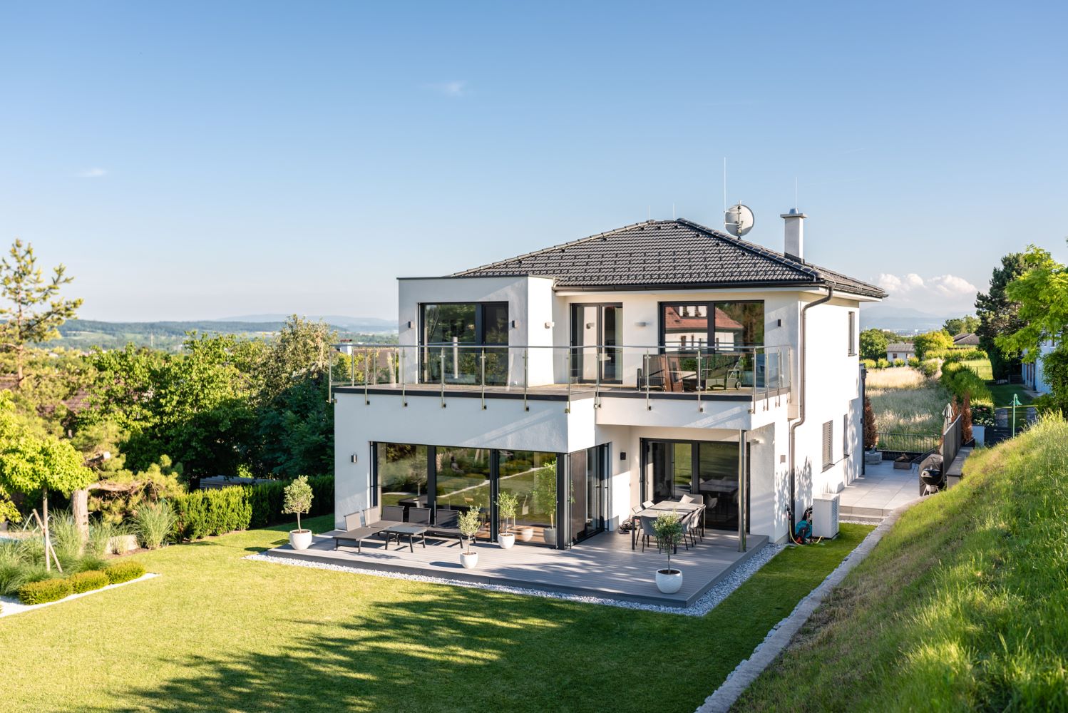 Želela sta sodobno in drzno oblikovano hišo z velikimi steklenimi površinami in odprtimi prostori – točno takšno, kot jo kot standard ponujajo v mariborskem podjetju montažnih hiš. A seveda je bilo treba arhitekturo najprej prilagoditi grajeni in kulturni krajini vasice v Spodnji Avstriji, pa tudi padajoči parceli, ki jo z dveh strani obkrožajo vinogradi.