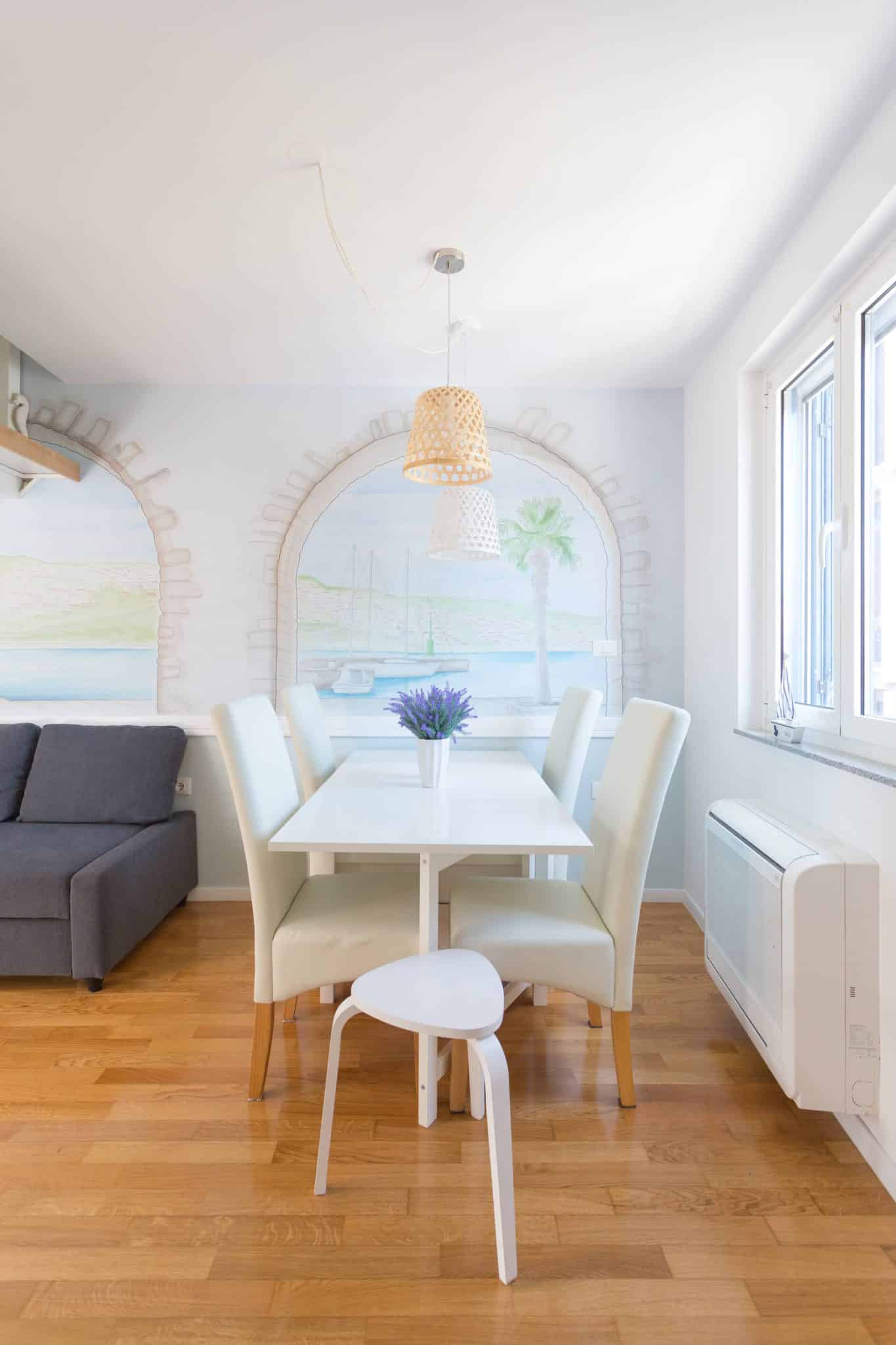 Največji adut tega prostora pa je gotovo po meri izdelana celostenska tapeta. Stanovanje z enim oknom namreč nima pogleda na morje – obrača se namreč na notranji trg starega mestnega jedra – majhen prostor pa je kar klical po optični razširitvi. Arhitektka jo je dosegla kar z naslikanim vedutnim pogledom iz Kopra proti Izoli.