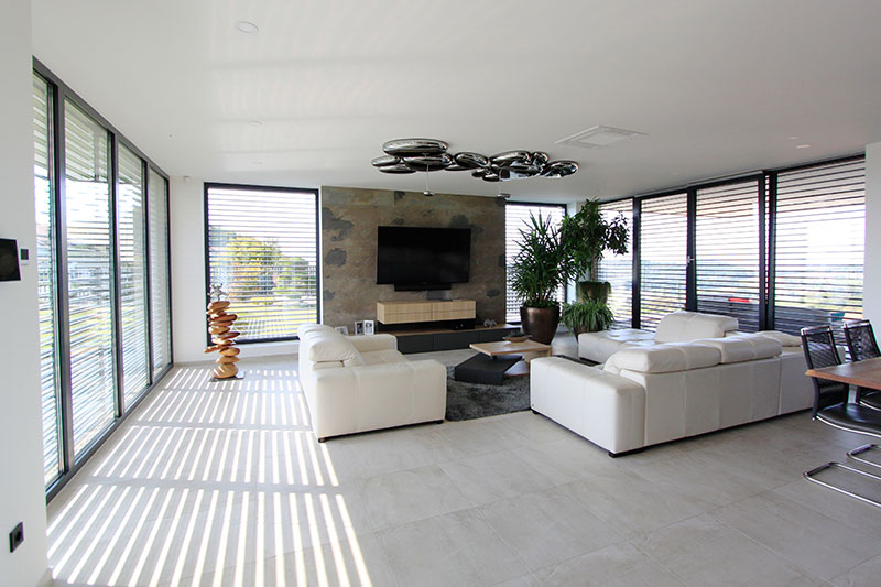 Številne izvajalce je nadzorovala kar gospodarica hiše, ki je točno vedela kaj želi. Eden izmed izvajalcev, ki je vse njene želje pretvoril v realnost, je tudi podjetje Roltek. Hiši na vetrovnem griču so namenili posebno pozornost. G. Borkovič, odgovoren za vgradnjo vseh senčil, pove: “V slovenskih domovih je bilo v preteklem času vgrajenih ogromno rolet, danes pa arhitekti snujejo domove z velikimi steklenimi površinami in panoramskimi razgledi, kar pogojuje tudi vgradnjo več žaluzijskih sistemov.” Poleg elegantnih (in na veter odpornih) žaluzij so v hišo vgradili še zunanjo roleto, ki za seboj skriva vgrajeno letno kuhinjo, ter konzolno platneno senčilo, ki v poletni pripeki senči teraso. Slednja je dovršeno skrita v fasado objekta, tako da je – ko je pospravljena – sploh ne opazimo.