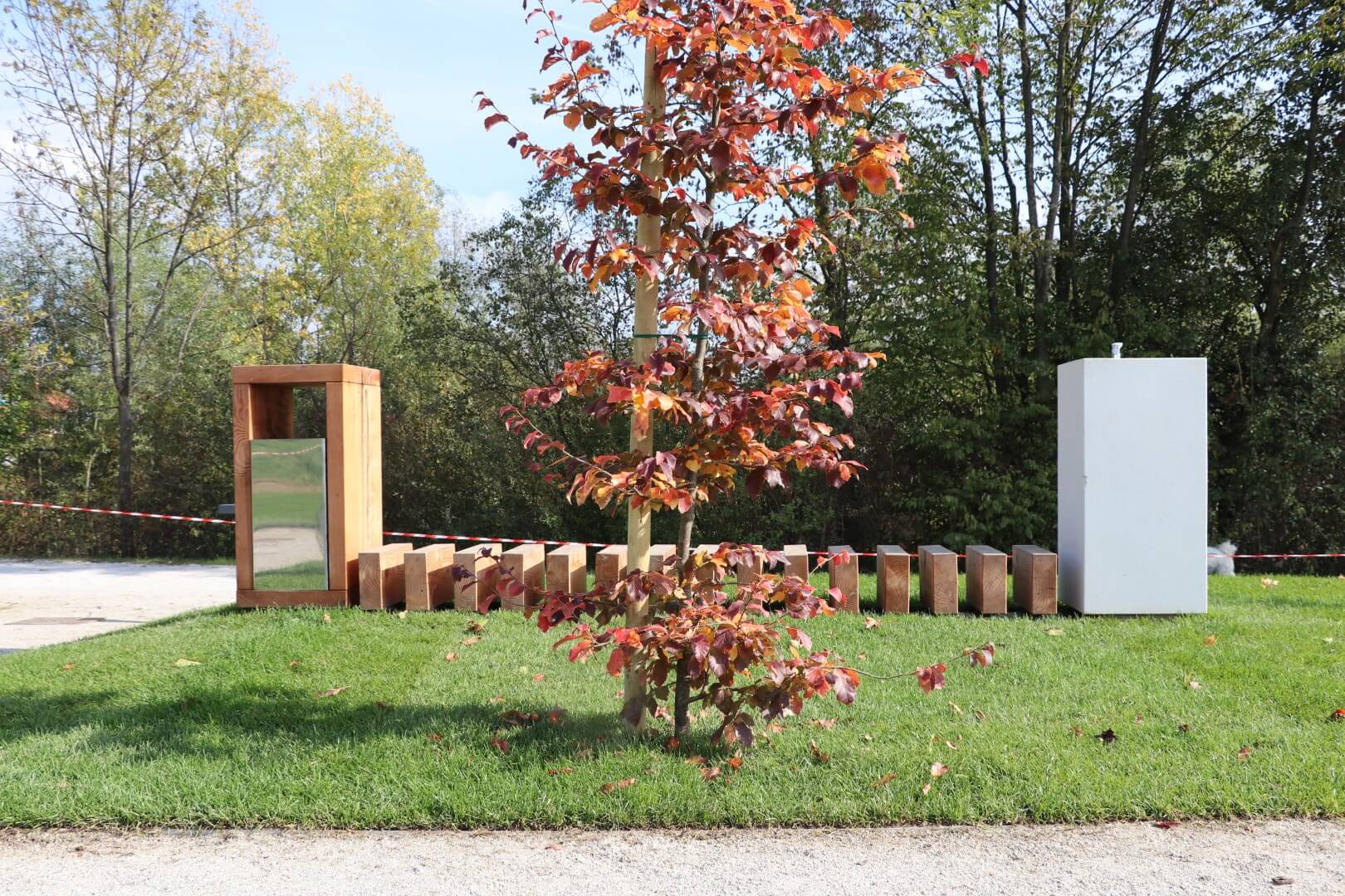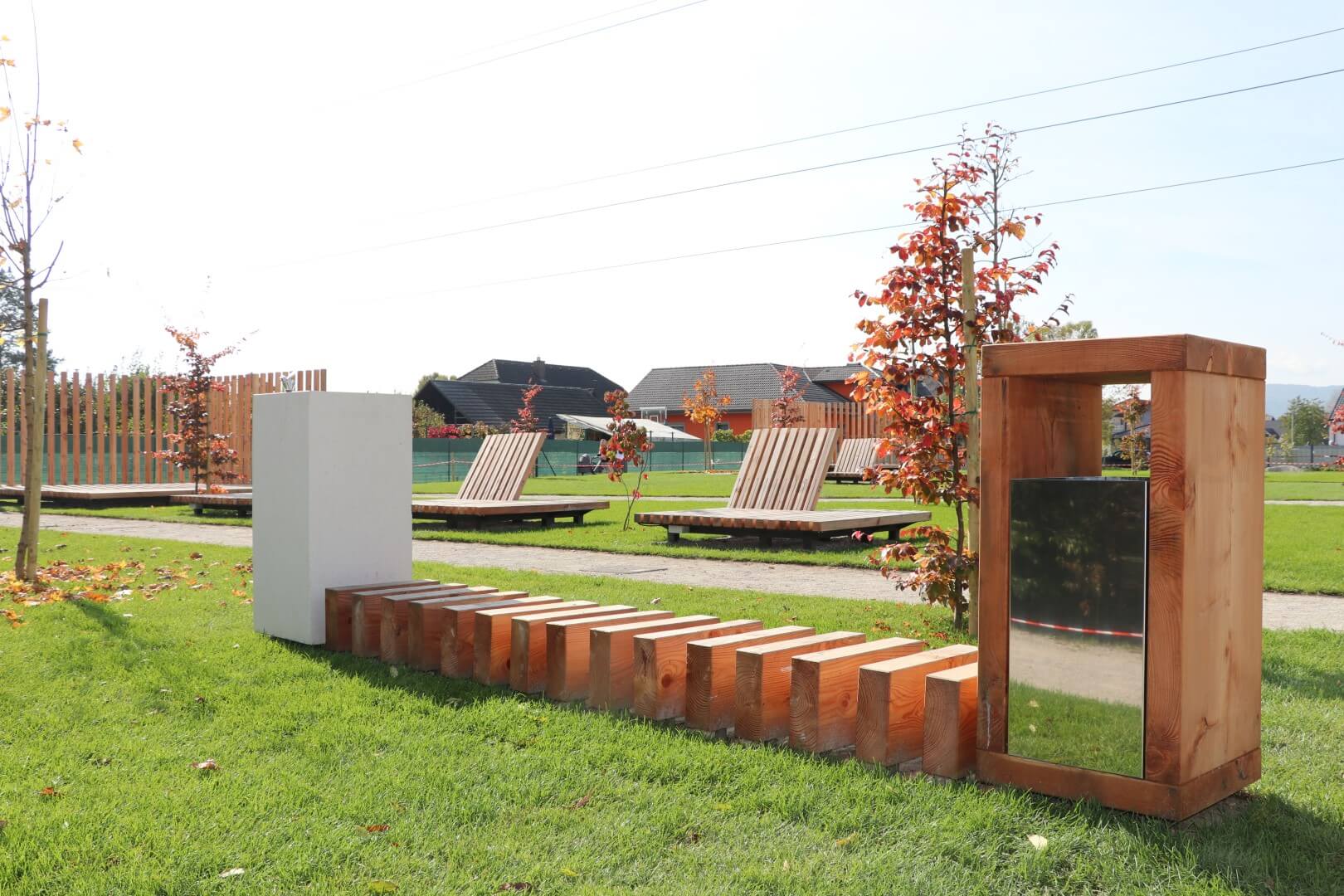 Les, iz katerega je zasnovana urbana oprema, je impregniran proti insektom in glivam, ni pa prebarvan, saj bo sčasoma naravno patiniral. S tem, ko so počivalnike in ploščadi za meditacijo dvignili nad tla in jih pritrdili na jekleno podkonstrukcijo, so lesu zagotovili dodatno zaščito.