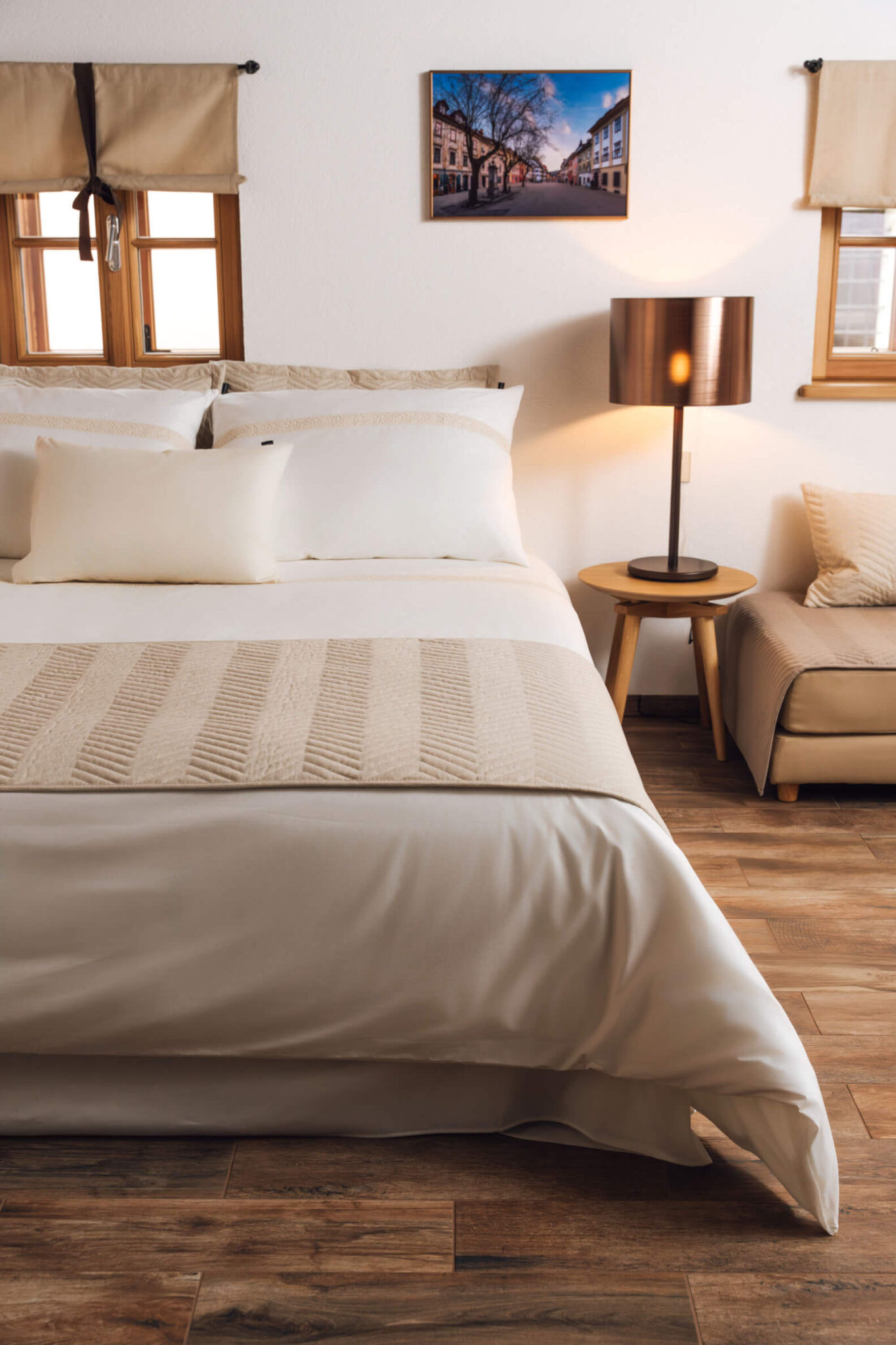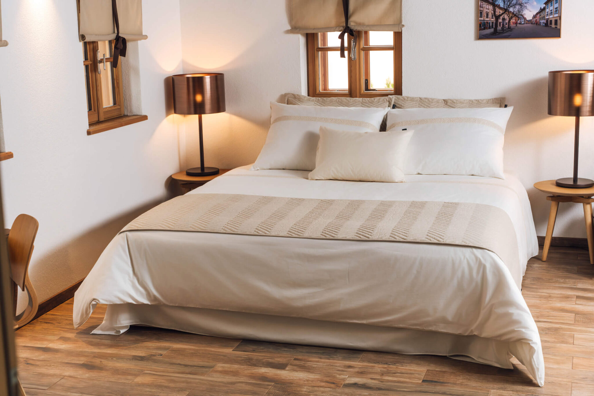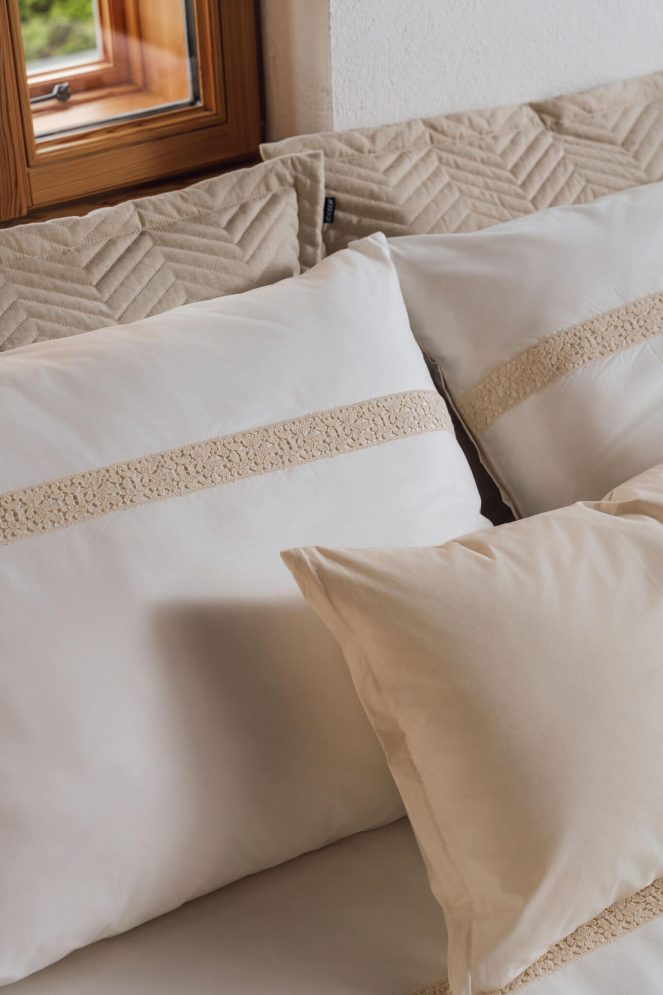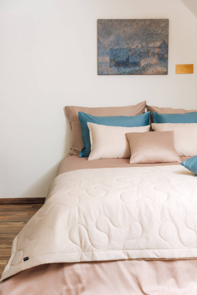 Izbrana posteljnina podjetja Odeja, ki ima v Škofji Loki že dolgoletno tradicijo, sledi estetiki hiše in okolju ter uporabniku prijaznim praksam. Izdelana je iz bombaža, lana, organskega bombaža in bombažnega satena – materialov, ki so sledljivi, certificirani in preizkušeni po najvišjih standardih kakovosti.