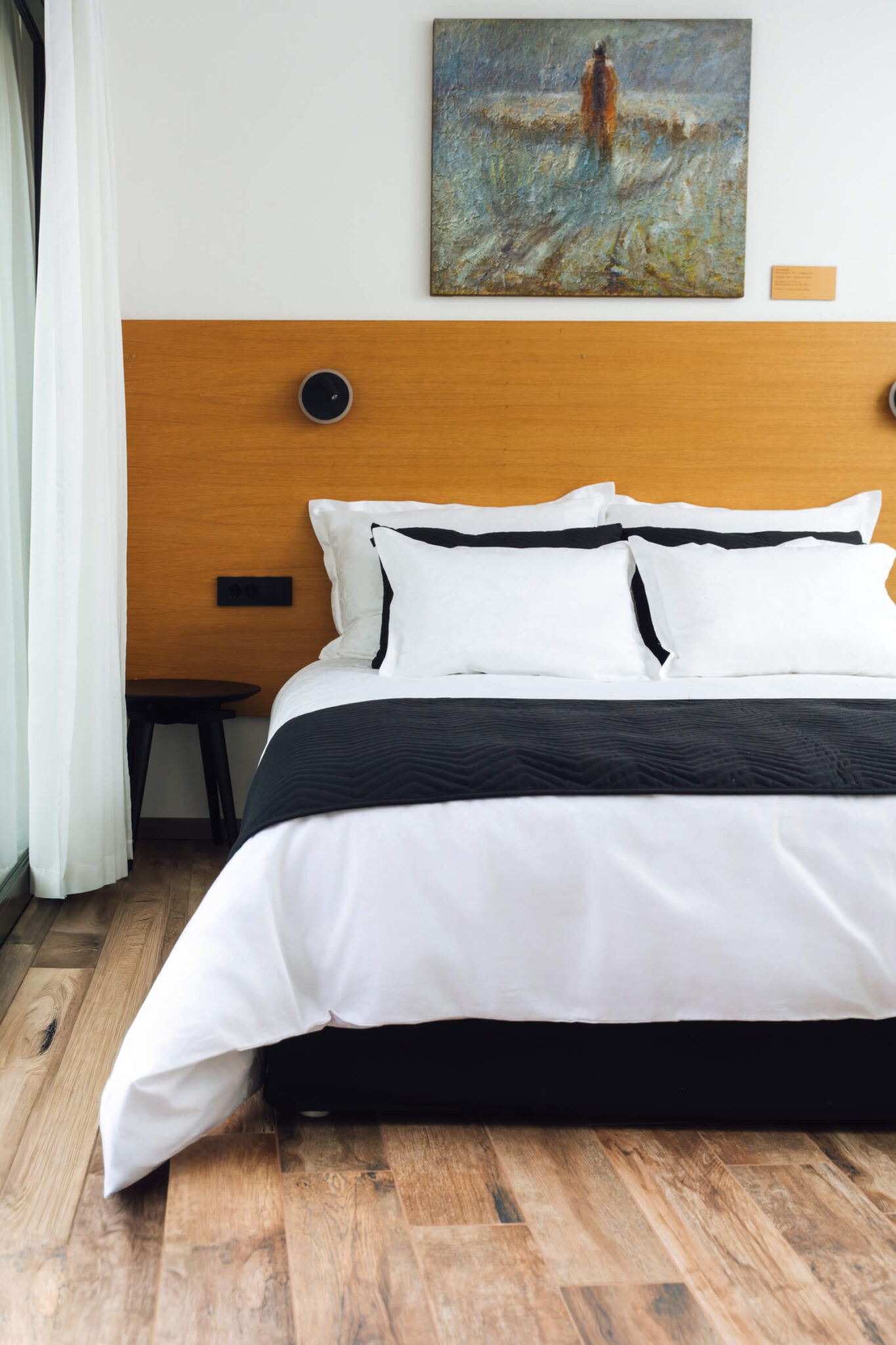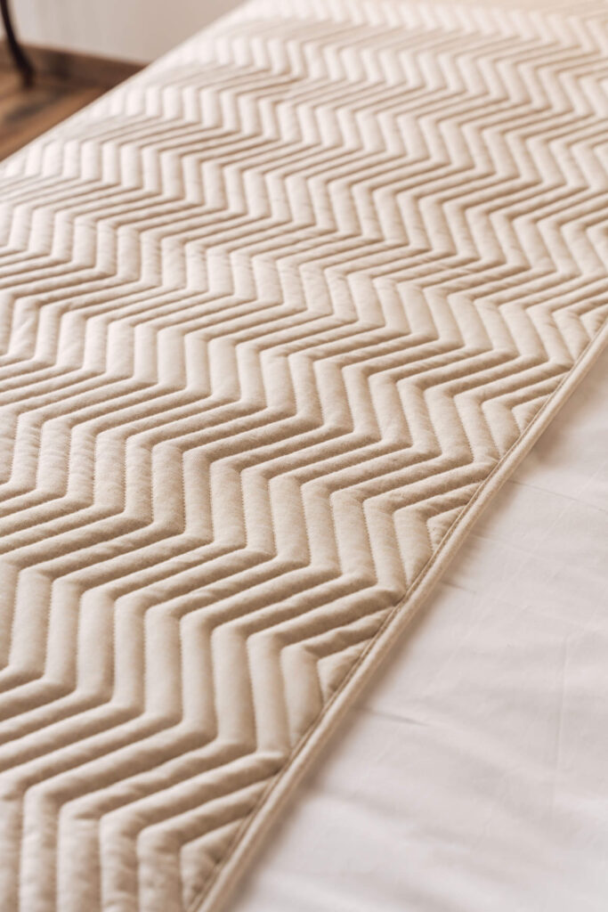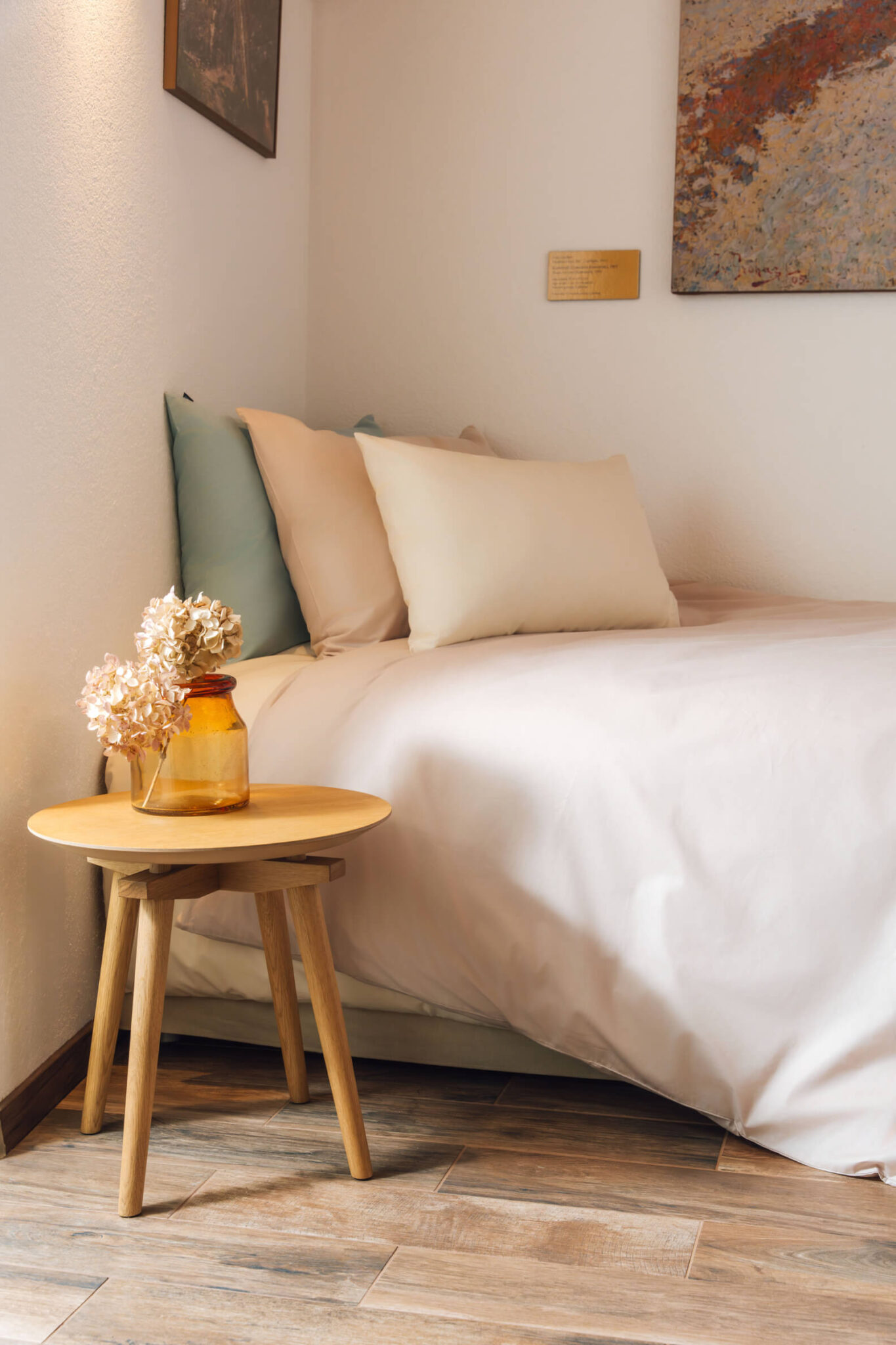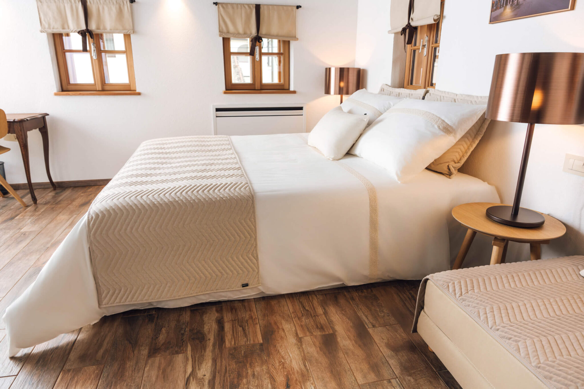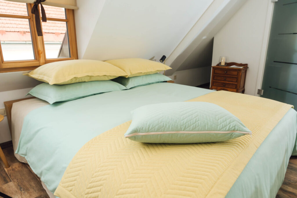 Izbrana posteljnina podjetja Odeja, ki ima v Škofji Loki že dolgoletno tradicijo, sledi estetiki hiše in okolju ter uporabniku prijaznim praksam. Izdelana je iz bombaža, lana, organskega bombaža in bombažnega satena – materialov, ki so sledljivi, certificirani in preizkušeni po najvišjih standardih kakovosti.