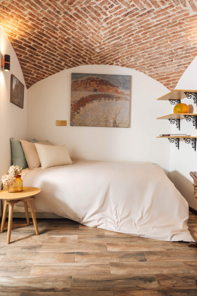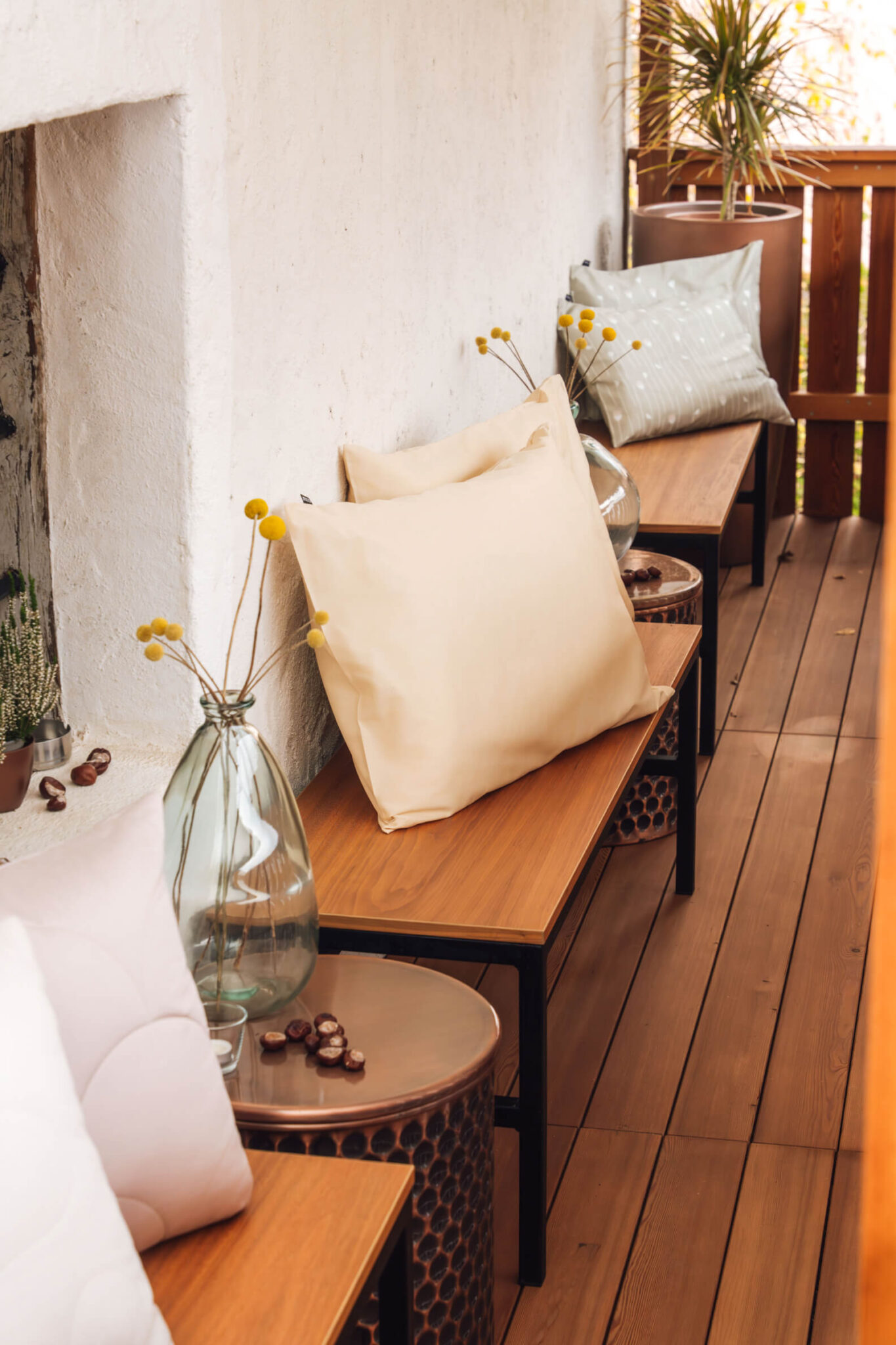 Posteljnina Tara iz organskega bombaža z nežno čipko zadiha v prostoru kot tiha obljuba mirnih noči. Na postelji jo dopolni laneni tekač v naravnem odtenku, ki vnaša mehkobo preprostosti in lanene prevleke na vzglavnikih – vsi laneni izdelki so iz prihajajoče kolekcije Rustika, ki bo narekovala nove trende v prihajajočem letu.