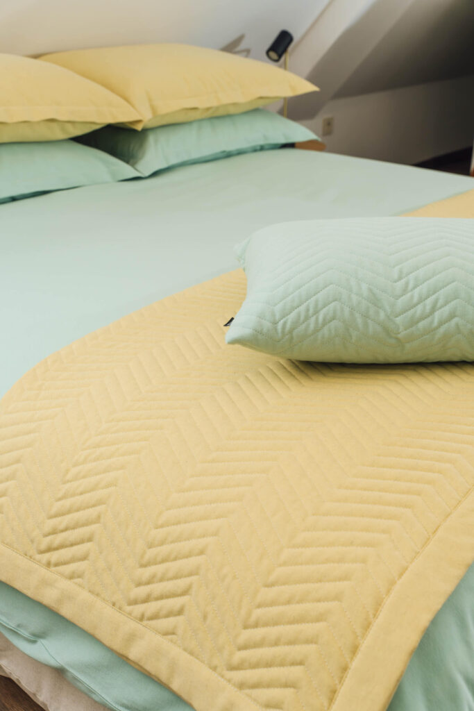 Lanena posteljnina v pastelno zeleni barvi iz kolekcije Rustika v prostor vnese občutek spokojne, naravne svežine. Ob njej zasije svetlo rumeno pregrinjalo z geometrijskim vzorcem ribje kosti, ki skupaj z ujemajočimi prevlekami za vzglavnike doda pridih ročne dovršenosti. Kolekcija Rustika, ki izide v začetku naslednjega leta.