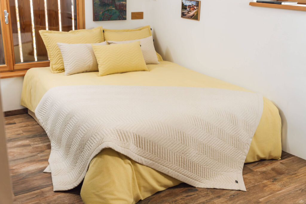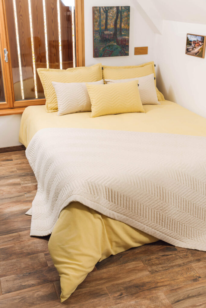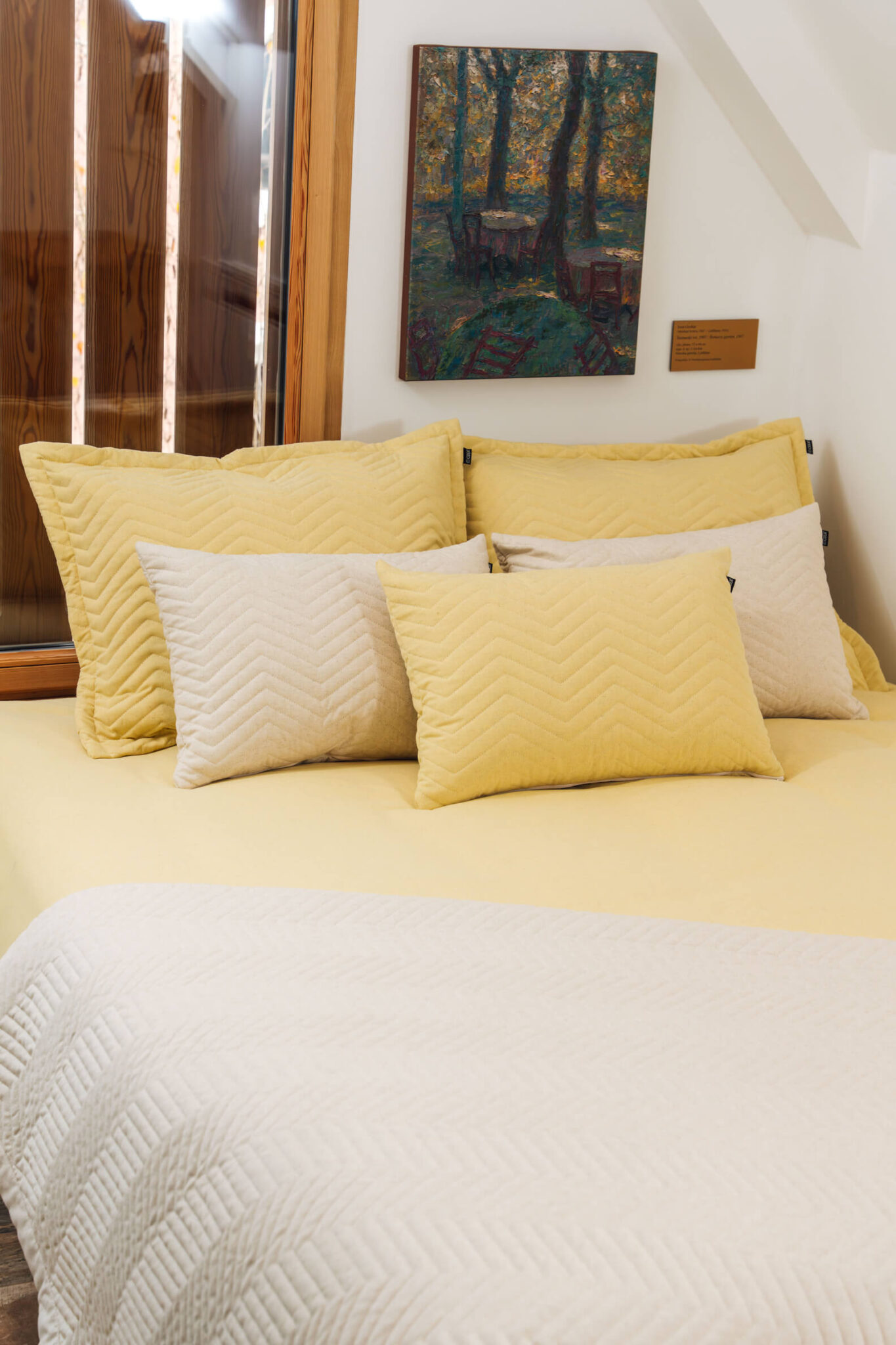 Lanena posteljnina v svetlo rumeni barvi iz kolekcije Rustika v spalnico prinaša žarek sončne mehkobe in naravne lahkotnosti. Na postelji jo nežno objame okrasno pregrinjalo v naravnem odtenku, ki poudari toplino lanenih vlaken in prevleke za vzglavnike, prav tako del kolekcije Rustika.