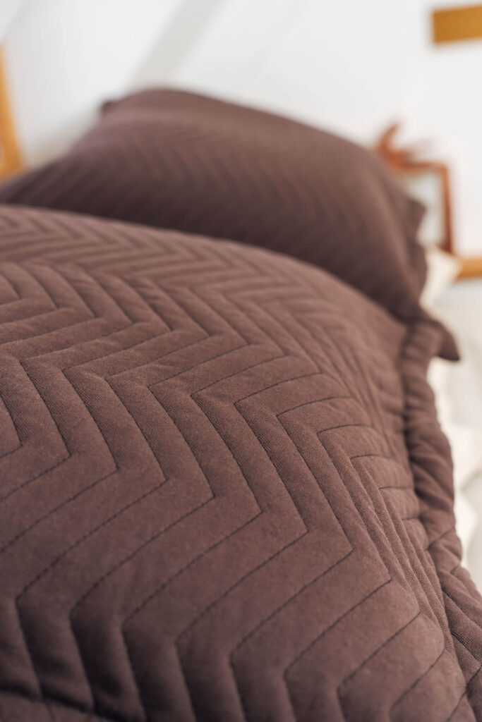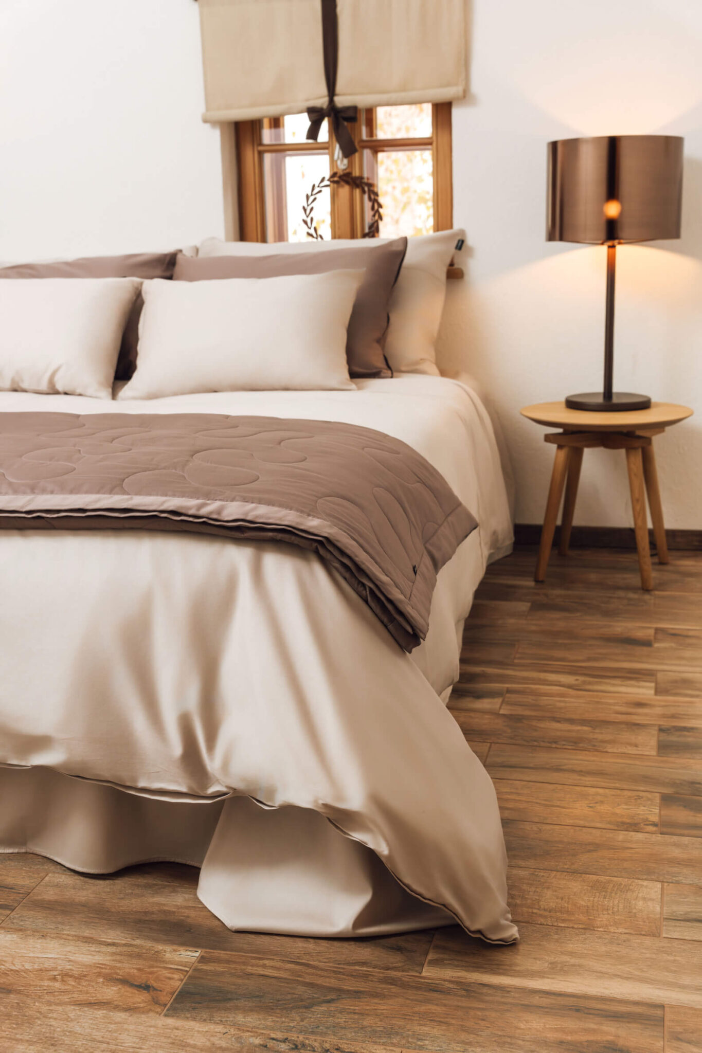Posteljnina Basic iz bombažnega satena v srebrno sivi barvi zažari kot nežna mesečina, ki objame posteljo v svilnatem sijaju. Dopolnjuje jo pregrinjalo Bali v globoki temno rjavi, ki prostoru doda toplino in prijetno razkošje. V ozadju se umirjeno zlivajo temno rjave prevleke za vzglavnike, ki zaokrožijo harmonijo spalnice.