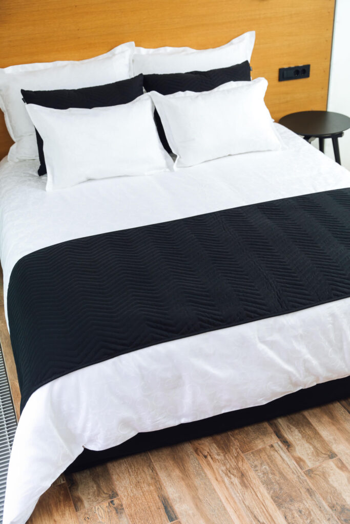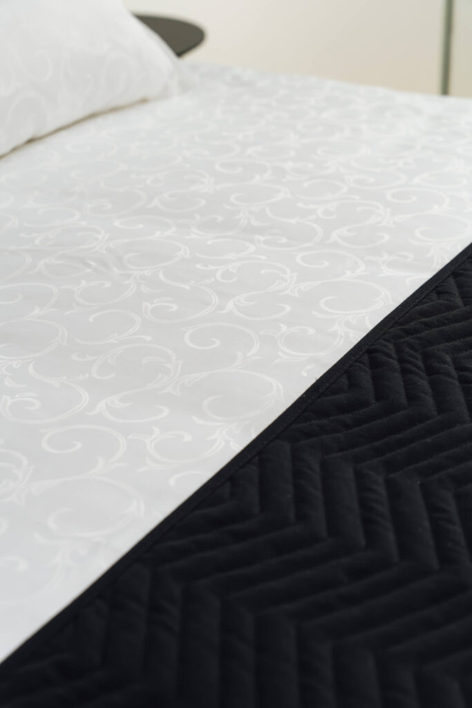 Bela posteljnina iz žakardne tkanine s cvetličnimi vzorci daje postelji čist in urejen videz. Na sredini jo dopolnjuje lanen tekač v črni barvi, v ozadju pa ujemajoče črne prevleke za vzglavnike, ki celoten videz lepo povežejo.