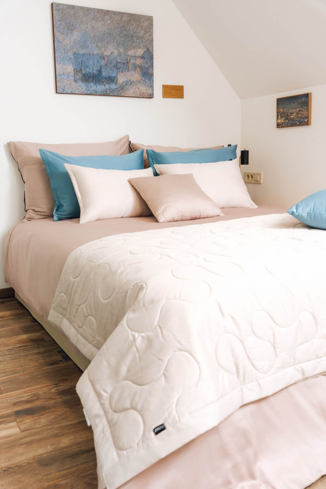 Posteljnina Basic iz bombažnega satena v svetlo rjavi barvi objame prostor s toplino nežne zemlje. Dopolnjuje jo pregrinjalo Bali v mehkem vanilijevem odtenku, medtem ko se v ozadju skladno vrstijo ujemajoče prevleke za vzglavnike. Na postelji zasije še okrasni vzglavnik Bali in svetlo modre prevleke, ki kot svež vetrič prinesejo lahkotnost in spokojnost.
